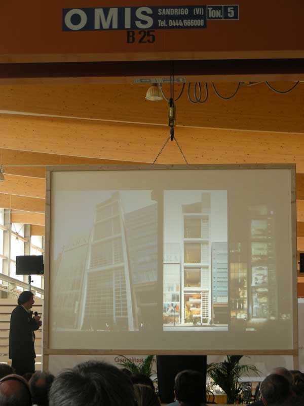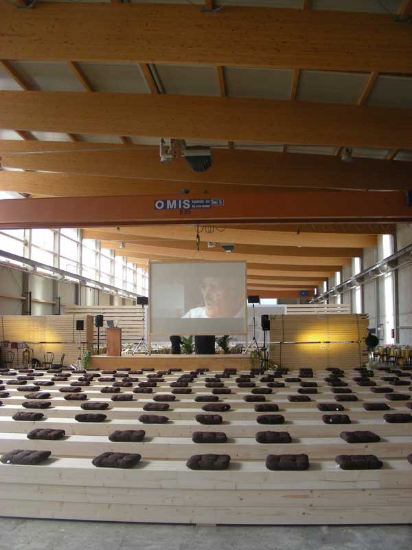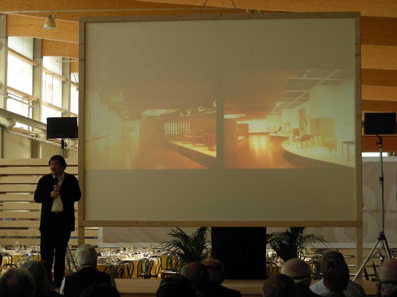 Una giornata di festa dal programma intenso ed interessante. Sul palco allestito all'interno dello stabilimento si sono succeduti Reinhold Messner e Shigeru Ban, l'architetto giapponese noto a livello internazionale per la sua rigorosa ricerca sui materiali poveri e riciclabili, che ha sviluppato un intervento sul legno in architettura declinato nei diversi progetti realizzati, tra cui quelli relativi alle strutture d'emergenza.
