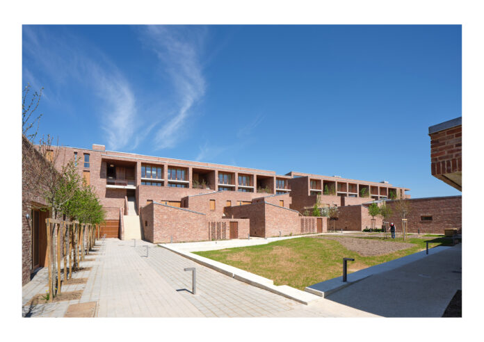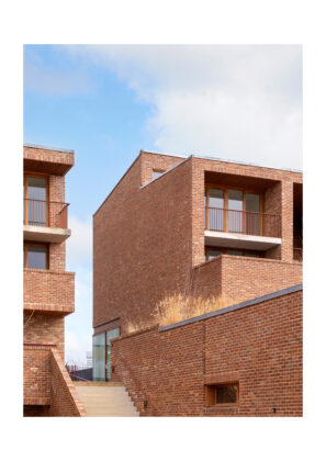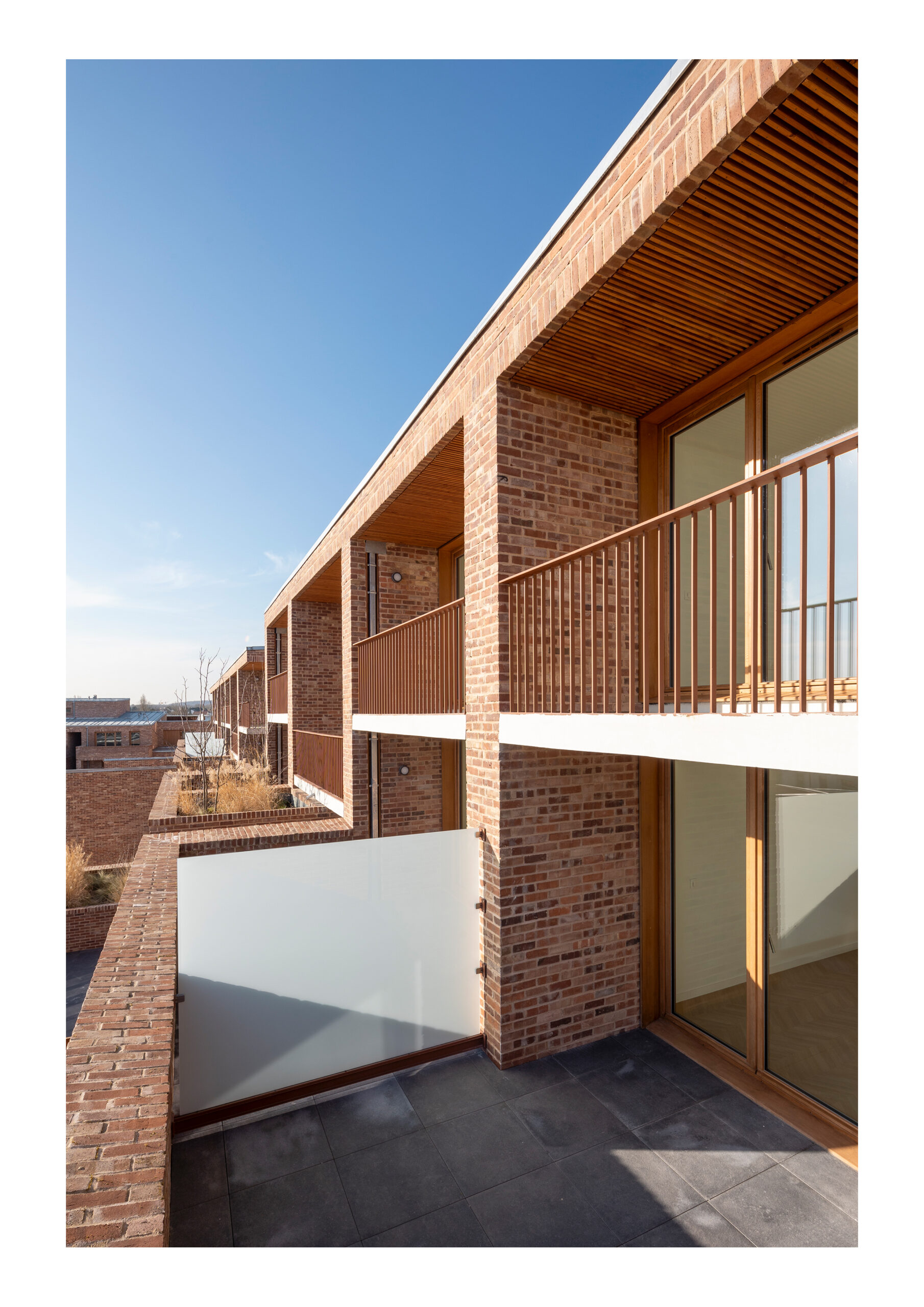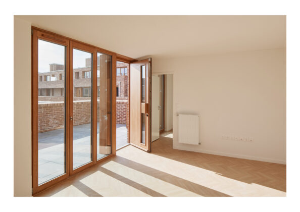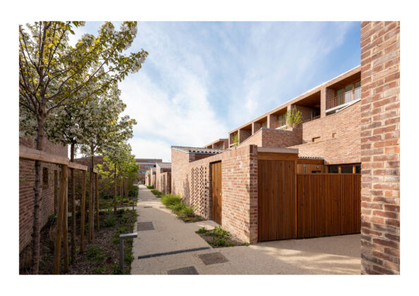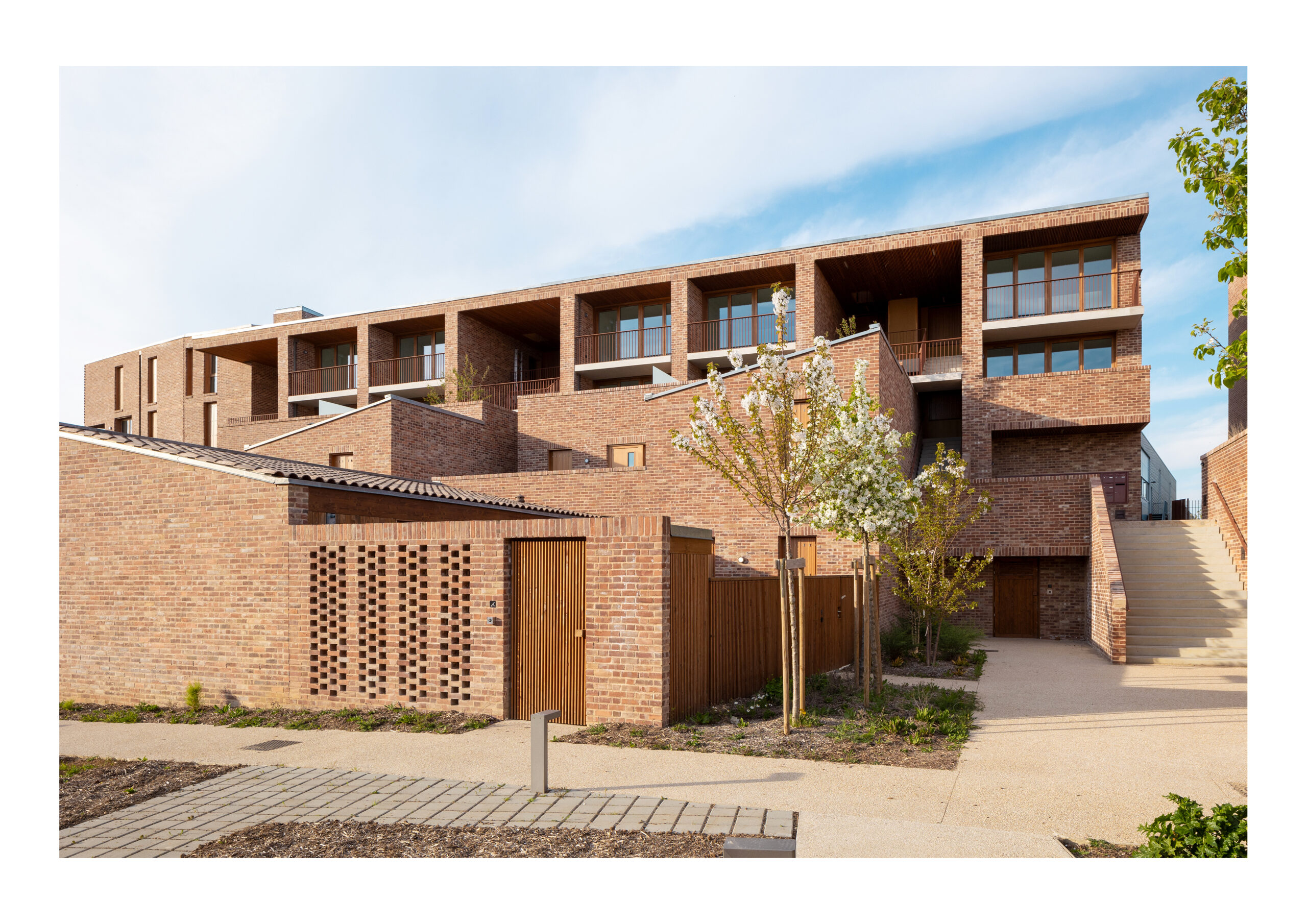Dal punto di vista materico e costruttivo, il progetto di Arpajon adotta un linguaggio volutamente sobrio e riconoscibile, affidato all’uso esclusivo del laterizio: murature in mattoni pieni color rosso-ocra e coperture in tegole definiscono un’immagine domestica e durabile, radicata nella tradizione costruttiva. La struttura primaria è in calcestruzzo, mentre l’involucro è composto da una parete composita con isolamento diffuso e controparete esterna in laterizio; per le case a piano terra si impiegano strutture lignee e rivestimenti in legno di Douglas verso i giardini. Finestre in rovere, carpenterie metalliche leggere e una cura artigianale del dettaglio concorrono a riaffermare la qualità architettonica dell’edilizia sociale.