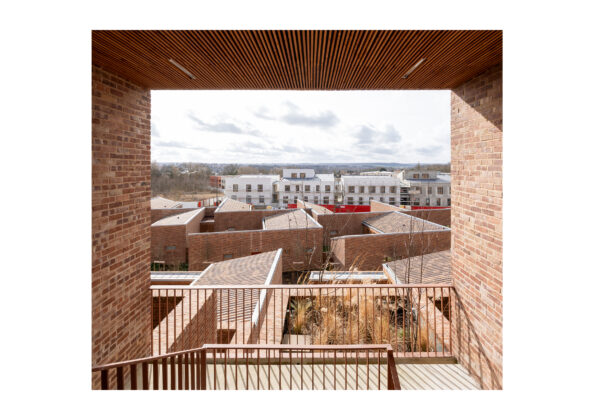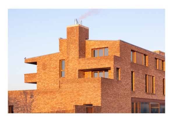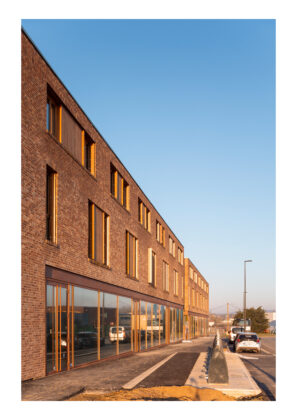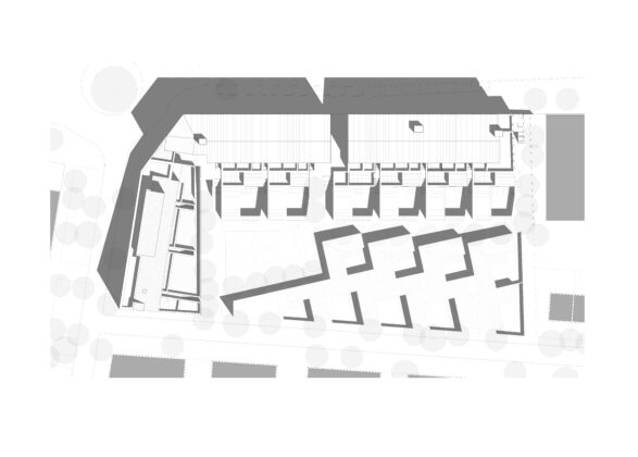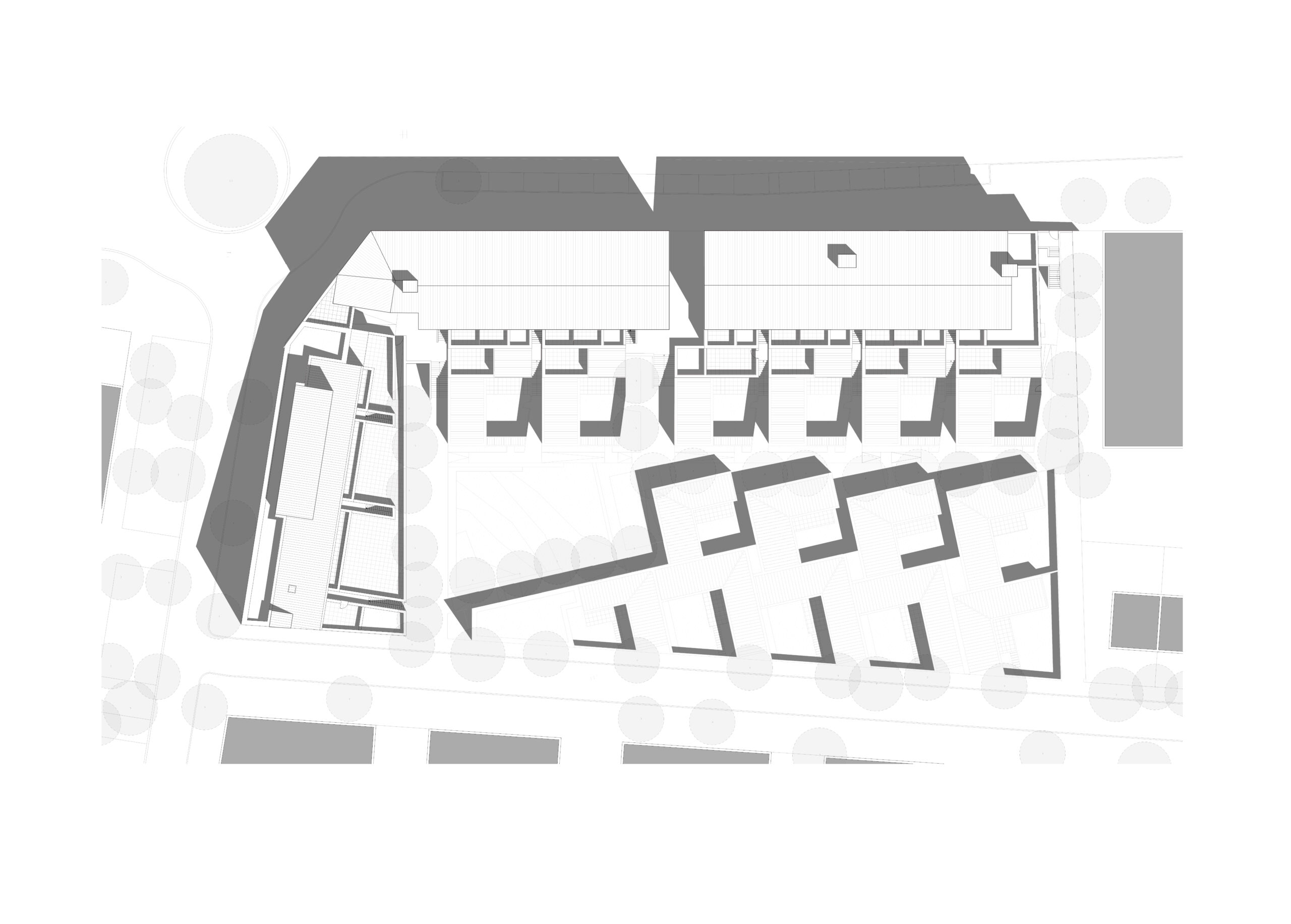 L’intero complesso si presenta come un organismo unitario ma fortemente articolato, in cui i volumi si sovrappongono, si incastrano e si gerarchizzano, garantendo a ciascuna unità una chiara identità all’interno del sistema complessivo. La bassa altezza degli edifici enfatizza una dimensione orizzontale, in sintonia con il contesto ancora poco densificato e con la presenza visiva del paesaggio collinare circostante.