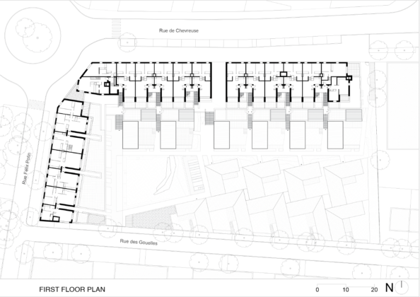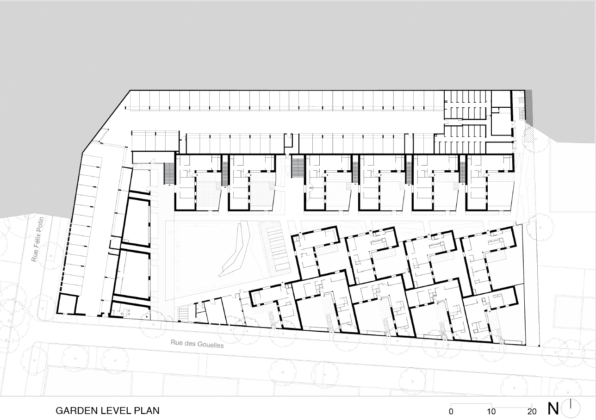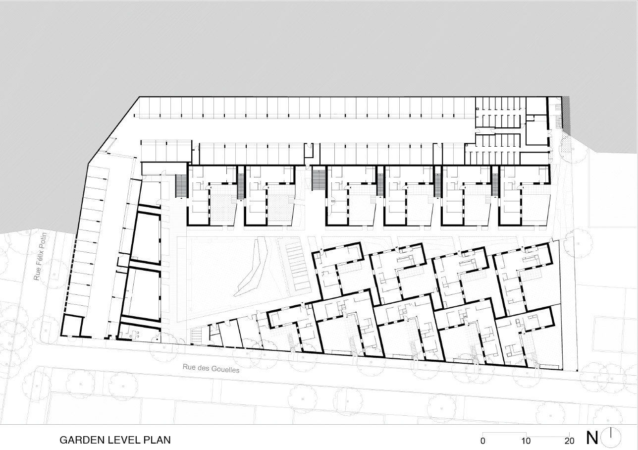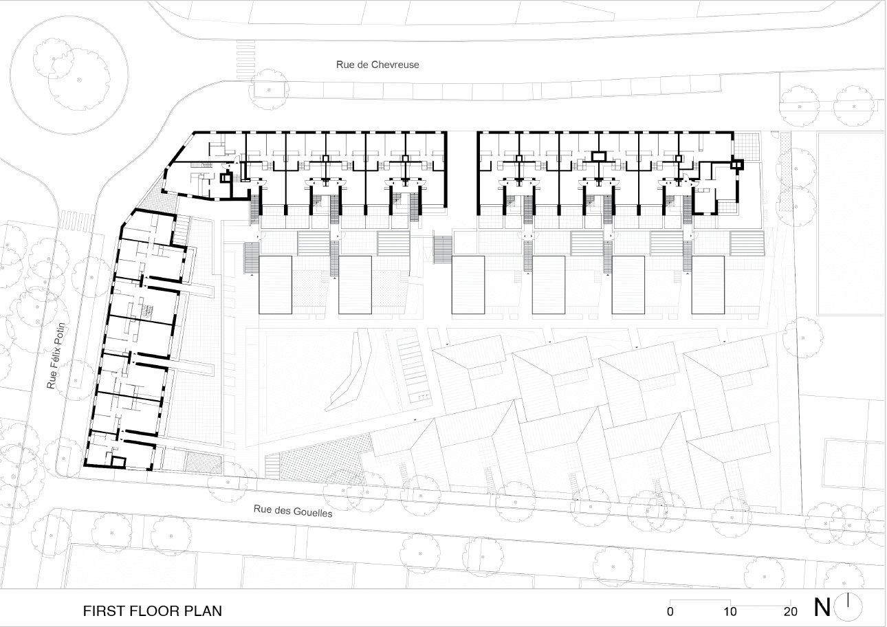 Il masterplan costruisce un forte “interno urbano”, chiaramente definito dagli edifici che si allineano lungo le tre strade perimetrali, mentre il cuore dell’isolato è occupato da uno spazio condiviso composto da un giardino centrale e da percorsi di distribuzione all’aperto. A nord, lungo rue de Chevreuse, due edifici principali ospitano 28 duplex sfalsati su più livelli, organizzati sopra un basamento commerciale. Questa tipologia, oggi raramente adottata, consente una notevole fluidità spaziale interna e una distribuzione estremamente efficiente, eliminando corridoi e spazi comuni chiusi a favore di pianerottoli e scale esterne.