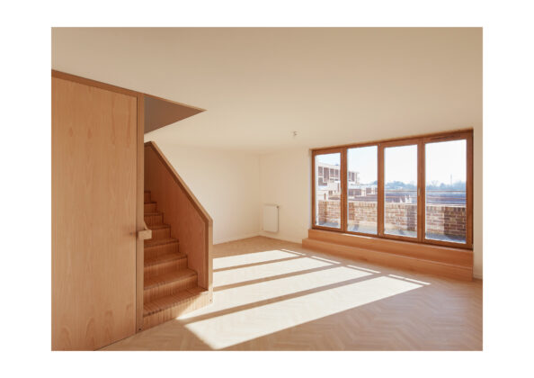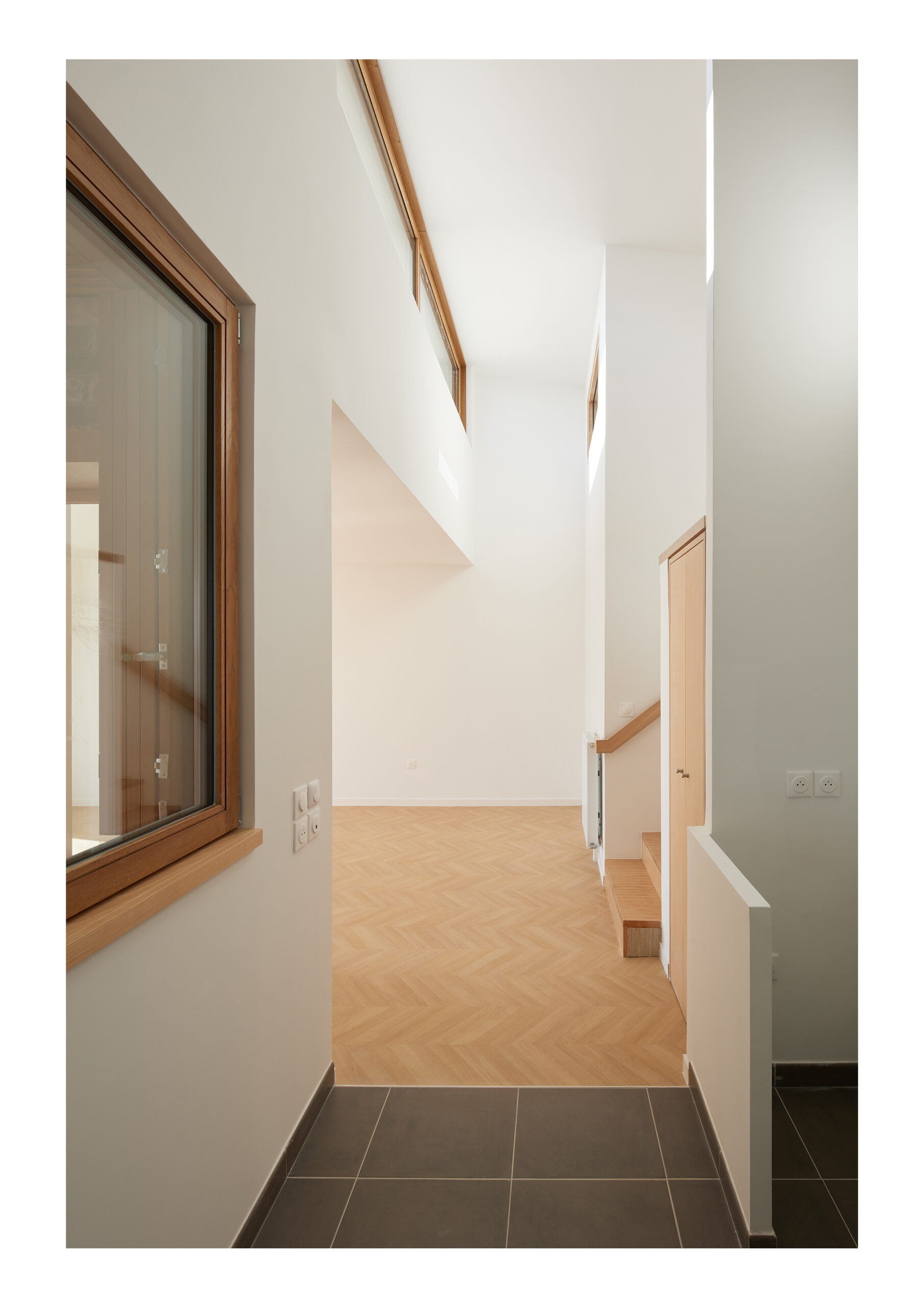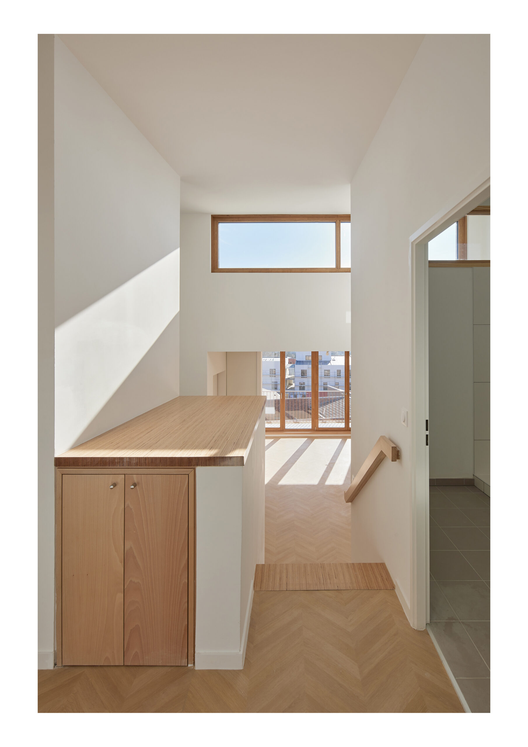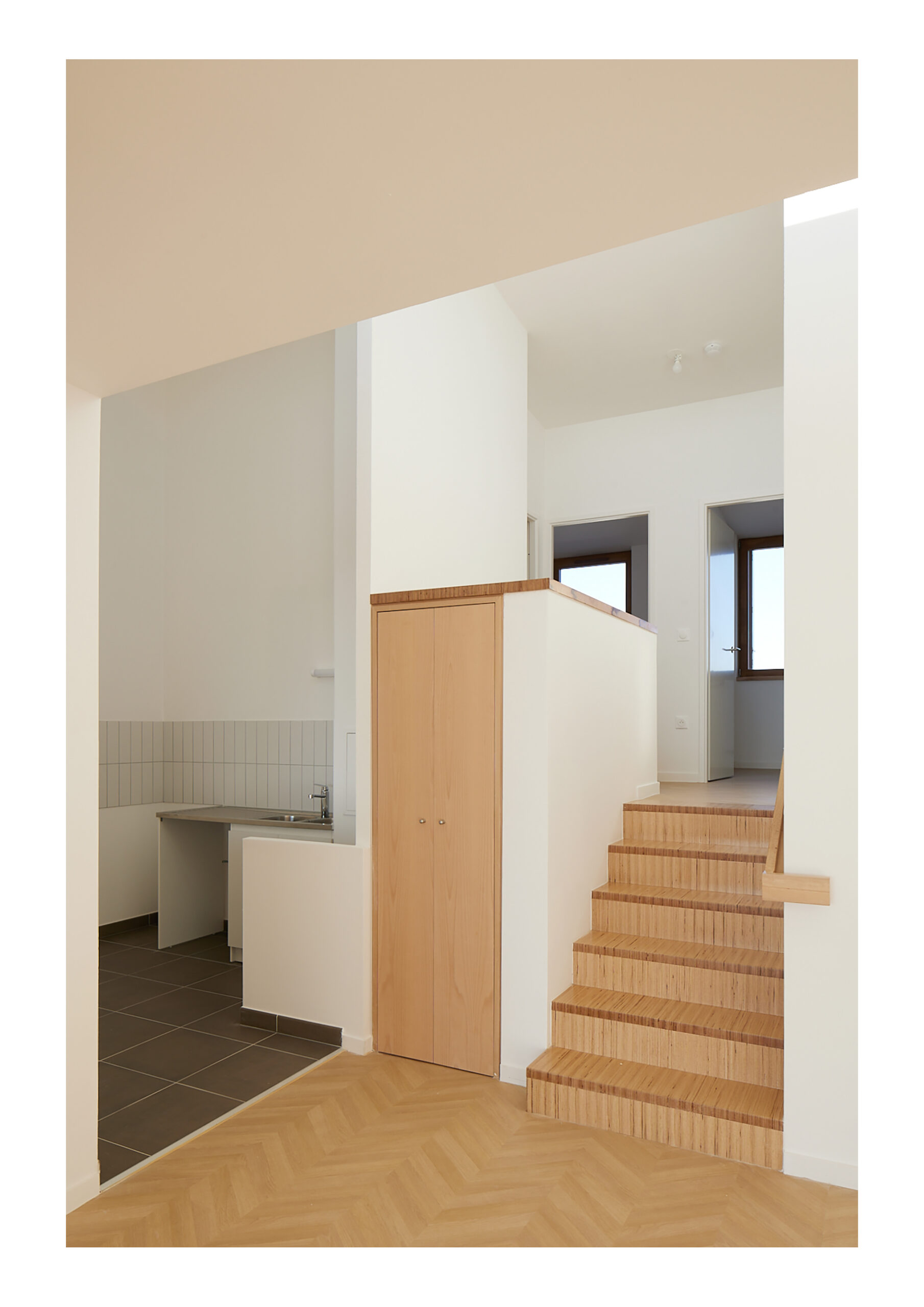 Il masterplan costruisce un forte “interno urbano”, chiaramente definito dagli edifici che si allineano lungo le tre strade perimetrali, mentre il cuore dell’isolato è occupato da uno spazio condiviso composto da un giardino centrale e da percorsi di distribuzione all’aperto. A nord, lungo rue de Chevreuse, due edifici principali ospitano 28 duplex sfalsati su più livelli, organizzati sopra un basamento commerciale. Questa tipologia, oggi raramente adottata, consente una notevole fluidità spaziale interna e una distribuzione estremamente efficiente, eliminando corridoi e spazi comuni chiusi a favore di pianerottoli e scale esterne.