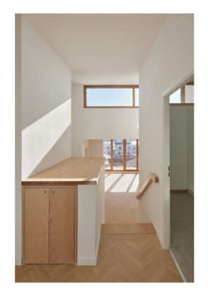 Il progetto integra inoltre strategie ambientali avanzate: isolamento in lana di legno, serramenti a triplo vetro, impianto di riscaldamento e produzione di acqua calda alimentato da caldaia a biomassa, gestione delle acque meteoriche attraverso il giardino centrale e spazi dedicati all’orticoltura urbana. Le prestazioni energetiche superano i requisiti normativi, raggiungendo elevati standard di certificazione ambientale e di utilizzo di materiali bio-based.