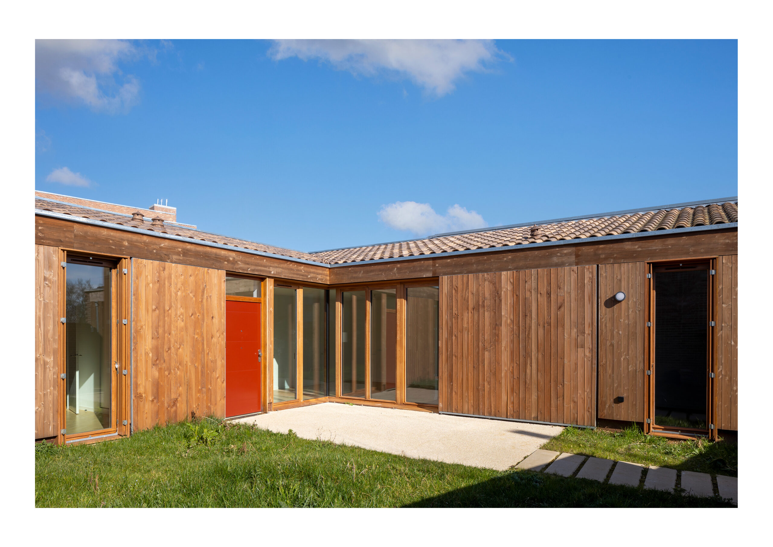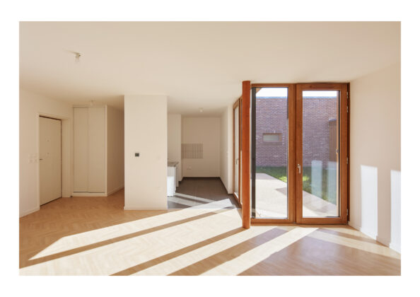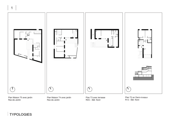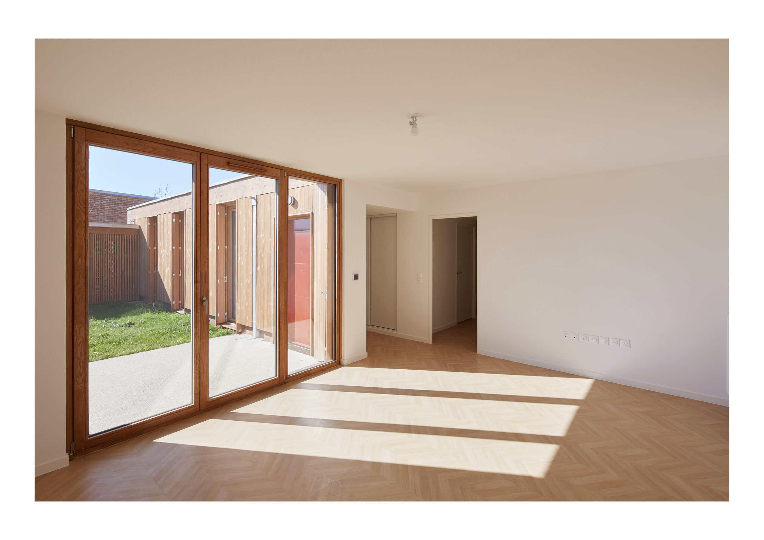 La parte sud del lotto di Arpajon, caratterizzata da una quota più bassa, accoglie una sequenza di case patio a un piano, affiancate e contrapposte in modo da proteggere reciprocamente i giardini privati. A queste si affiancano abitazioni a L, collegate da una strada interna e sovrapposte a unità intermedie, generando una stratificazione tipologica che sostituisce il modello della casa unifamiliare isolata con soluzioni più compatte, adattabili e relazionali. In controtendenza rispetto alle consuetudini, i garage privati vengono eliminati, concentrando i parcheggi in un’area comune e liberando così suolo e spazio per la vita collettiva.