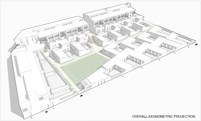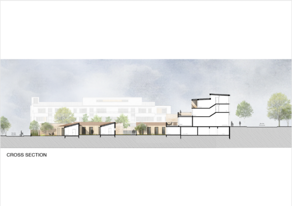 A ovest, un edificio di tre piani chiude il sistema urbano ospitando, sopra il parcheggio e gli spazi comuni, un grande appartamento comunitario destinato alla coabitazione e ulteriori alloggi, inclusi duplex. Le scelte tipologiche consentono di sostituire le tradizionali parti comuni condominiali – atri, pianerottoli interni, ascensori – con percorsi esterni, ballatoi, terrazze e scale aperte, riducendo i consumi energetici e rafforzando il carattere domestico e condiviso degli spazi.