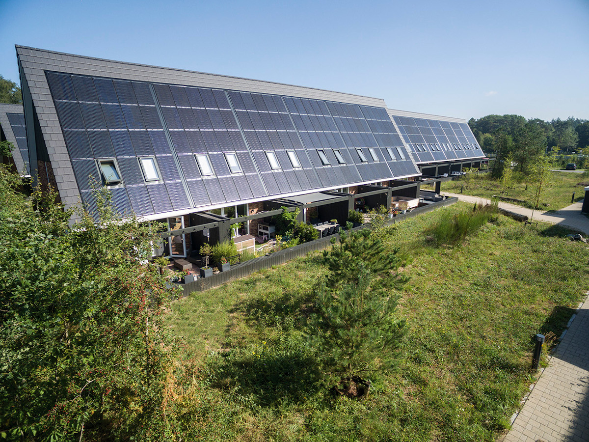 Gli NZEB di Groevenbeek-Noord reinterpretano la stratificazione delle case di campagna olandesi, che sfruttavano il calore del focolare al piano terreno per riscaldare gli spazi soprastanti. La copertura molto ripida favoriva lo smaltimento delle precipitazioni e facilitava l’ingresso della luce naturale in tutte le stanze. I progettisti di 4D Architecten si sono ispirati a questi stessi concetti per disegnare dei veri e propri tetti fotovoltaici, con superfici solari intervallate dalle finestre delle camere. In ogni appartamento la falda rivolta a sud dispone di 23 moduli fotovoltaici, che rendono l’abitazione energeticamente autosufficiente, e di due finestre da tetto FAKRO FTT U6. Si tratta di serramenti ad alte prestazioni termoisolanti, specifici per la posa sulle coperture, che contribuiscono alla riduzione delle dispersioni termiche durante la stagione fredda e schermano i raggi solari durante la stagione calda, garantendo per tutto l’anno la temperatura e l’illuminazione ideali per gli spazi interni.