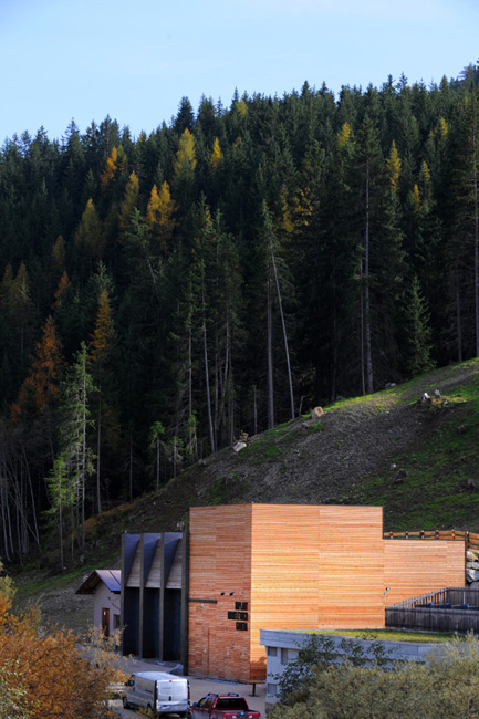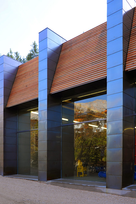 Una struttura unica divisa, all’interno, tra la grande sala principale e gli spazi tecnici degli uffici e della manutenzione. L’edificio è un volume tecnico di cemento, rivestito esternamente da listelli di legno di larice non trattato, articolato su pilastri che contrastano il legno con una copertura in lamiera di rame brunita e incorniciano le ampie vetrate. La scelta dei materiali esprime una modernità essenziale, quasi ascetica che bene si cala nel silenzio della montagna circostante, rispettando e re-interpretando la tradizione degli edifici limitrofi.