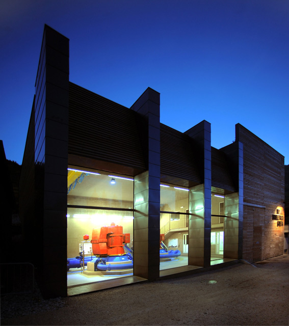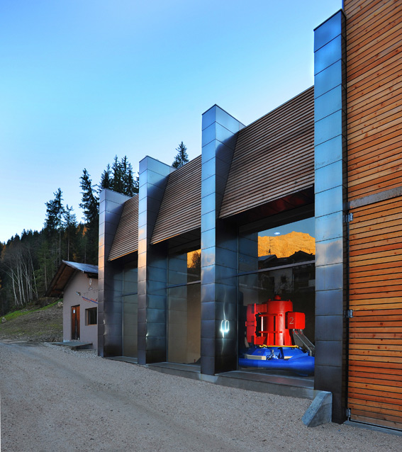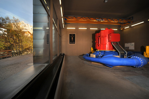 Un ambiente aperto, naturalmente luminoso di giorno, che, di notte, si accende, con un effetto volutamente teatrale, grazie a due proiettori che illuminano dall’alto le turbine. La spinta del torrente, incanalato attraverso un condotto lungo 2.200 m dal ed un dislivello di 116 m, alimenta la produzione elettrica. L’acqua diventa il legame imprescindibile, si trasforma in elemento decorativo e simbolico nello spazio di lavoro creando armonia e continuità con il paesaggio. Soluzioni innovative sono state adottate nella creazione dell’impianto per il filtraggio dell’acqua, nella pulizia dei condotti e nel rispetto della fauna ittica dando vita ad un processo produttivo ai massimi livelli di eco compatibilità.