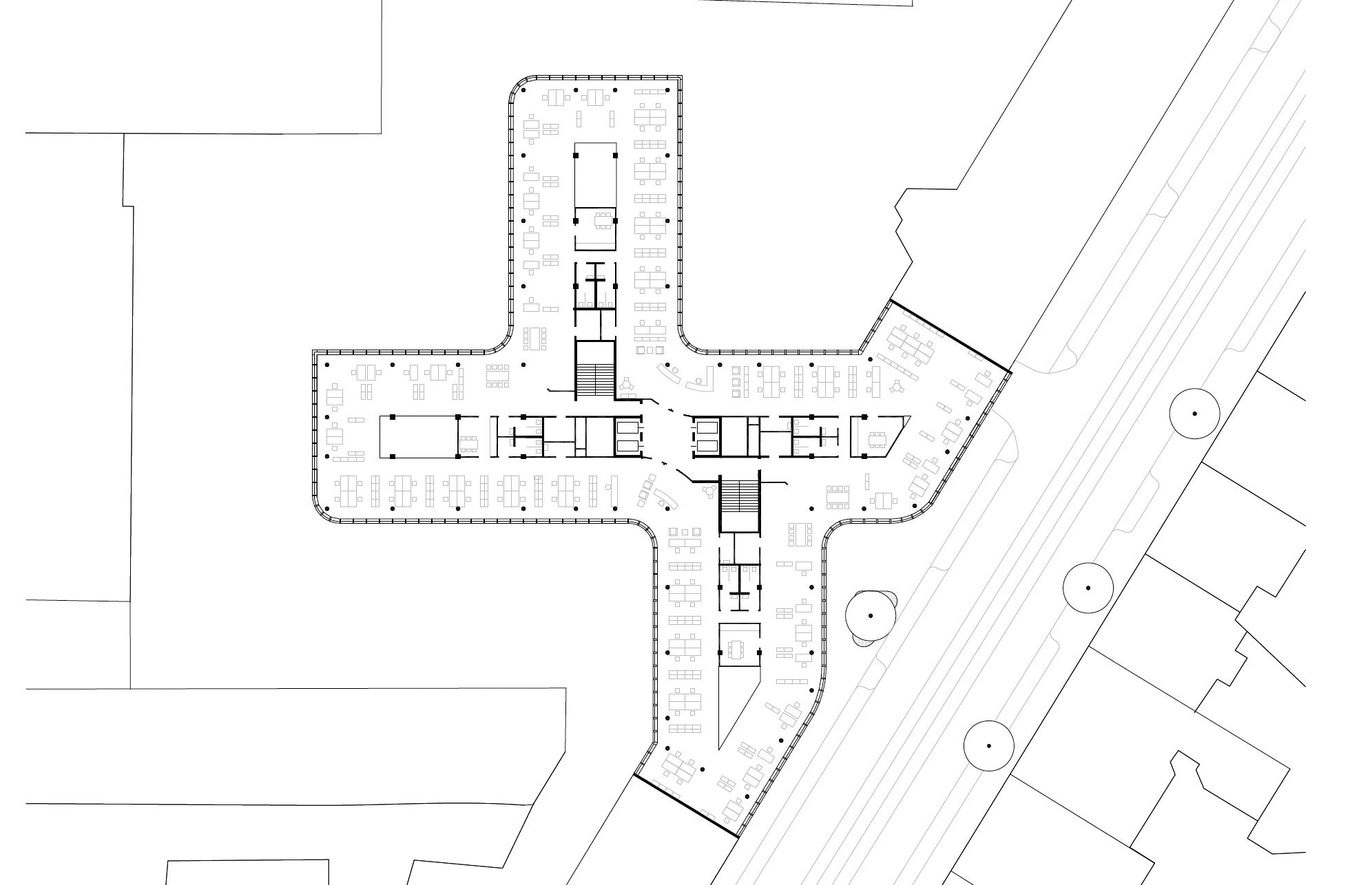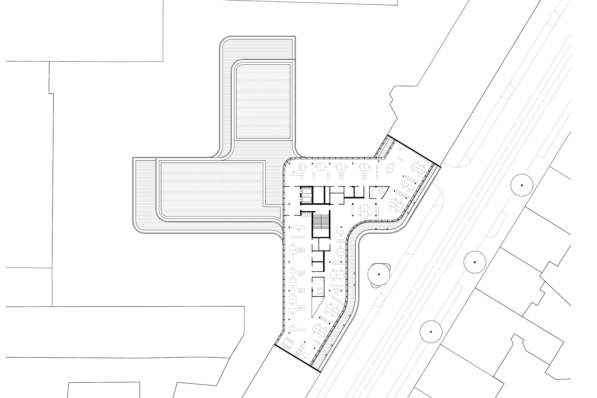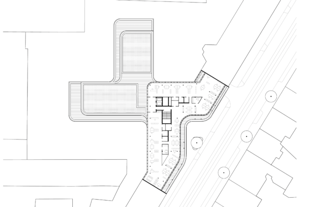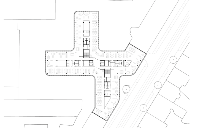 La pianta dell’edificio è organizzata secondo una configurazione a croce, che consente di articolare il lotto in più spazi aperti, destinati a corti verdi e aree di servizio. I collegamenti verticali e i nuclei funzionali sono concentrati al centro, permettendo una distribuzione flessibile degli spazi di lavoro e un utilizzo diffuso della luce naturale. I parcheggi sono in gran parte collocati in un’autorimessa interrata, mentre all’esterno sono previste aree per biciclette.