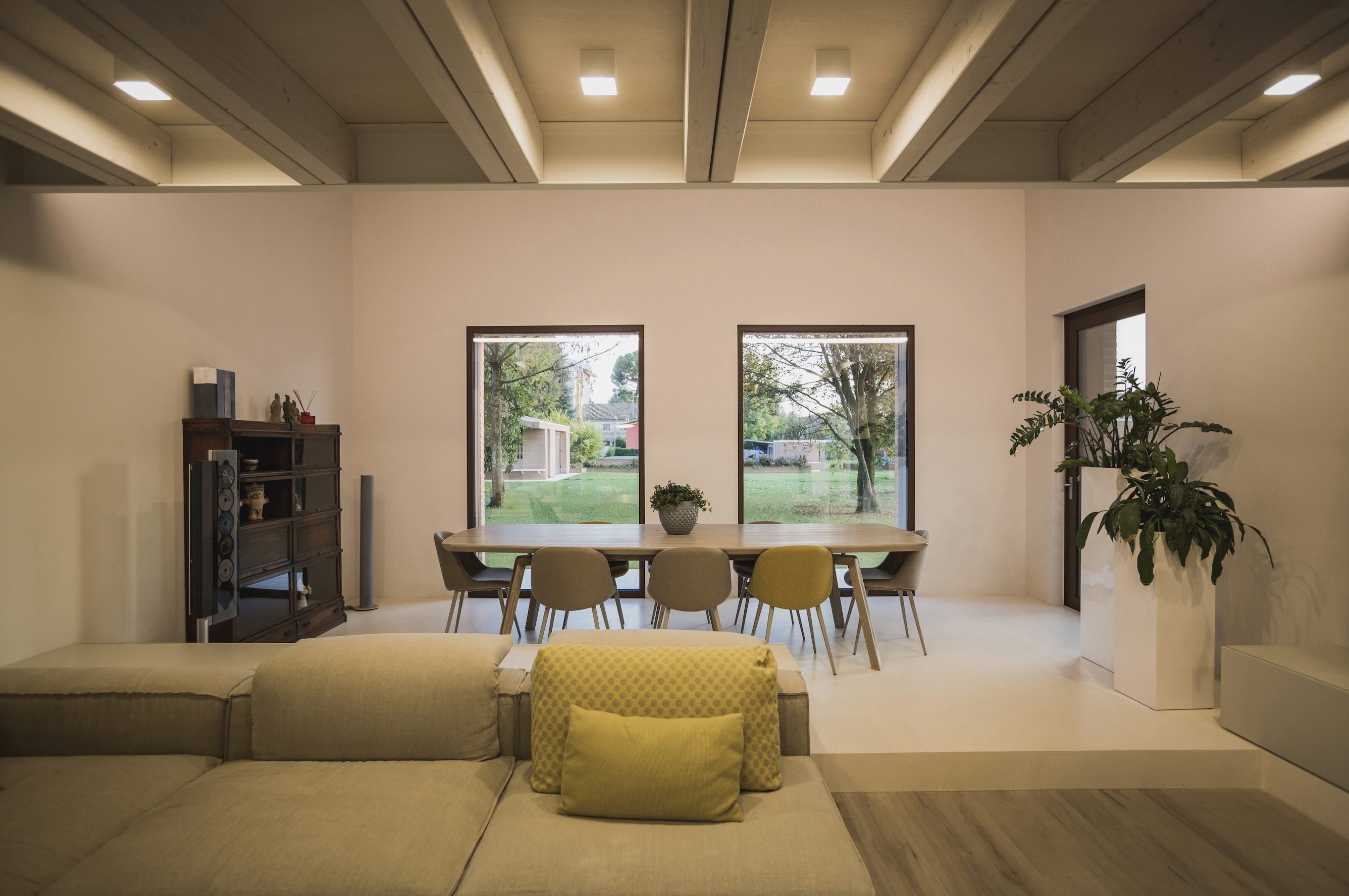 La schermatura dei componenti antieffrazione – serrature, rostri e punti di chiusura – mantiene intatta la pulizia formale dell’infisso pur raggiungendo la Classe RC3. A ciò si aggiunge la possibilità di integrare la tecnologia meccatronica Schüco TipTronic, che permette la movimentazione degli infissi da remoto, tramite maniglia o smartphone, e la gestione intelligente della ventilazione naturale collegata ai sistemi domotici.