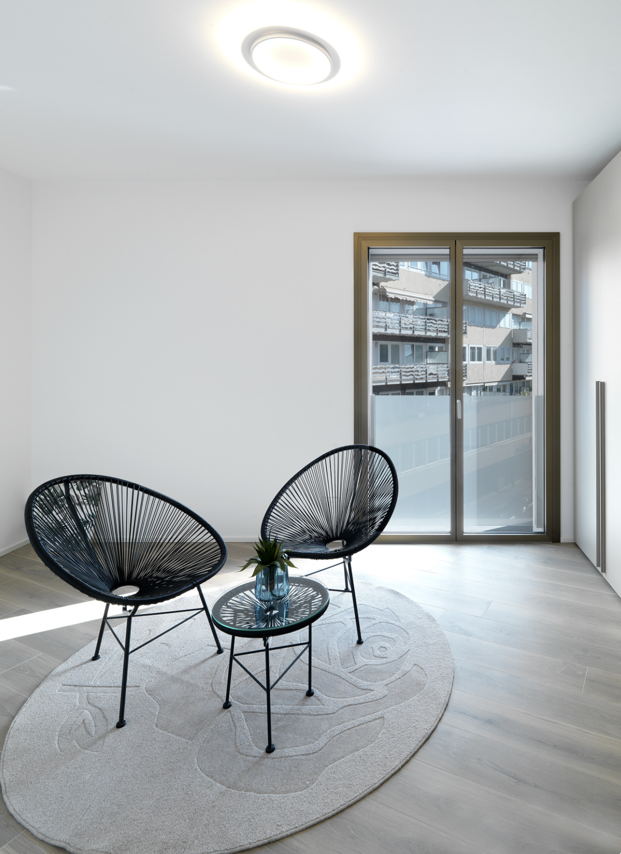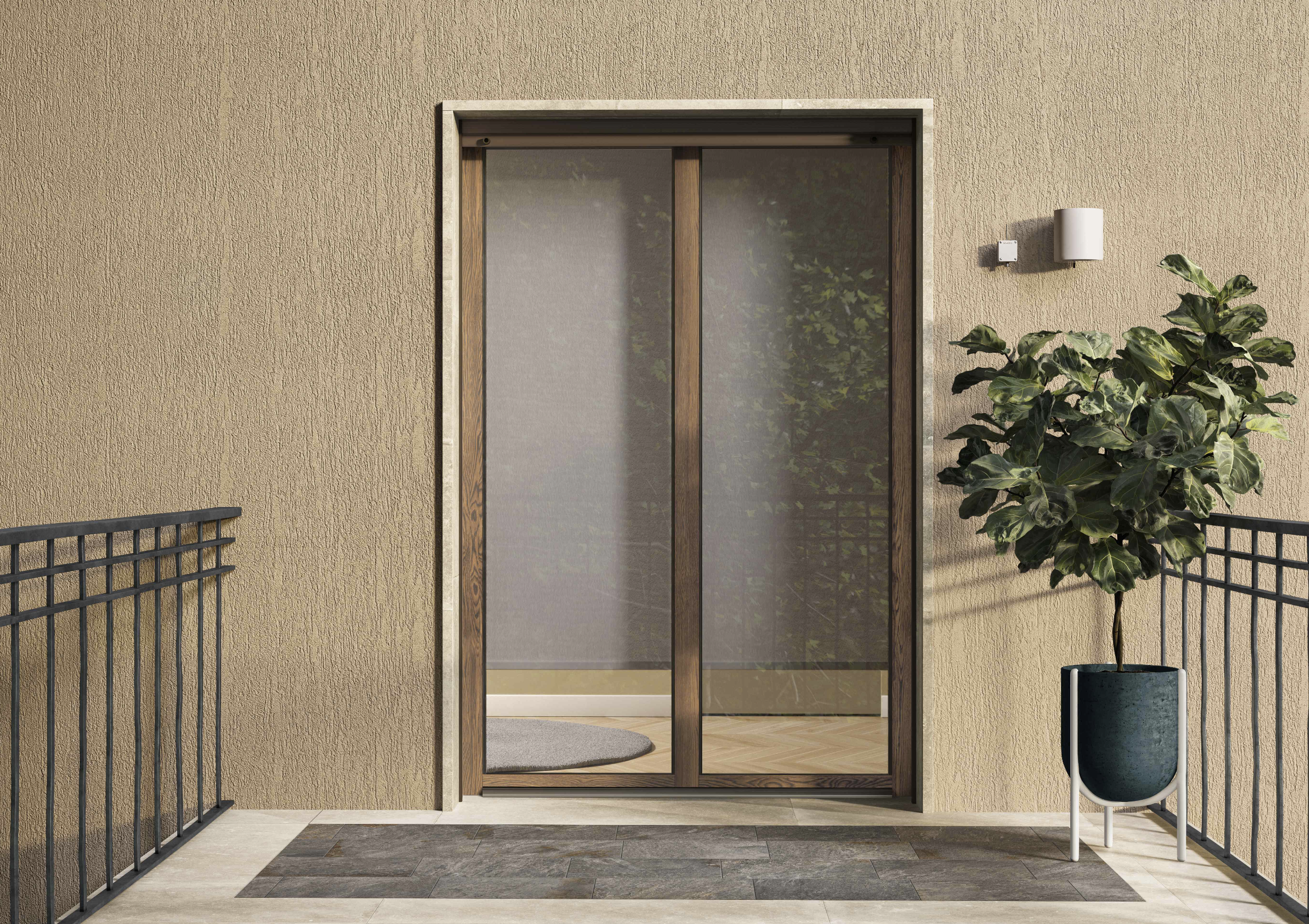 Le prestazioni di tenuta sono garantite dalla guarnizione centrale continua e dalla tecnologia Schüco SimplySmart, che consente anche l’adozione di cerniere a scomparsa con apertura fino a 180° e la gestione di ante fino a 160 kg, semplificando manutenzione e operazioni di montaggio.