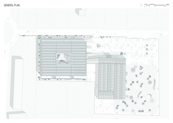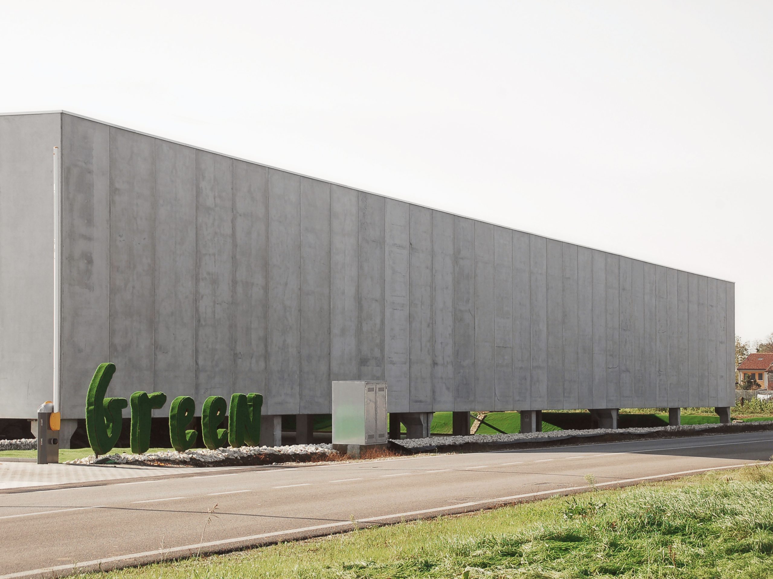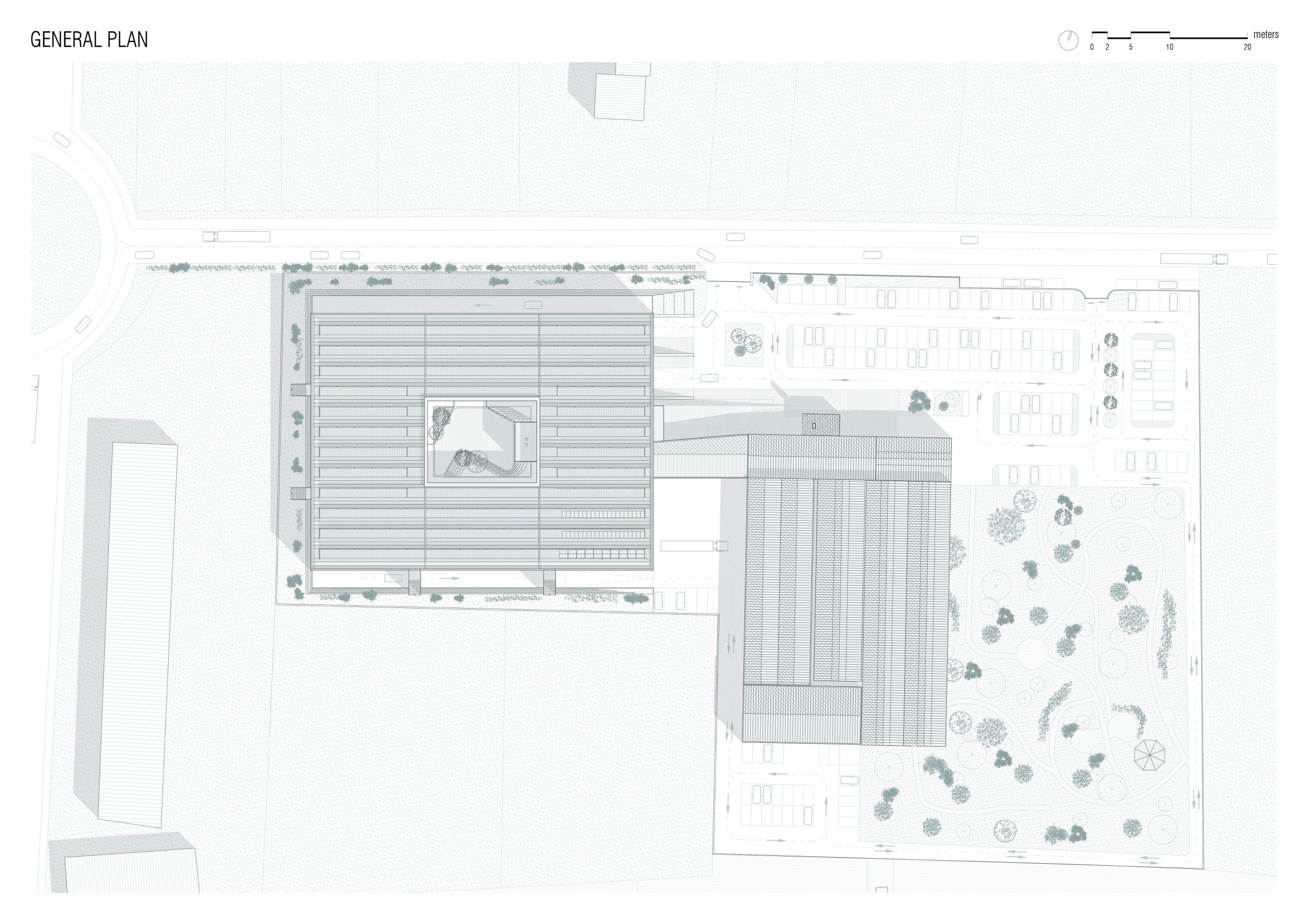Il Green Village è un garden center di nuova concezione: un organismo architettonico composto da tre parti – edificio commerciale, serre vivaistiche e parco verde – che dialogano tra loro in un equilibrio calibrato di pieni e vuoti, materia e luce.