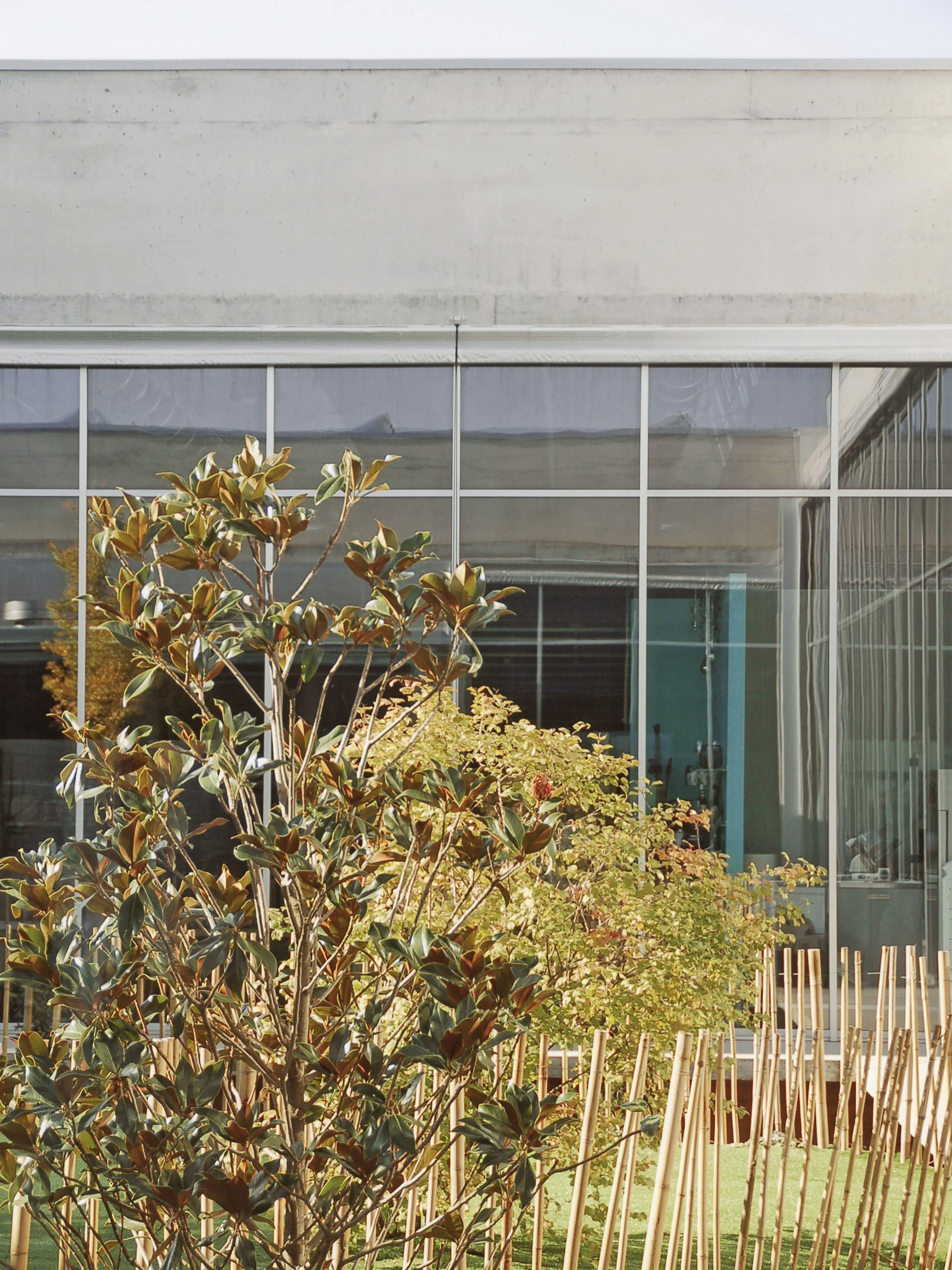 La corte interna, con le sue piante e il suo cielo, rappresenta un gesto di resistenza rispetto al paesaggio anonimo che la circonda: un giardino segreto nel cuore dell’industria, un luogo dove la natura si fa architettura e l’architettura diventa natura.