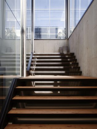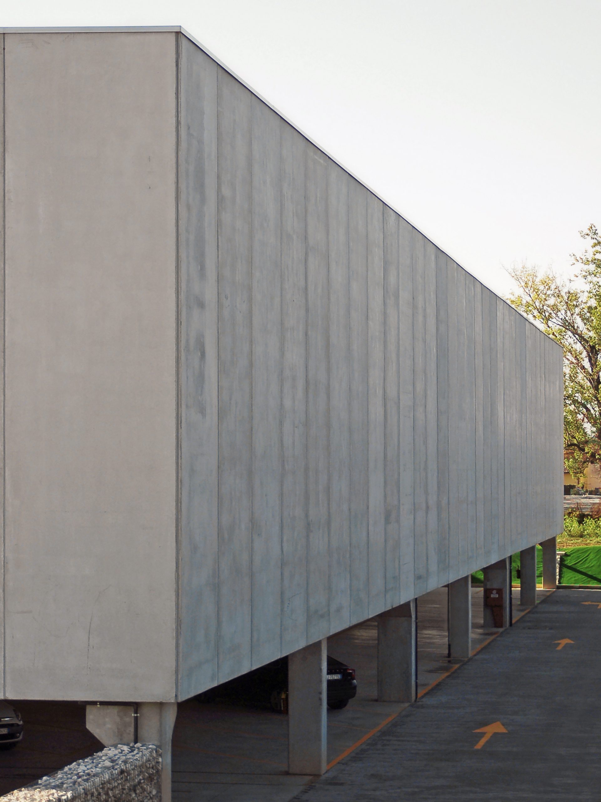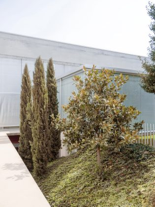 Il rapporto con il suolo è altrettanto misurato: il parcheggio interrato, realizzato a quota inferiore al piano di campagna dopo uno studio accurato della falda acquifera, contribuisce ad alleggerire la percezione volumetrica del complesso, che sembra fluttuare leggermente sopra il terreno.