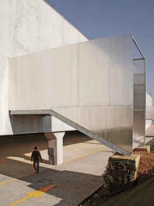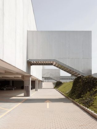 Il volume commerciale, un parallelepipedo essenziale in calcestruzzo faccia a vista, rinuncia a qualsiasi forometria decorativa per affermarsi come una massa pura, compatta, interrotta solo da varchi e portali metallici che ne accentuano la solidità. La luce naturale proviene dall’alto, attraverso un tetto a shed e il grande patio vetrato, assicurando un’illuminazione diffusa e uniforme per tutto il giorno.