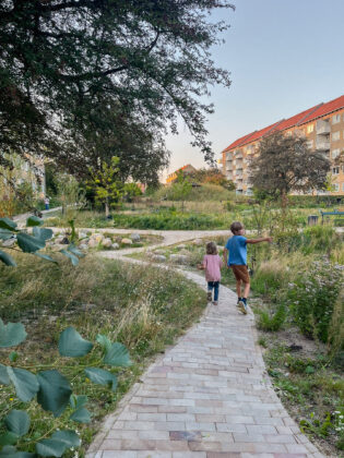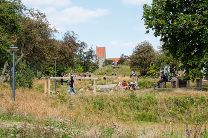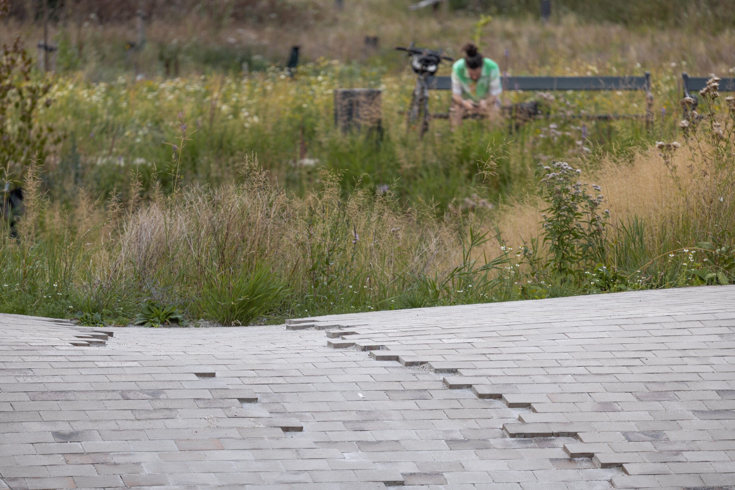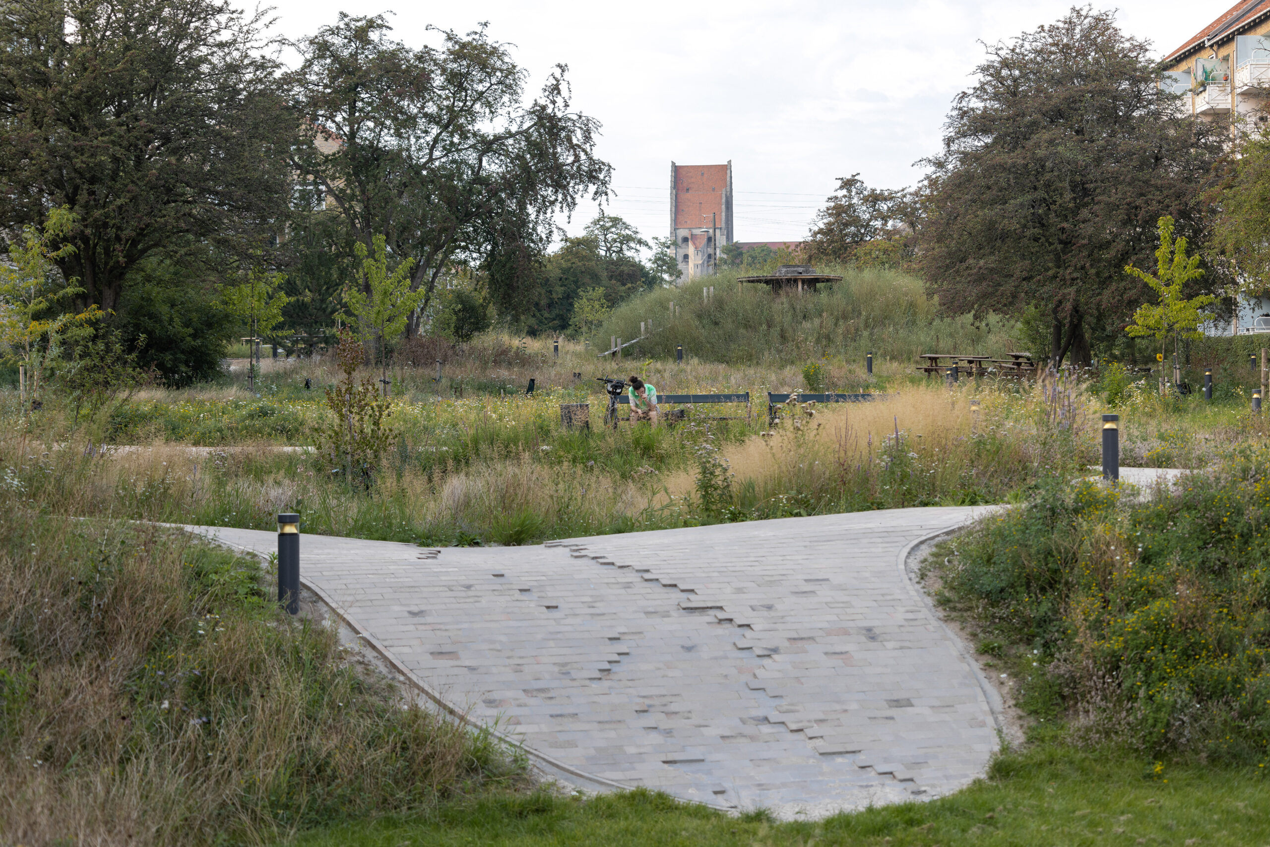 Un percorso sinuoso in ghiaia e piastrelle gialle – omaggio cromatico alla vicina Grundtvig’s Church – connette le diverse parti del parco, dissolvendosi in alcuni tratti nel paesaggio naturale e invitando a un’esperienza immersiva dello spazio. Il progetto valorizza inoltre le visuali storiche verso la chiesa, già centrali nel disegno originario del paesaggista C.Th. Sørensen, aggiornandone l’eredità alla luce delle istanze ambientali e sociali contemporanee.