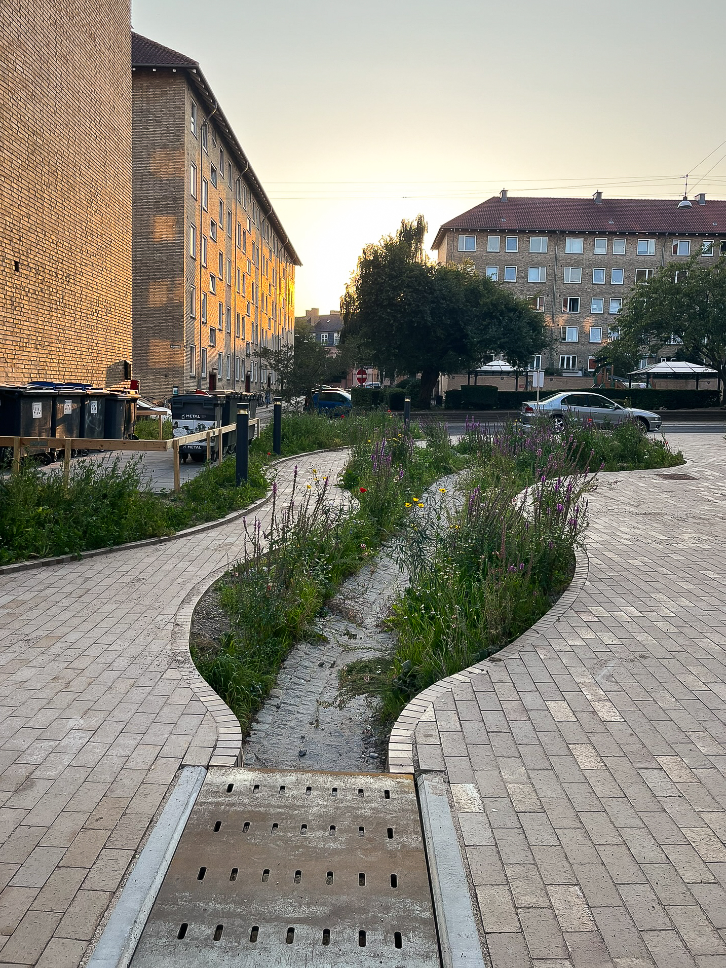 Più che un parco ornamentale, Grønningen-Bispeparken si configura come un’infrastruttura ecologica e sociale, capace di rispondere simultaneamente alle sfide del cambiamento climatico e alle esigenze della vita quotidiana. Il progetto nasce dall’esigenza di mettere in sicurezza l’area rispetto a piogge intense e allagamenti, integrando sistemi di gestione naturale delle acque meteoriche con nuovi spazi per l’incontro, il gioco e l’attività collettiva. Attraverso una rete interconnessa di diciotto bioswales, il parco è in grado di raccogliere, trattenere e infiltrare oltre 3.000 m³ di acqua piovana, trasformando un problema infrastrutturale in una risorsa spaziale e paesaggistica.