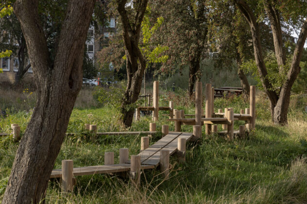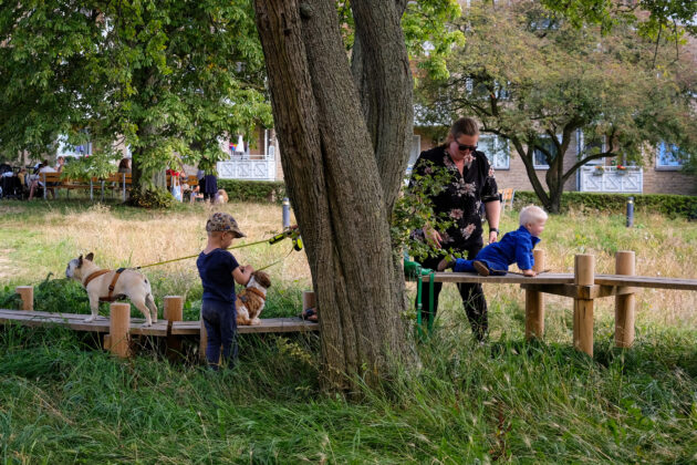 Il progetto integra anche una dimensione artistica e partecipativa attraverso l’intervento dell’artista Kerstin Bergendal, che ha sviluppato un programma sperimentale di arte pubblica in dialogo con i residenti e i progettisti. Le strutture lignee realizzate in collaborazione con lo studio Efterland si inseriscono nel paesaggio come dispositivi per il gioco, l’incontro e l’esplorazione, rafforzando il carattere inclusivo del parco.