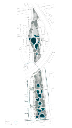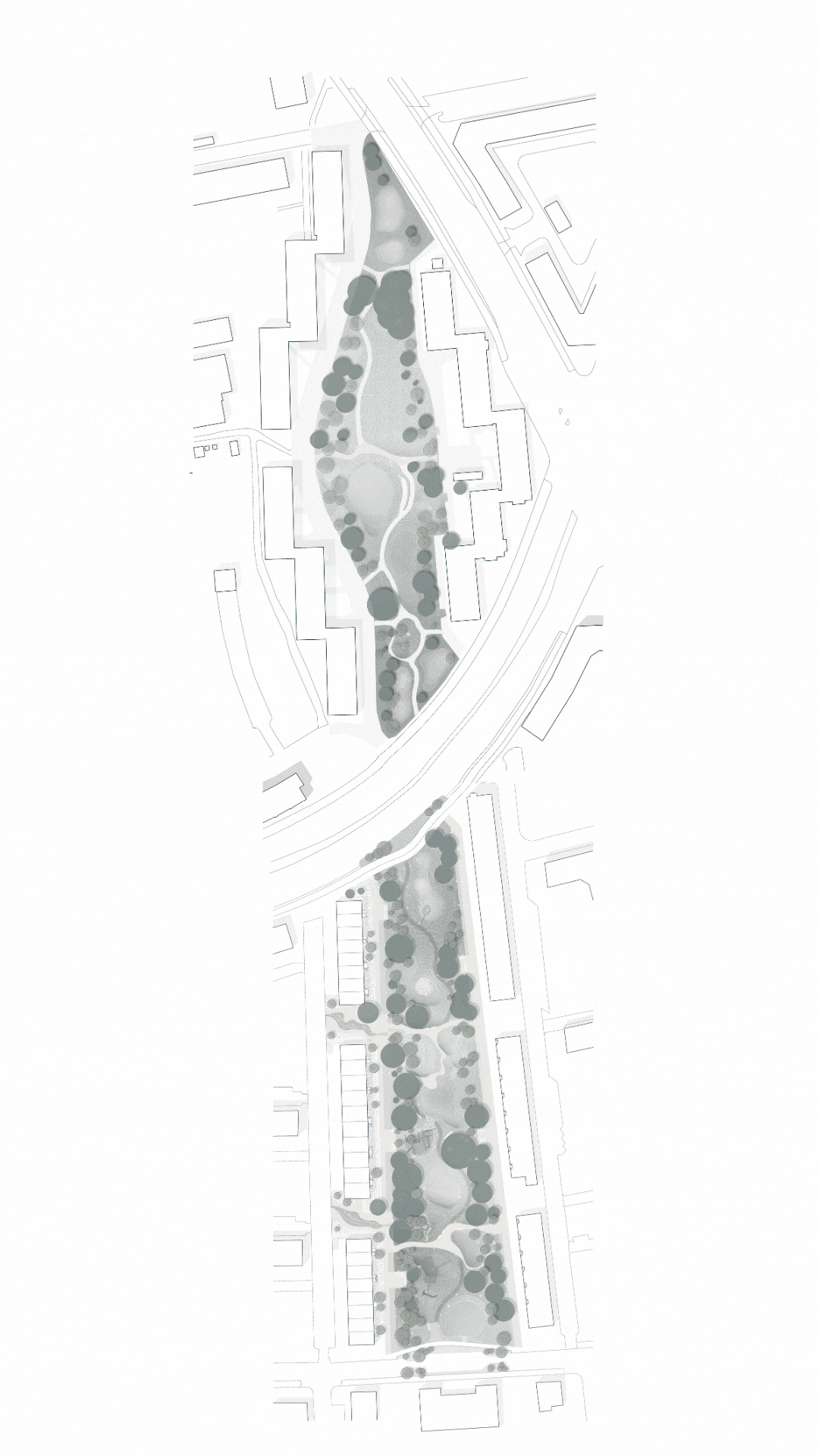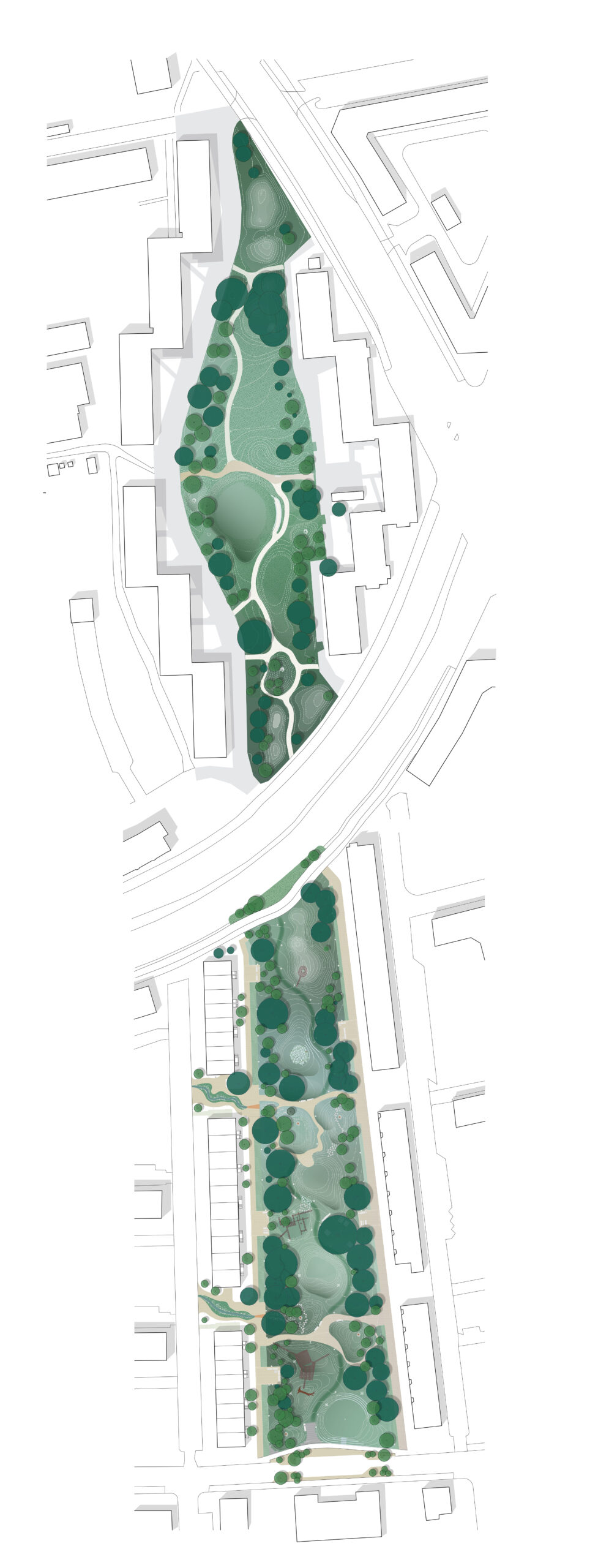 Il disegno del parco si articola in cinque principali tipologie ambientali, ciascuna definita da specifiche funzioni climatiche e sociali: le aree umide delle Bio Oases, dedicate alla biodiversità e alla fauna; i biotopi secchi e raccolti tra i tronchi, pensati per il gioco informale e il riposo; i grandi prati comuni destinati ad attività sportive, mercati e eventi; le Pocket Squares urbane, spazi di sosta e socialità tra gli edifici; e le Bunker Hills, che reinterpretano i bunker sotterranei della Guerra Fredda come luoghi flessibili per l’uso pubblico, fruibili in tutte le stagioni.