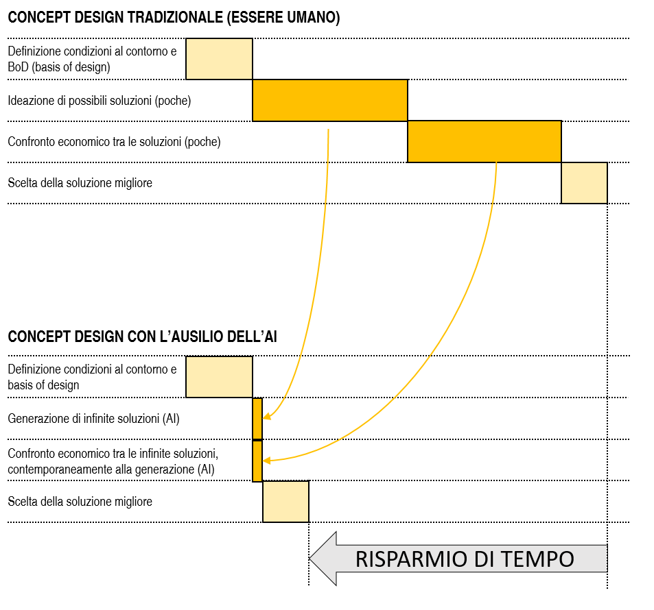 L’AI, grazie alla sua rapidità di elaborazione, ci consente di ridurre tempi che un tempo richiedevano settimane, portandoli a poche ore e aprendo nuove prospettive progettuali. Il valore dell’AI emerge, in particolare, nell’ambito della consulenza e del value engineering, dove la tecnologia ci permette di esaminare e confrontare numerose varianti progettuali, suggerendo soluzioni alternative che arricchiscono il processo decisionale. L’analisi dei dati, effettuata già solo mediante algoritmi open source, offre una visione integrata e profonda dei processi, andando ben oltre la semplice ottimizzazione dei tempi e mettendo in luce criticità e opportunità in tempo reale.