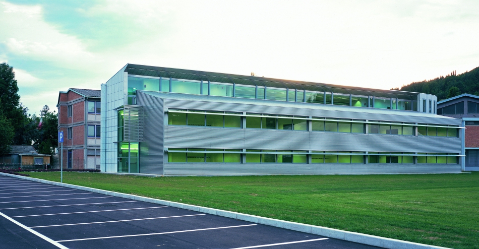 La seconda opera, invece, è stata concepita con un carattere totalmente diverso: è stata realizzata, infatti, una nuova volumetria, all'interno di un polo scolastico degli anni '70, con un'architettura ben definita, senza soluzioni di continuità con la struttura originale. Attorniata da un'area verde, la costruzione è dotata di aule didattiche che sfruttano la luce naturale grazie ad ampie vetrate disposte a nastro lungo la facciata, mentre il lato opposto è pensato per funzioni di servizio che non necessitano di buona esposizione. Entrambe le facciate sono ventilate e finite con lamiere in acciaio inossidabile in abbinata a marmo, mentre l'edificio si basa si una struttura composta da profili tubolari in acciaio, con travi reticolari metalliche di copertura e solai in lamiera grecata. L'illuminazione naturale viene valorizzata anche all'interno del nuovo edificio, in cui una sezione vetrata della copertura e del solaio permette l'ingresso della luce solare verso il corridoio, dal primo piano al piano terra, come una sorta di collegamento tra i due livelli. La copertura dell'edificio è adibita a terrazza e luogo di incontro, così come il cortile che ospita anche un'area dedicata alla coltivazione di specie arboree.