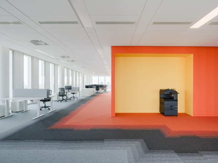 La moquette Interface, scelta per la pavimentazione, risponde alle esigenze acustiche e di comfort visivo dell’open space. Il disegno della Employ Collection, con il suo gradiente dal grigio all’arancione, introduce una dinamica visiva che diventa cifra stilistica del progetto. Le pareti, ispirate ai colori del logo Kaiserkraft, dialogano con il pavimento creando continuità percettiva e guidando lo sguardo tra le diverse aree operative.