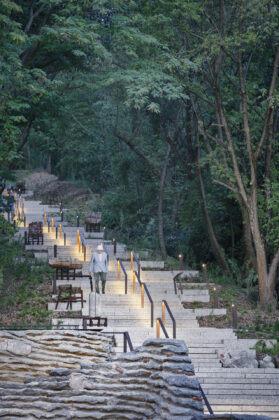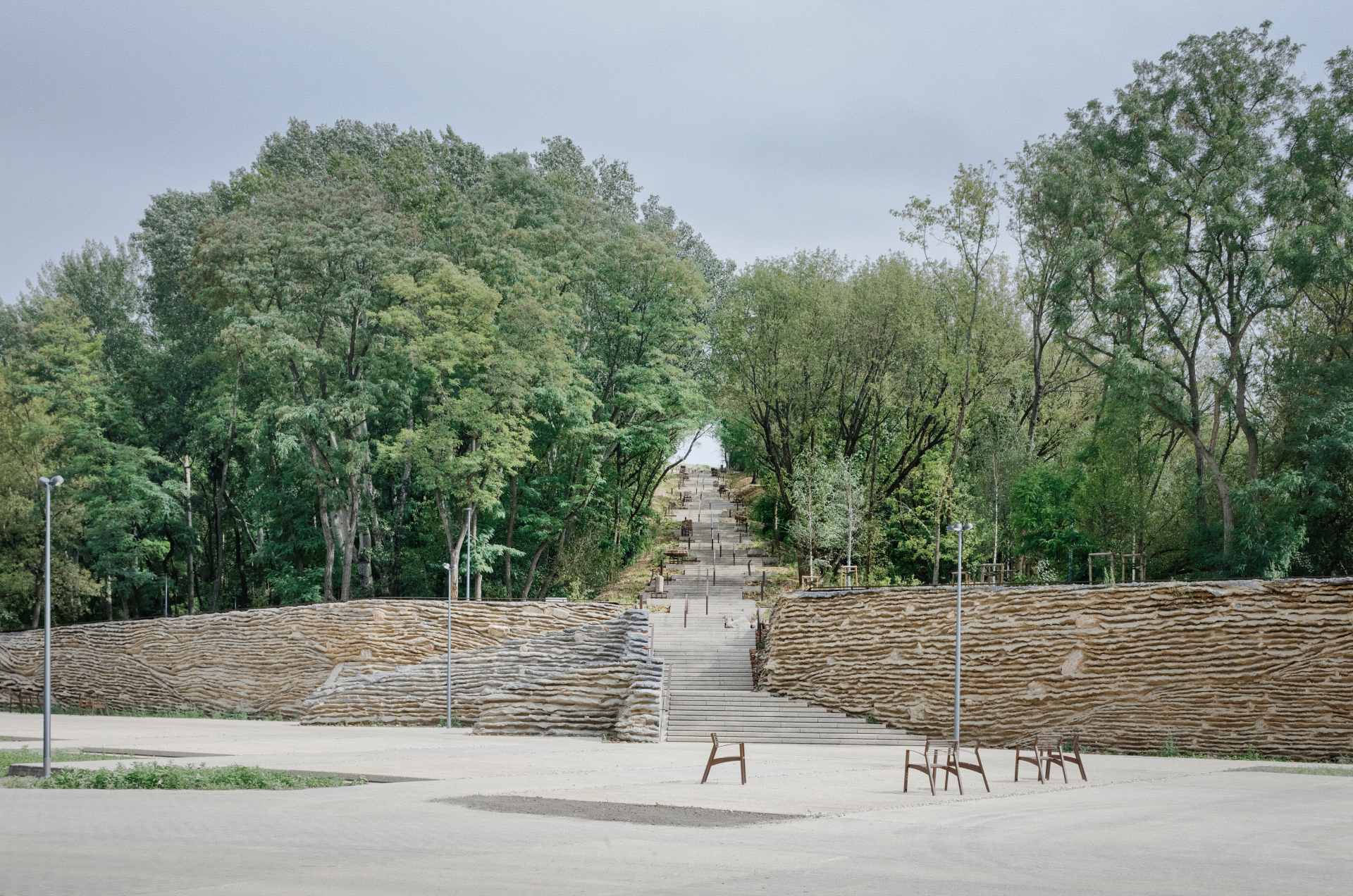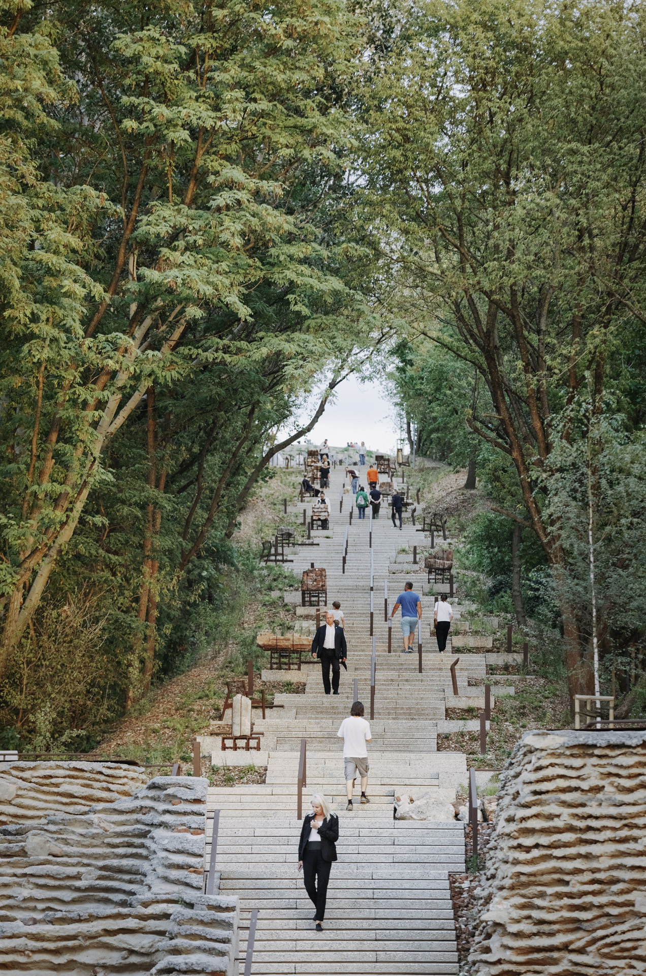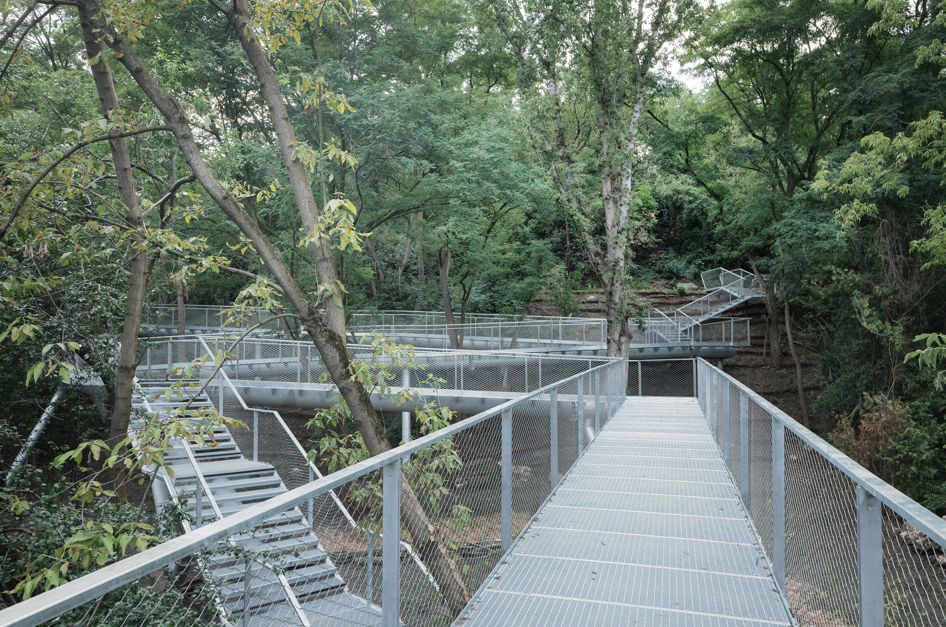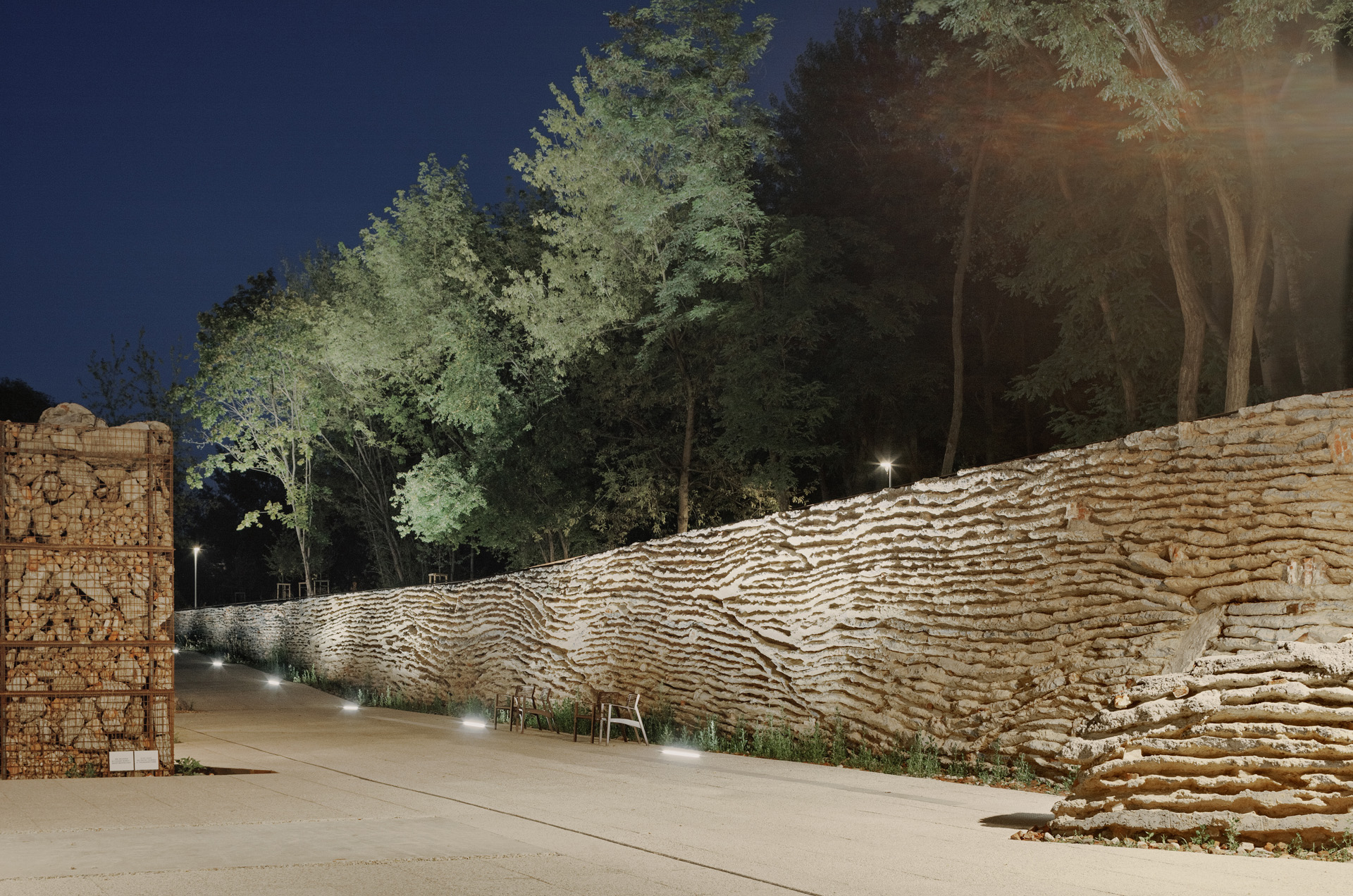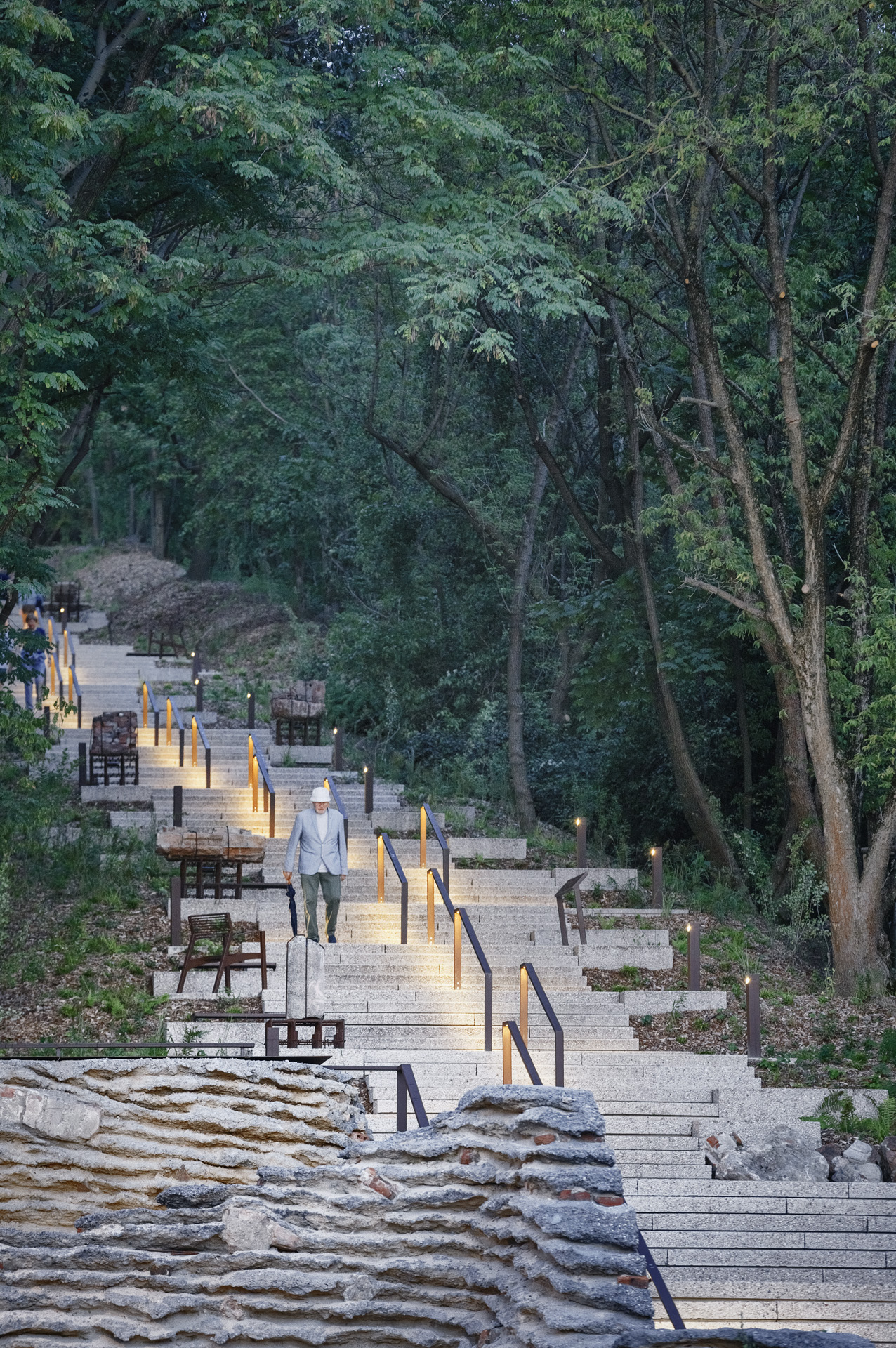 La complessa morfologia del rilievo ha richiesto l’introduzione di un sistema articolato di percorsi accessibili, capace di adattarsi al terreno senza alterarne l’equilibrio. Rampe, scale e passerelle sopraelevate consentono di attraversare il parco mantenendo intatta la vegetazione esistente, mentre incisioni artificiali nel terreno rendono percorribili le parti più impervie. Il progetto alterna spazi di attraversamento a luoghi di sosta e contemplazione, affiancando dispositivi ricreativi a elementi di carattere narrativo, come il lapidarium e i percorsi espositivi dedicati alla ricostruzione della città.