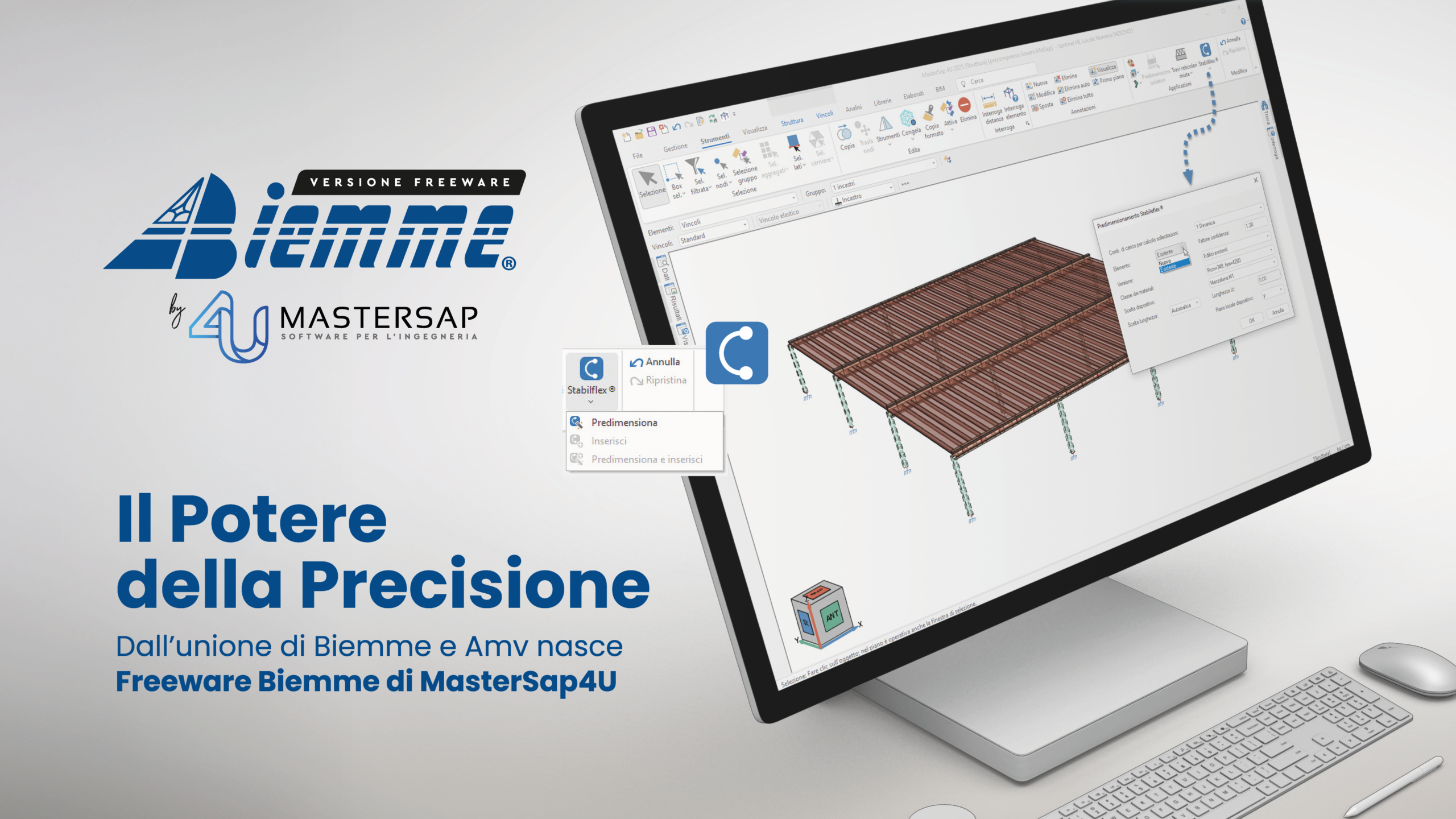 MasterSap 4U, nella versione dedicata a Biemme, consente la modellazione di qualsiasi tipologia strutturale ed eseguire analisi lineari su edifici prefabbricati in c.a. fino a 150 nodi in modalità gratuita. Partendo appunto dalla modellazione della struttura e da un'analisi pre-intervento, il software consente una individuazione delle criticità della struttura e permette il predimensionamento dei dispositivi Stabilflex®, dissipatori sismici isteretici brevettati da Biemme, in maniera intuitiva, rapida, restituendo dati stampabili.