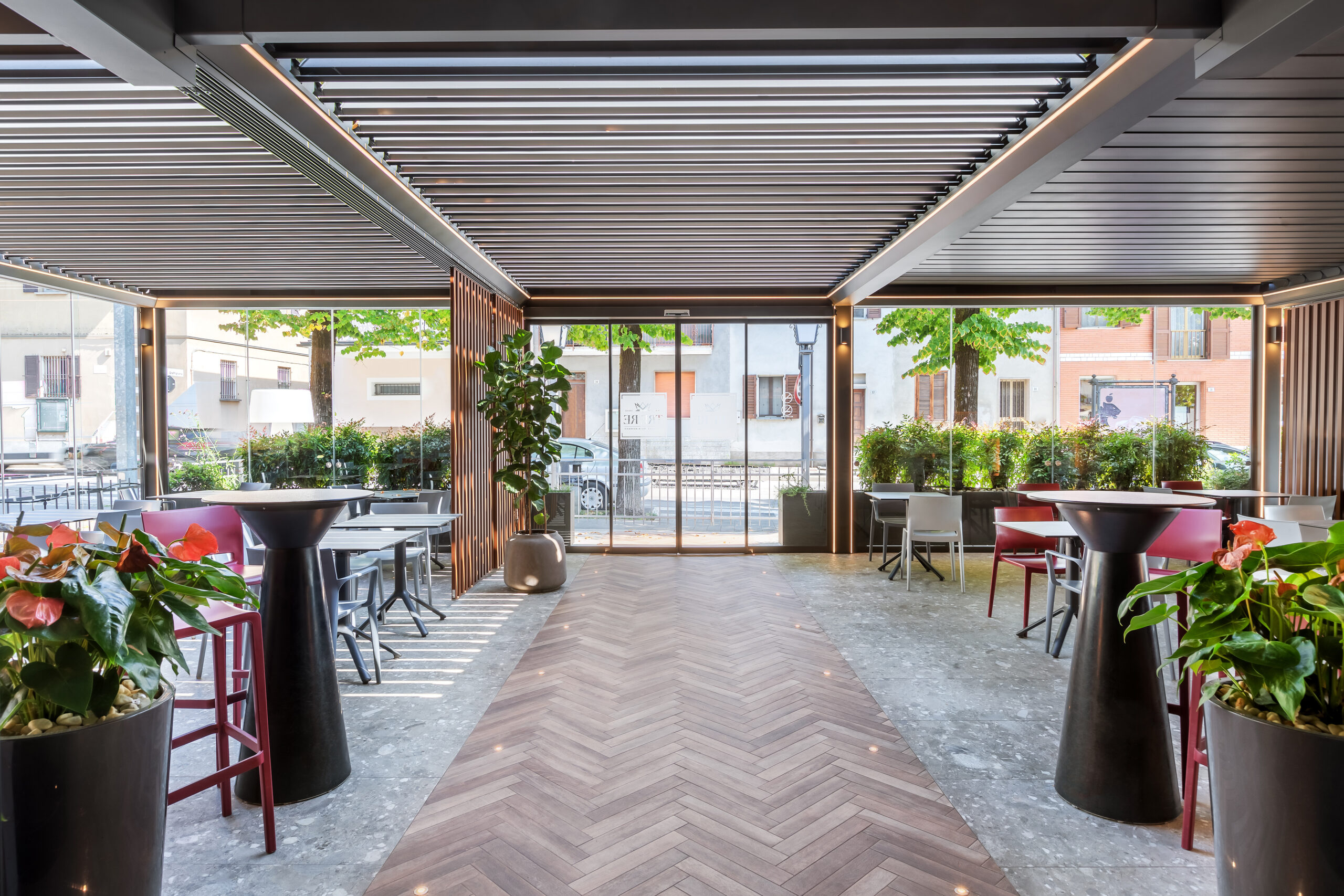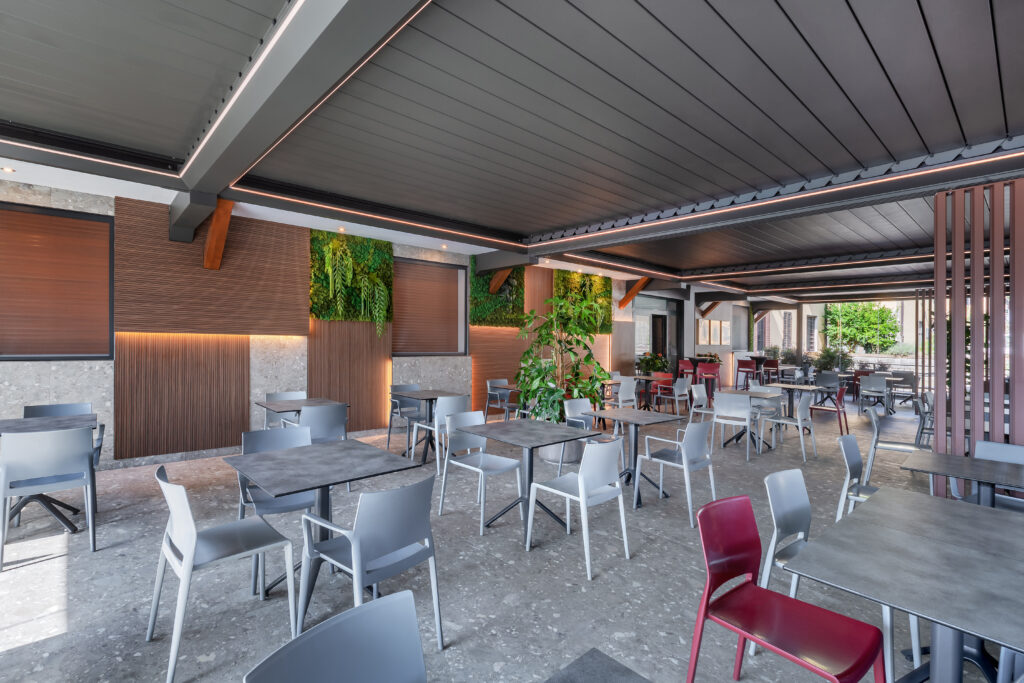 Il nuovo dehors porta la firma di BT Group, che ha installato una pergola bioclimatica PERGOSPACE R640 con finitura RAL 7022 FT. Una struttura elegante e performante, arricchita da una serie di dettagli che ne esaltano la funzionalità e l’estetica: illuminazione a LED integrata su copertura, perimetro e montanti; vetrate G71 che garantiscono comfort e protezione in ogni stagione; frangisole F20 con doghe verticali per delimitare le diverse aree; fioriere decorative e un ingresso automatico con due ante scorrevoli che facilita l’accesso dall’esterno. La pergola è stata fissata a parete e a terra con un sistema di scarico dell’acqua piovana integrato e staffe realizzate su misura, rifinite con carter in lamiera verniciata e taglio laser che accolgono anche l’insegna del locale. Infine, un dettaglio suggestivo e voluto: sono state mantenute a vista le antiche travi del tetto originale, creando un raffinato contrasto tra passato e presente.