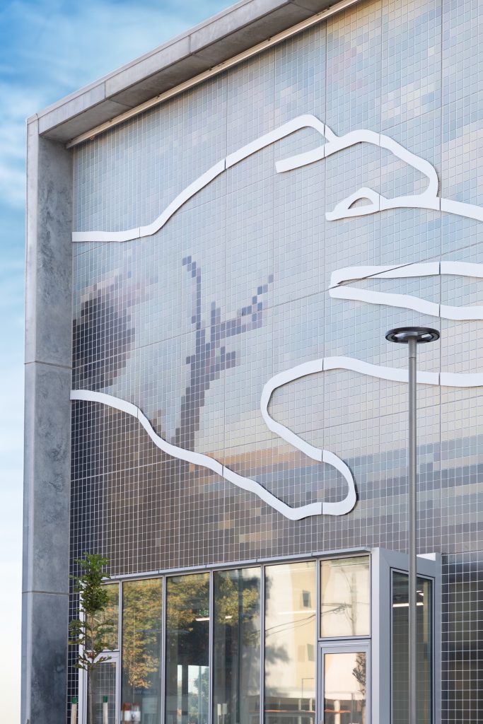 La facciata est, che copre 522 metri quadrati, utilizza lastre Uni-Ice Maximum - ognuna misura 300x150 cm - personalizzate tramite la tecnologia DYS. La superficie presenta una riproduzione in grande formato del dipinto di J.S. Calder del 1860, View from Royal Park across West Melbourne Swamp, reinterpretato da Abdul Abdullah. Due grandi mani in alluminio si estendono sull’immagine in un gesto di benvenuto, fondendo riferimenti storici e simbolismo contemporaneo. L’opera, visivamente straordinaria, è realizzata interamente su grandi pannelli Maximum Active Surfaces®, unendo bellezza artistica e funzione ambientale.