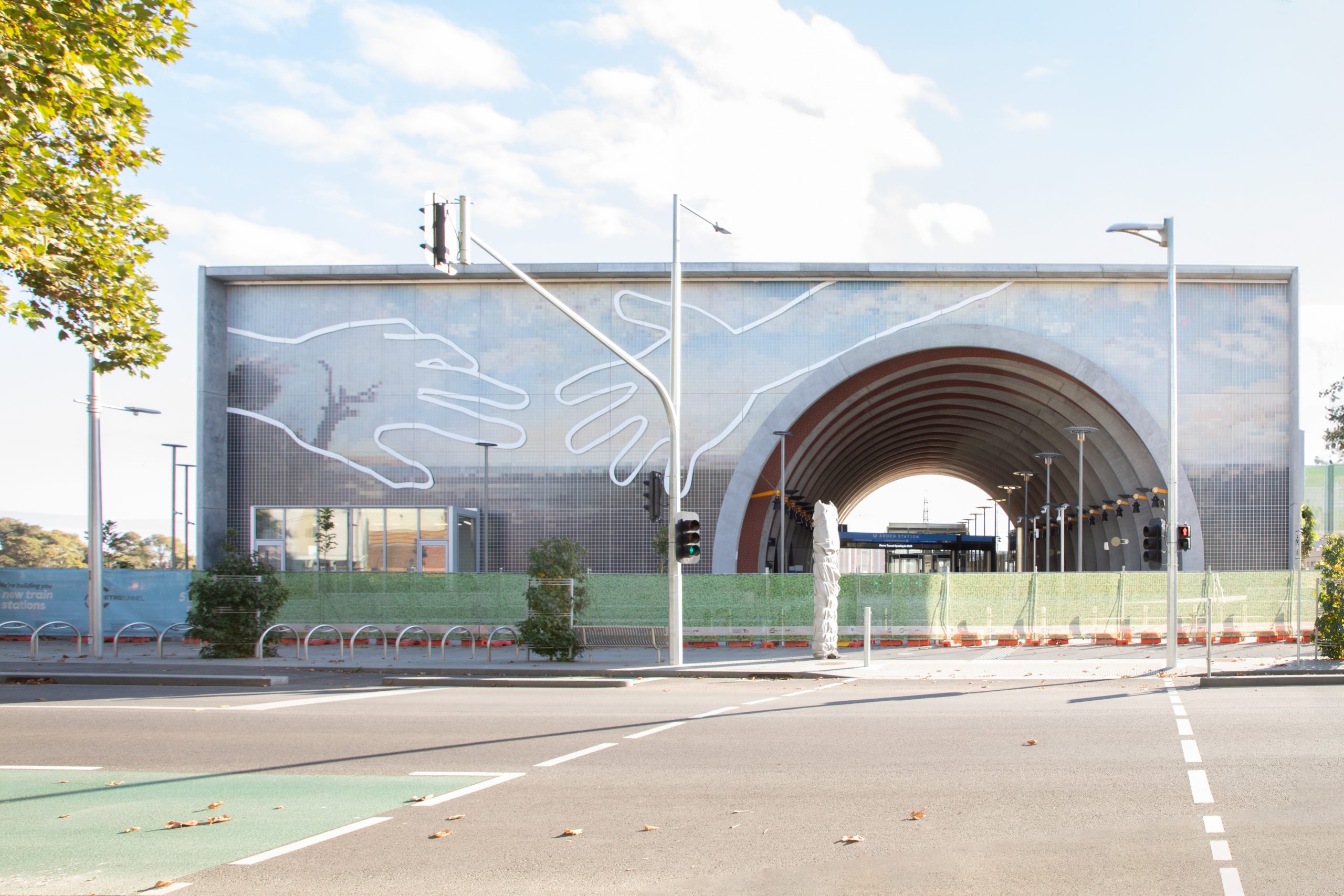 La facciata est, che copre 522 metri quadrati, utilizza lastre Uni-Ice Maximum - ognuna misura 300x150 cm - personalizzate tramite la tecnologia DYS. La superficie presenta una riproduzione in grande formato del dipinto di J.S. Calder del 1860, View from Royal Park across West Melbourne Swamp, reinterpretato da Abdul Abdullah. Due grandi mani in alluminio si estendono sull’immagine in un gesto di benvenuto, fondendo riferimenti storici e simbolismo contemporaneo. L’opera, visivamente straordinaria, è realizzata interamente su grandi pannelli Maximum Active Surfaces®, unendo bellezza artistica e funzione ambientale.