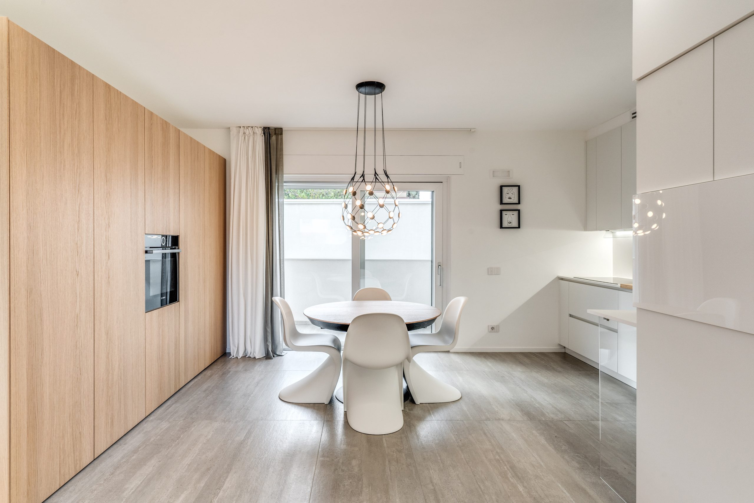 Il bianco dei profili sottili, discreto ed elegante, dialoga con la palette dell’interior: toni caldi del beige e del tortora, superfici grigio perla e sabbia, dettagli neri e legno naturale che compongono un equilibrio raffinato e contemporaneo. Una scelta cromatica che intensifica la percezione di ordine, luce e continuità visiva, trasformando ogni ambiente in un rifugio accogliente, essenziale e perfettamente armonioso.