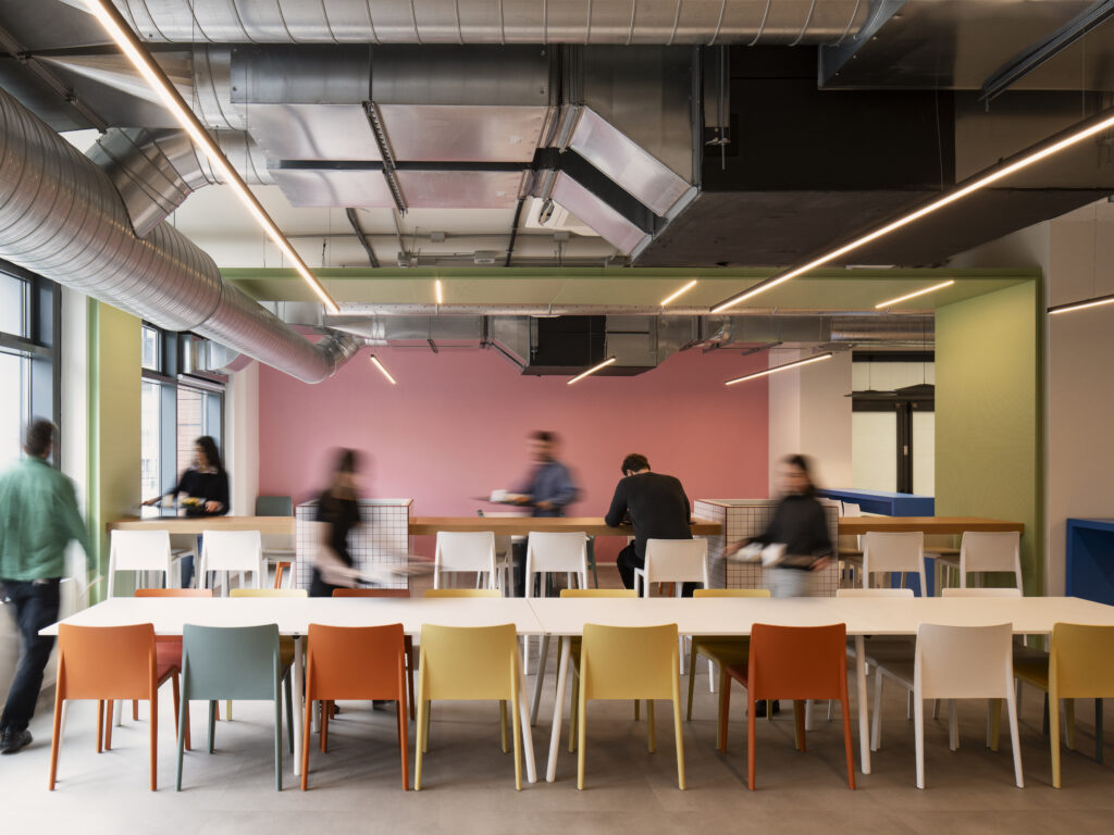 All’interno del progetto, il sistema food, risponde a esigenze diverse nel corso della giornata e rafforza la dimensione sociale degli spazi di lavoro, diventando un linguaggio progettuale e culturale, oltre che funzionale.
