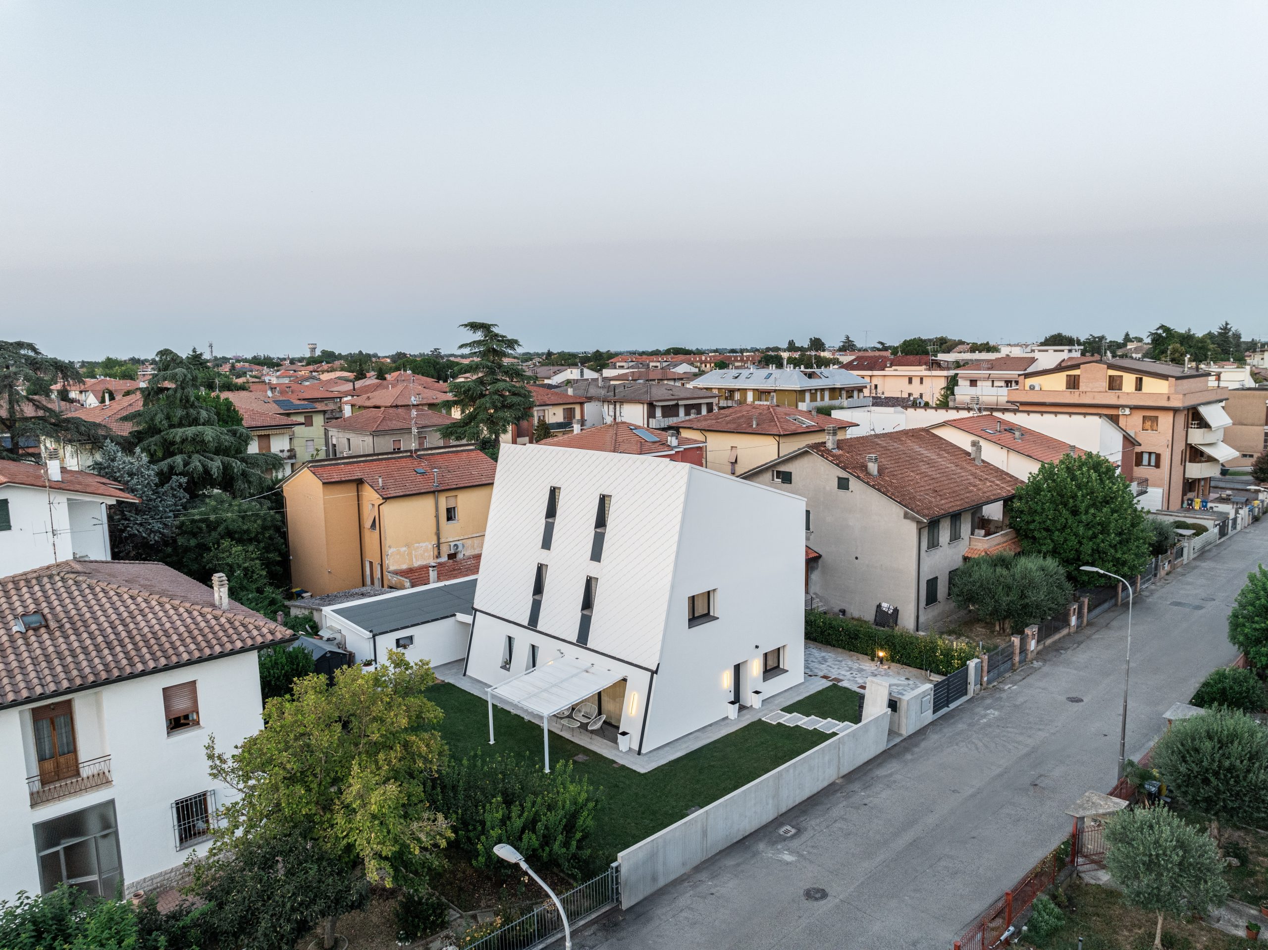 Villa SDM nasce su un lotto privo di vincoli urbanistici e paesaggistici, in un quartiere caratterizzato da edifici tradizionali con facciate intonacate e tetti in coppi. La richiesta del committente era chiara: non ripetere né mimetizzarsi, ma osare ed emergere. Si tratta di una demolizione e ricostruzione integrale, firmata da tissellistudioarchitetti, progettata per superare lo standard dell’abitazione monofamiliare urbana. Il risultato è un volume monolitico e scultoreo, rivestito in alluminio PREFA (Scaglia 29x29 in copertura e facciata) nella finitura P.10 bianco puro. Questa scelta di materiale e colorazione valorizza una lettura compatta e contemporanea dell’edificio.