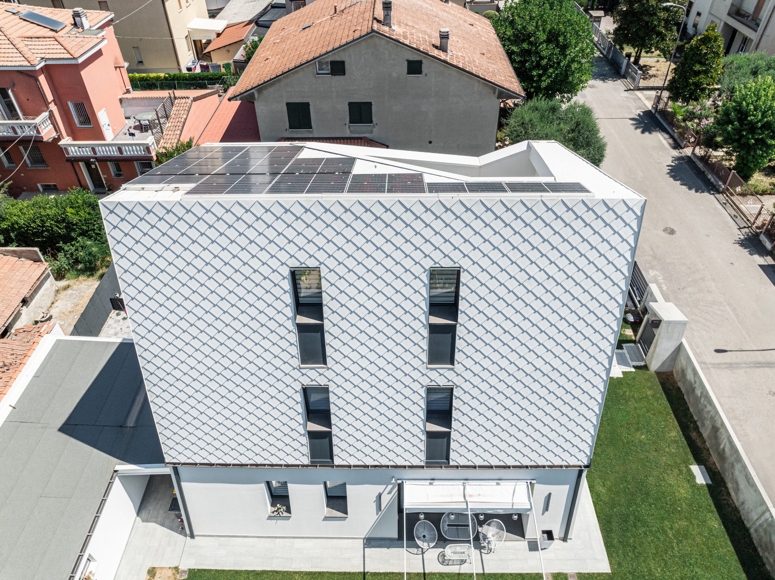 L’installazione delle Scaglie 29x29 è stata eseguita dalla Lattoneria San Pietro in Vincoli srl. Grazie alla geometria precisa, la facciata si presenta come una pelle materica e dinamica, in netto contrasto con gli edifici vicini. Ombre e riflessi cambiano durante la giornata, accentuando il movimento delle linee diagonali e il carattere scultoreo dell’architettura. Villa SDM si distingue così come un progetto che combina estetica, funzionalità e sperimentazione, portando un segno contemporaneo e innovativo nel tessuto urbano.