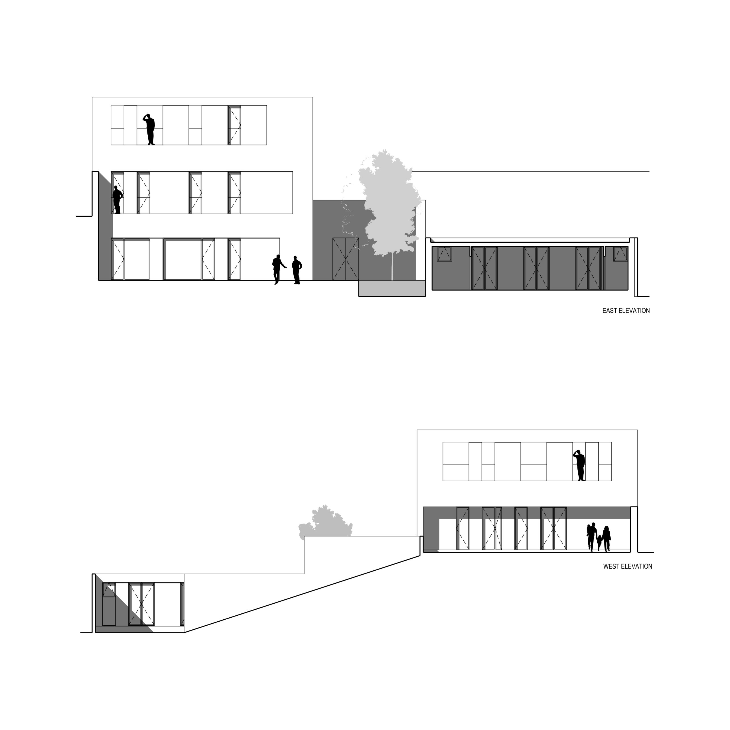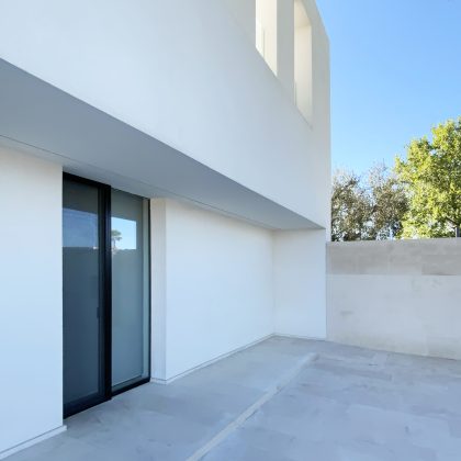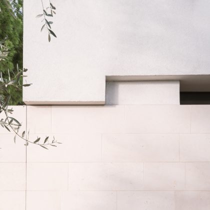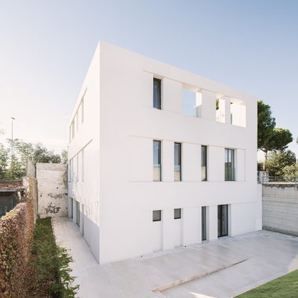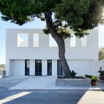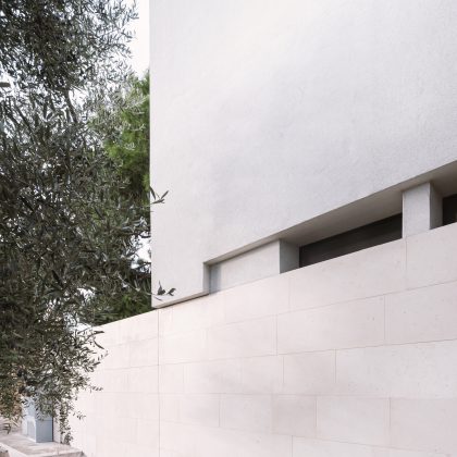 "La costruzione è guidata da una lettura tectonica di matrice framptoniana, in cui la struttura in cemento armato non sovrasta né contraddice la logica continua dell’apparato murario", raccontano i progettisti. La parete monostrato, avvolta da isolamento e intonacata completamente in bianco, restituisce un linguaggio plastico coerente sia nella configurazione volumetrica sia nei dettagli costruttivi. Le aperture verticali, sottili e profonde, incorniciate da serramenti metallici neri, segnano il volume con tagli netti e calibrati.