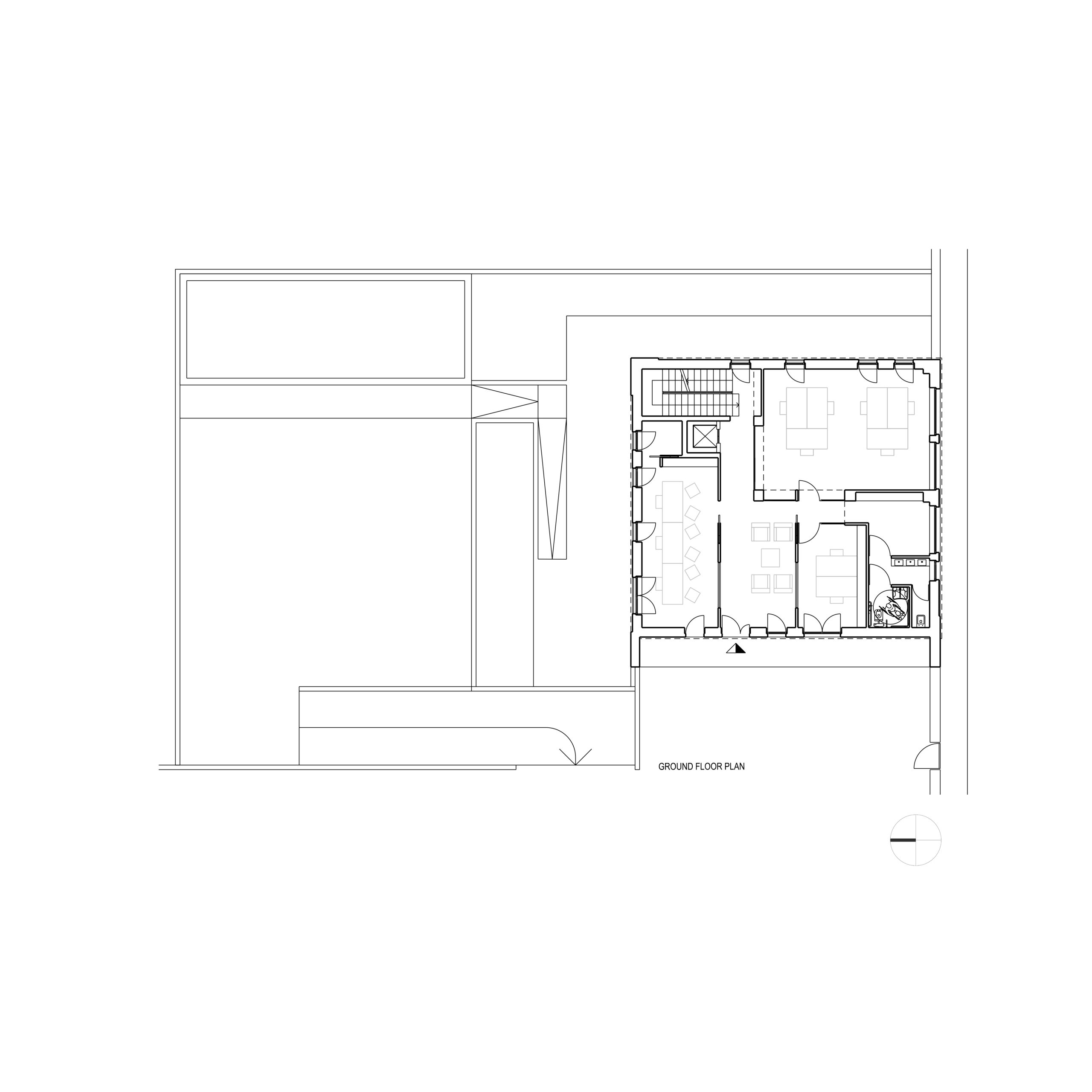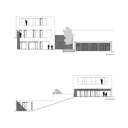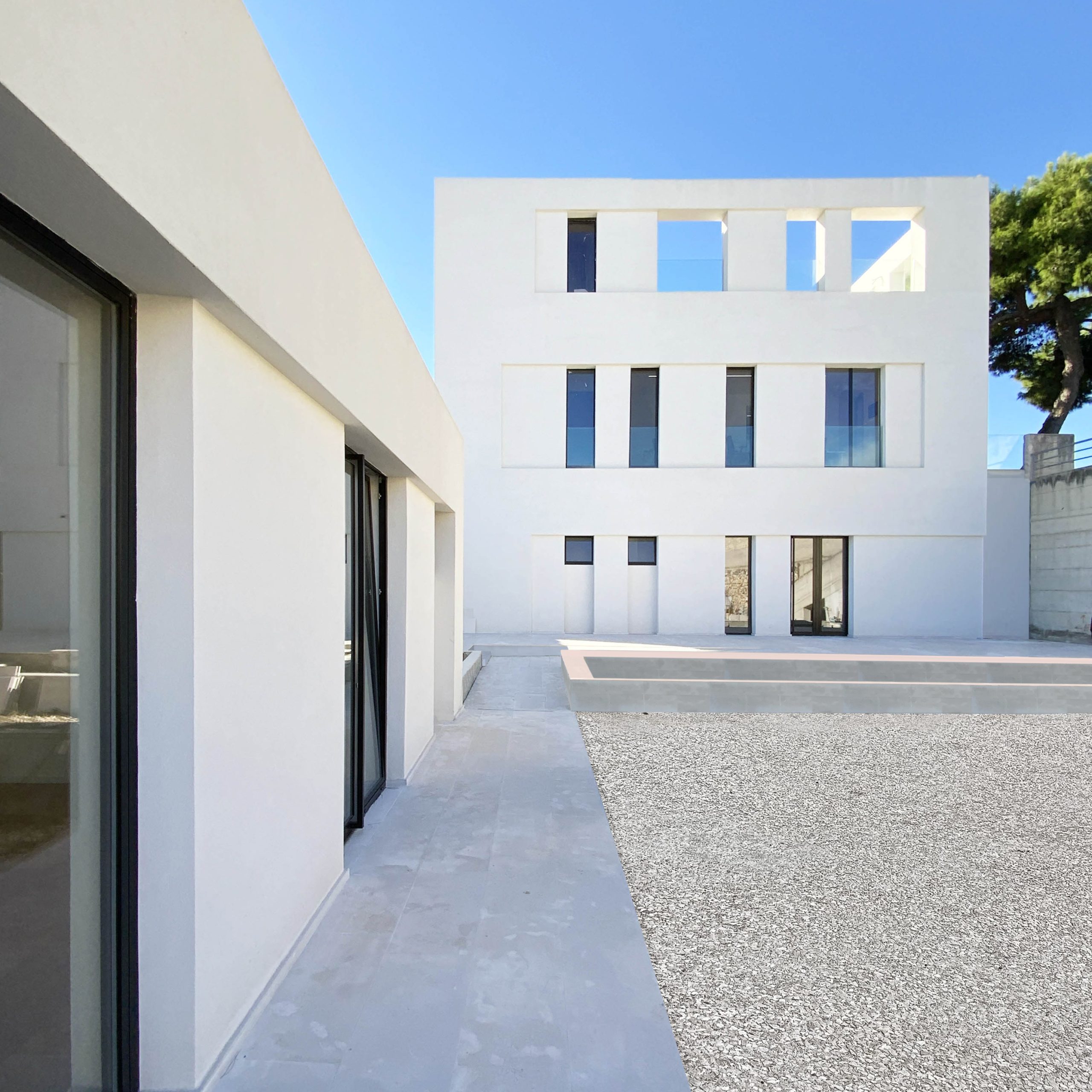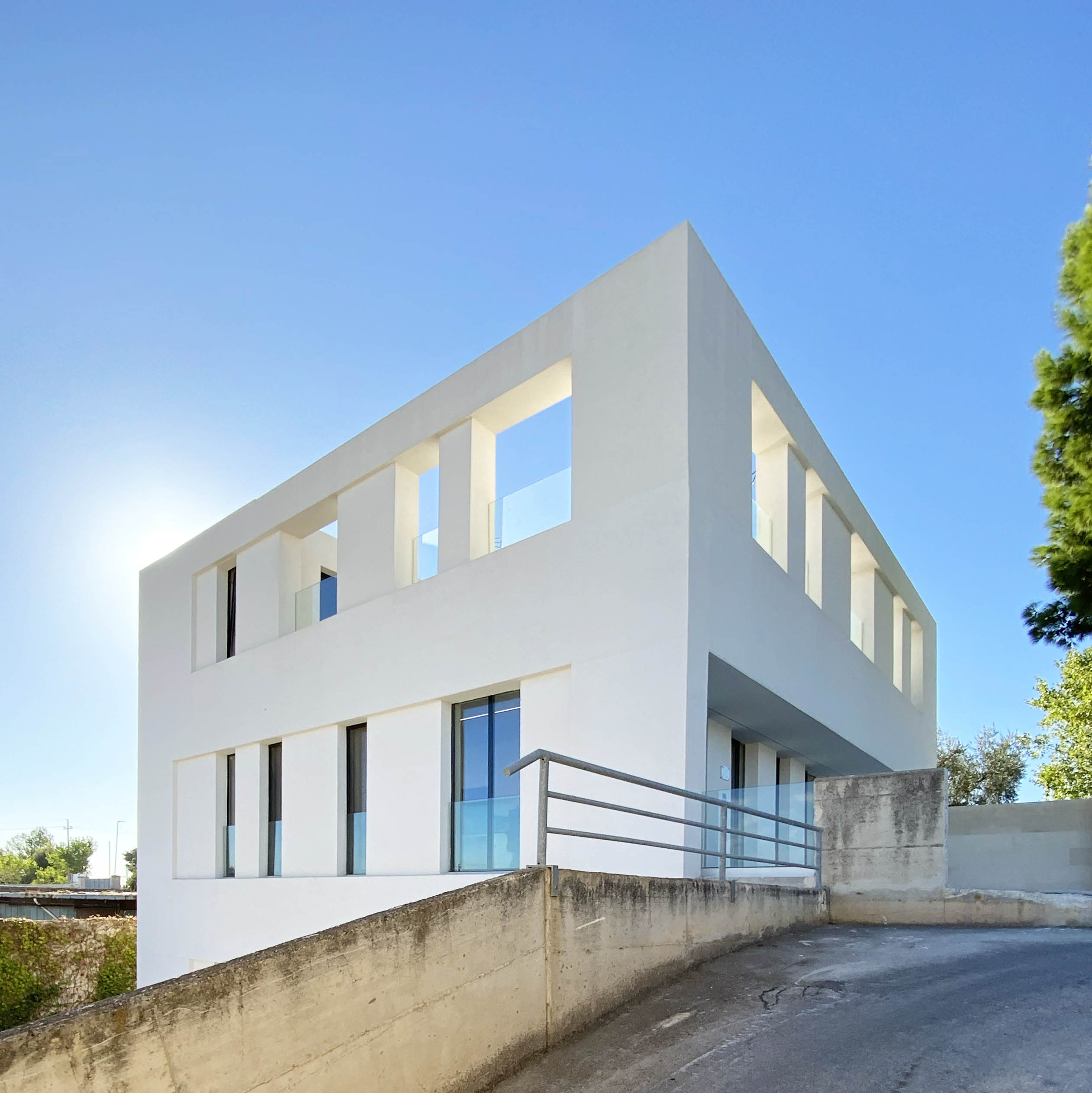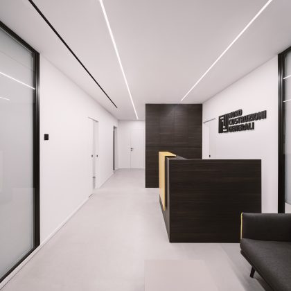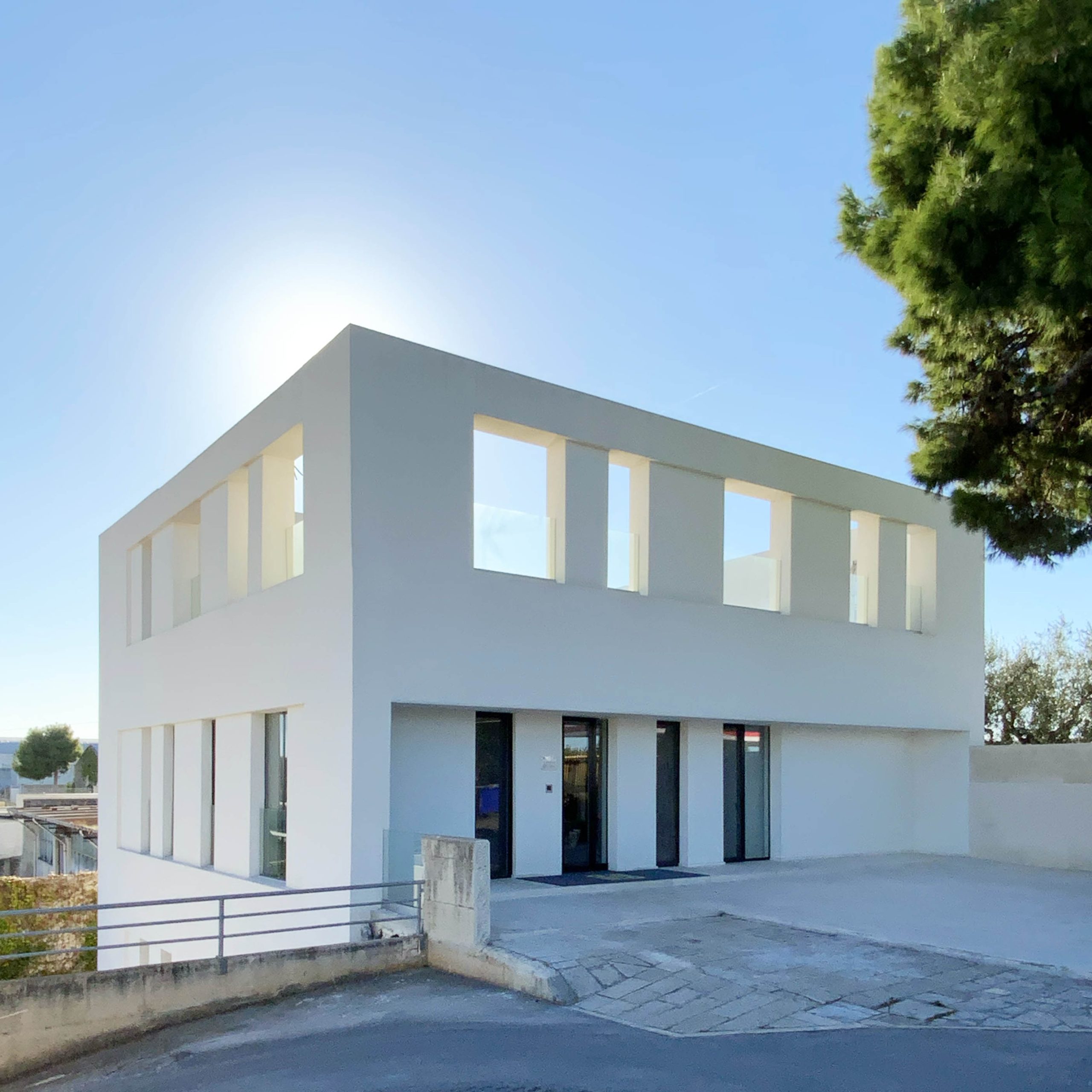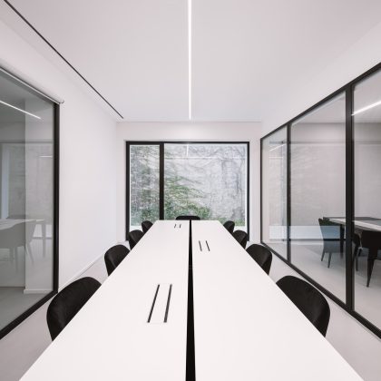 La posizione del lotto, articolato su due quote differenti con un dislivello di circa quattro metri, diventa occasione per generare due spazi di relazione: una piccola piazza d’ingresso parzialmente coperta e, sul lato opposto, un cortile interno paesaggistico, che introduce luce e quiete negli ambienti di lavoro. Verso la strada, un muro in pietra funge da basamento e solleva visivamente il volume bianco, accentuandone la percezione di purezza materica.