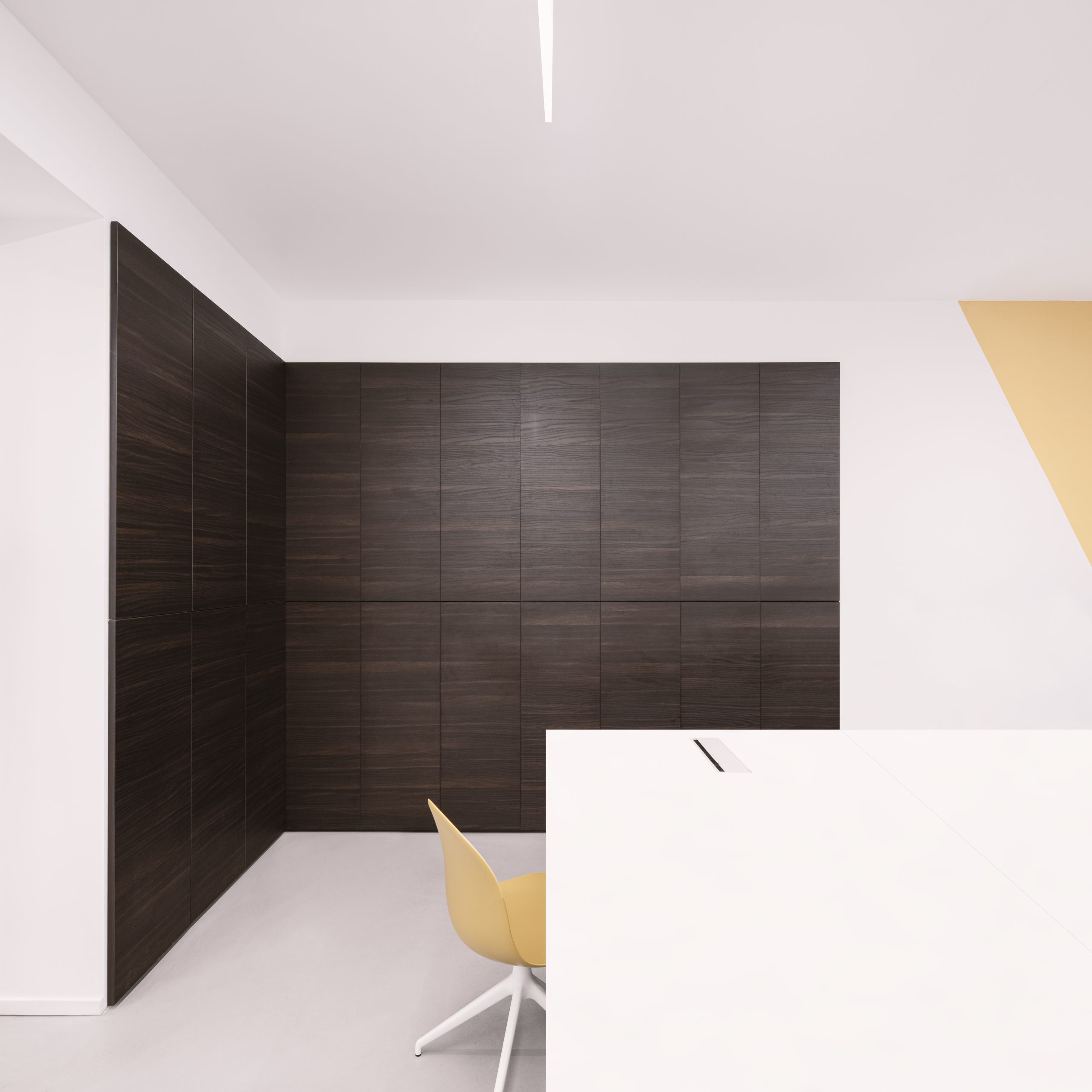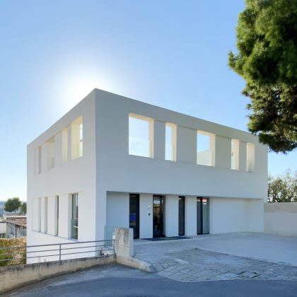Questa scelta monomaterica e la relazione calibrata con il paesaggio naturale richiamano volutamente una condizione mediterranea e rurale, reinterpretata in chiave contemporanea all’interno di un territorio compromesso dalla presenza di industrie. L’edificio diventa così un’architettura silenziosa, essenziale, in grado di generare un microcosmo di concentrazione e qualità spaziale, opponendo misura e densità espressiva alla frammentazione del contesto.