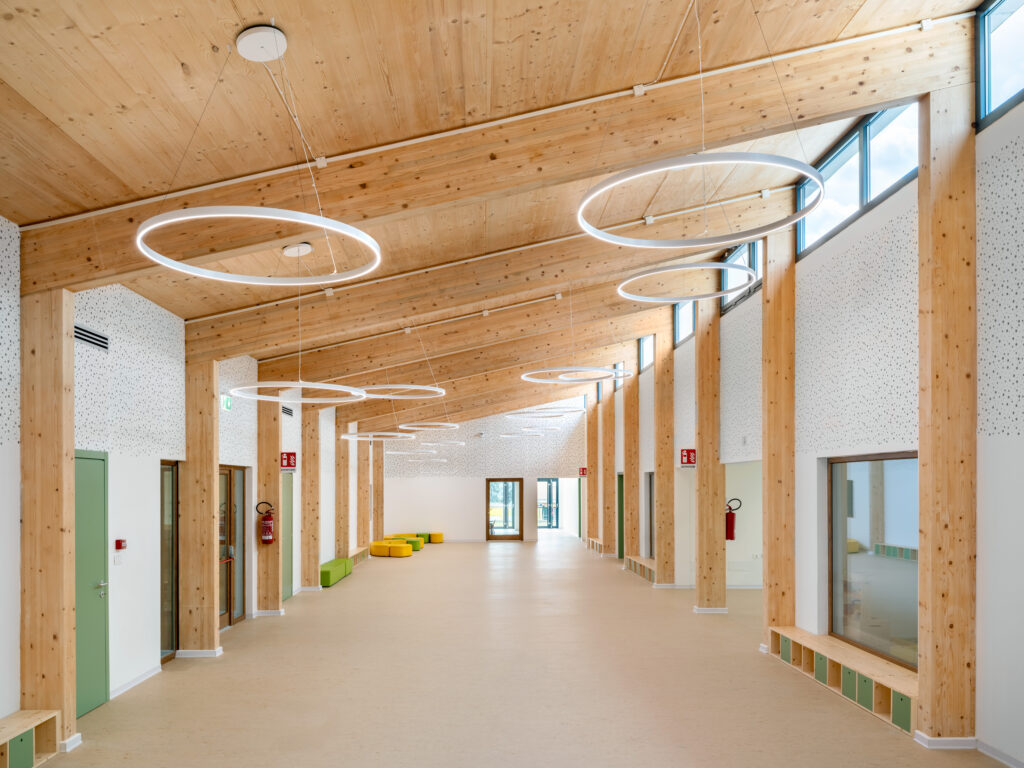 La struttura viene realizzata in legno (tecnologia X-Lam) e presenta caratteristiche energetiche avanzate per superare i requisiti NZeb (Near Zero Energy Building: edificio a consumo di energia quasi zero) richiesti dal PNRR, che è subentrato all’iniziale finanziamento del MIUR, inserendo in corsa una serie di indirizzi che il progetto ha recepito senza problemi.