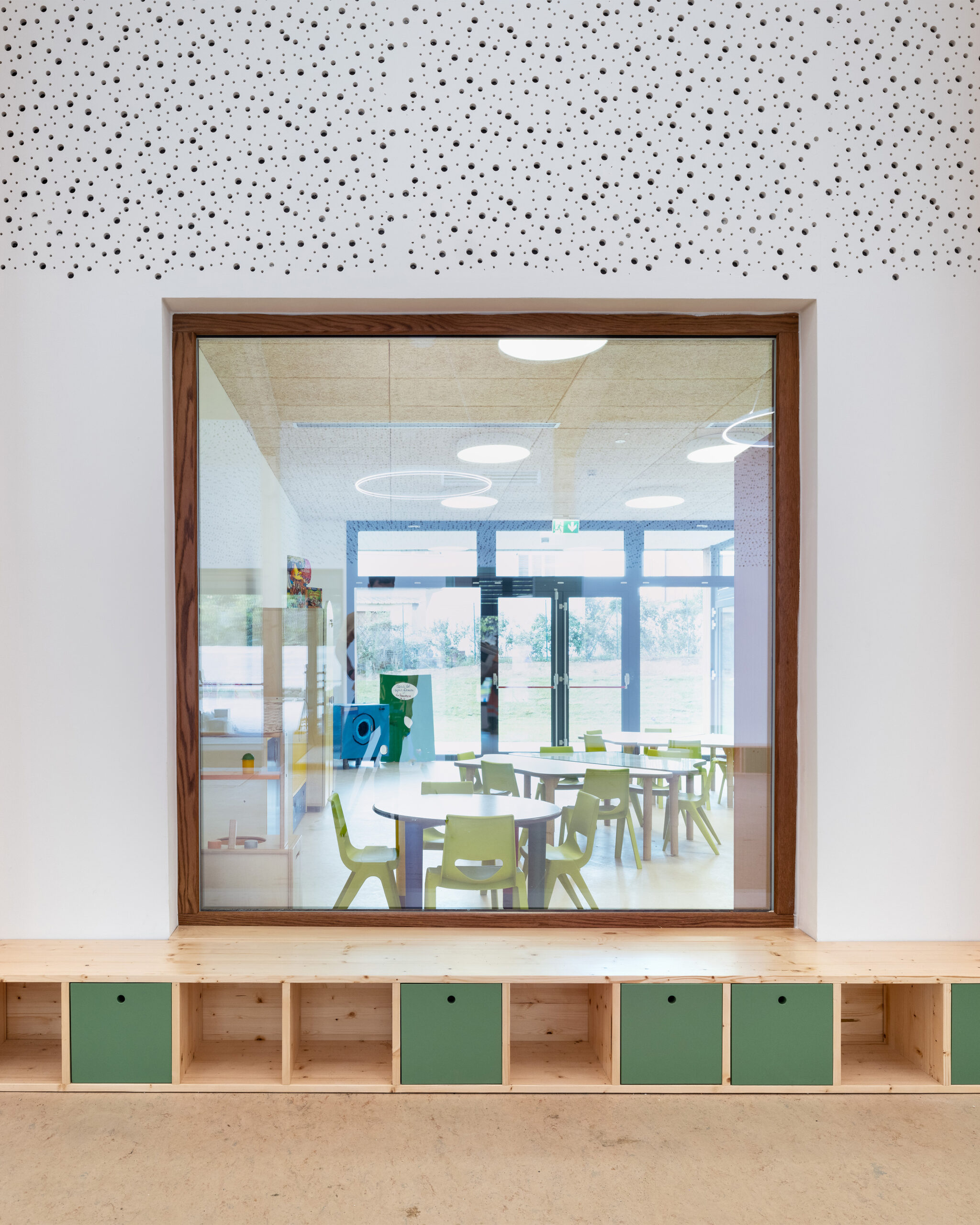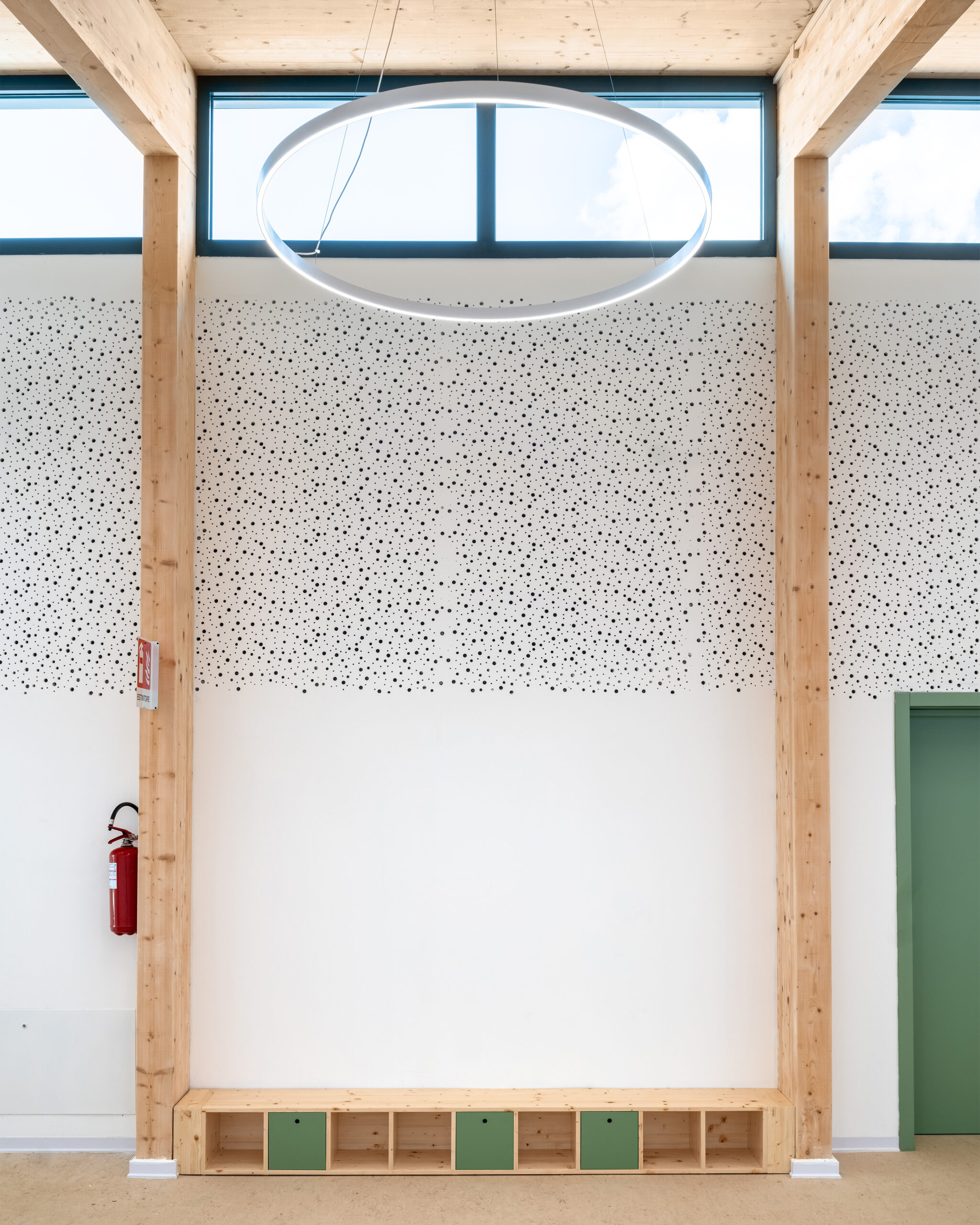 Le sezioni a disposizione sono 4, per complessivi 990 mq di sviluppo, e hanno ampie dimensioni per ospitare fino a 27 alunni cad., per un’accoglienza totale di 108 piccoli fruitori. La pertinenza delle aule si completa con una zona bagno, dotata di parete vetrata verso l’aula, una zona riposo/atelier con duplice funzione in relazione all’orario di utilizzo, infine una loggia utilizzabile nelle stagioni calde per attività all’aperto. Nello stesso blocco si inserisce una stanza per le attività sporchevoli.