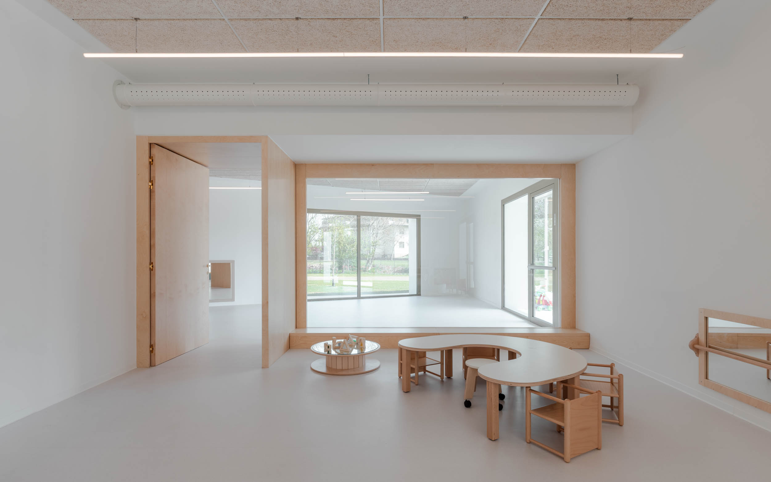 All’interno, il linguaggio architettonico assume una dimensione più intima e materica. Il legno di betulla, impiegato nei serramenti interni e negli arredi integrati, definisce il carattere degli spazi, introducendo una qualità tattile e cromatica che contribuisce a costruire un ambiente domestico e accogliente. Le grandi aperture tra aule e spazio centrale sono incorniciate da imbotti profondi, che si configurano come soglie spaziali abitabili, capaci di ospitare usi informali e momenti di sosta. In questi spessori si articolano micro-ambienti che favoriscono l’interazione spontanea e la costruzione di relazioni.