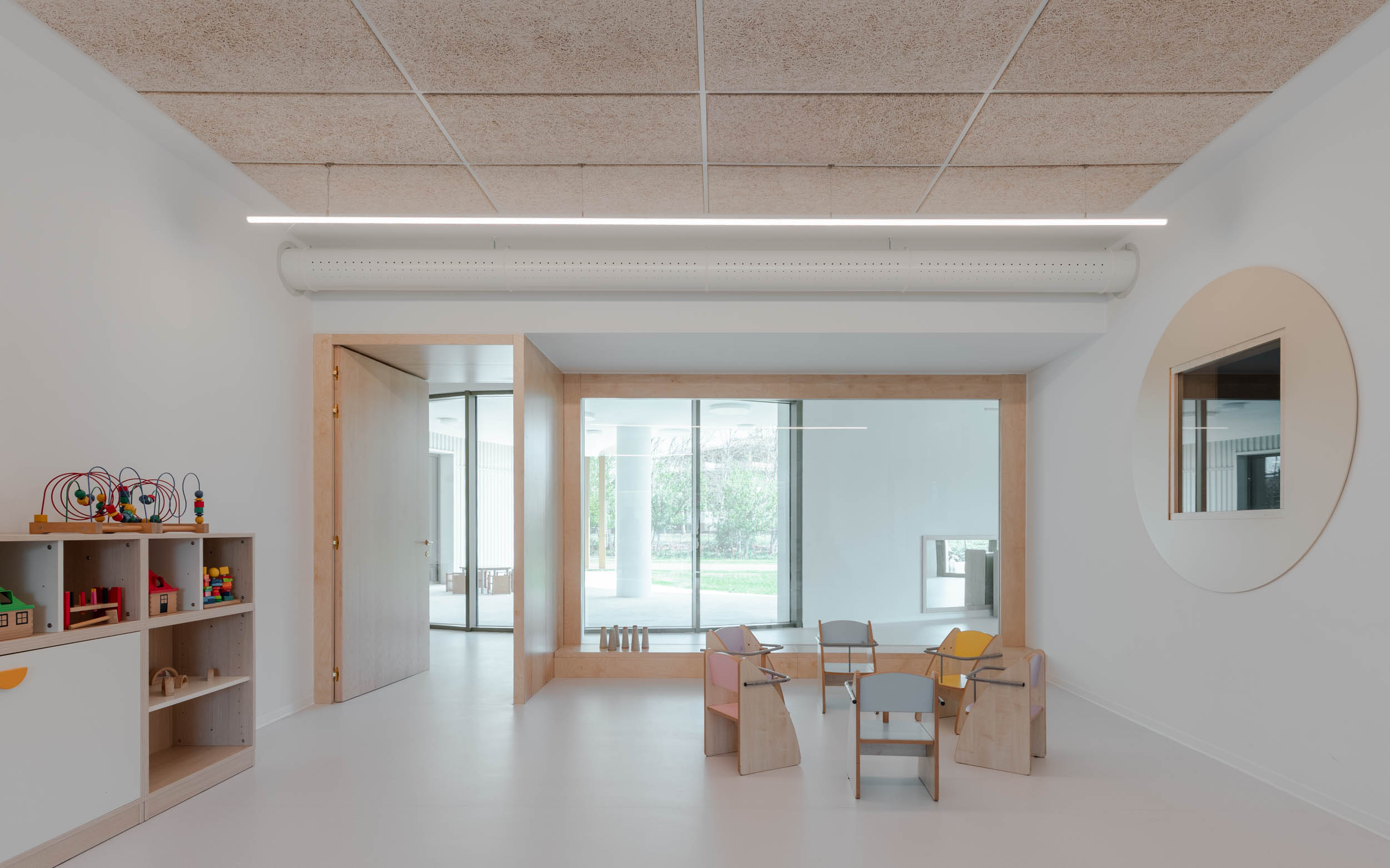 Particolare attenzione è stata riservata alla dimensione acustica, elemento essenziale negli spazi destinati alla prima infanzia. I controsoffitti in pannelli di fibra di legno a vista contribuiscono al controllo del riverbero, definendo condizioni sonore più contenute e confortevoli. La loro texture naturale si integra con gli elementi tecnici dell’illuminazione, costruendo un equilibrio tra prestazione e qualità percettiva.