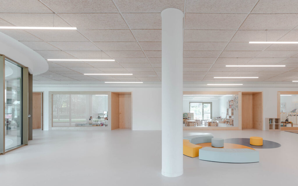 Il cuore dell’edificio è costituito dallo spazio comune centrale, concepito come luogo di relazione e condivisione attorno al quale si organizzano le aule, intese come cellule aperte e permeabili, in un sistema spaziale che supera la logica della compartimentazione tradizionale. La distribuzione degli ambienti abbandona la struttura a corridoio in favore di una spazialità continua, in cui la centralità dello spazio comune diventa elemento ordinatore dell’intero impianto. La permeabilità visiva tra i diversi ambienti, ottenuta mediante ampie superfici vetrate, rafforza questa impostazione, favorendo un costante dialogo tra le attività e contribuendo a costruire un senso diffuso di appartenenza alla comunità educativa.