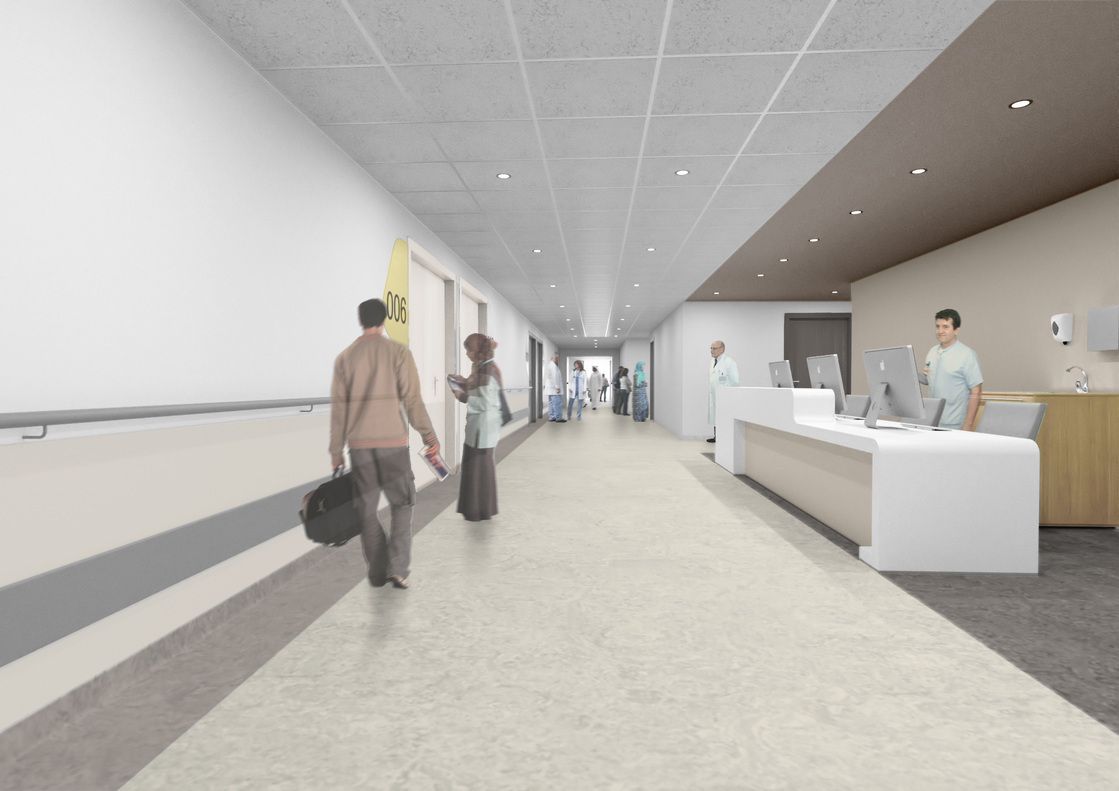 Varcata la soglia, l'atrio si sviluppa come uno spazio a doppia altezza inondato di luce naturale, dove la continuità visiva tra interno ed esterno è totale. Qui trovano posto l’info-point, le aree commerciali e amministrative, con le risalite verticali immerse in isole verdi e sedute che "umanizzano" l'attesa. Da questo snodo parte la Hospital Street: un'ampia spina dorsale distributiva che organizza i flussi e garantisce l'orientamento. Le sue sezioni generose e l'illuminazione uniforme sono studiate per annullare la percezione di anonimato tipica dei corridoi ospedalieri, trasformando il percorso in un luogo di relazione.