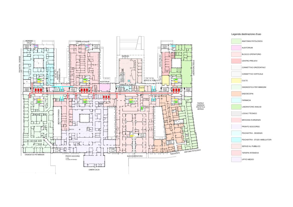 L'edificio si articola su quattro livelli fuori terra, un piano semi-interrato e una copertura tecnica, per un totale di circa 70.000 m² ospedalieri su un lotto di 145.000 m². Lo schema funzionale adottato si basa sul modello per intensità di cura e consente un’organizzazione semplice, flessibile e immediatamente riconoscibile. La concentrazione delle funzioni di emergenza-urgenza su un unico livello garantisce risposte rapide e coordinate alle situazioni critiche, mentre la chiara vocazione funzionale di ciascun piano facilita l’orientamento di pazienti e visitatori. L’impianto complessivo assicura la corretta separazione dei flussi e il rispetto delle adiacenze funzionali, ponendo al centro del progetto l’efficienza operativa e la qualità spaziale.