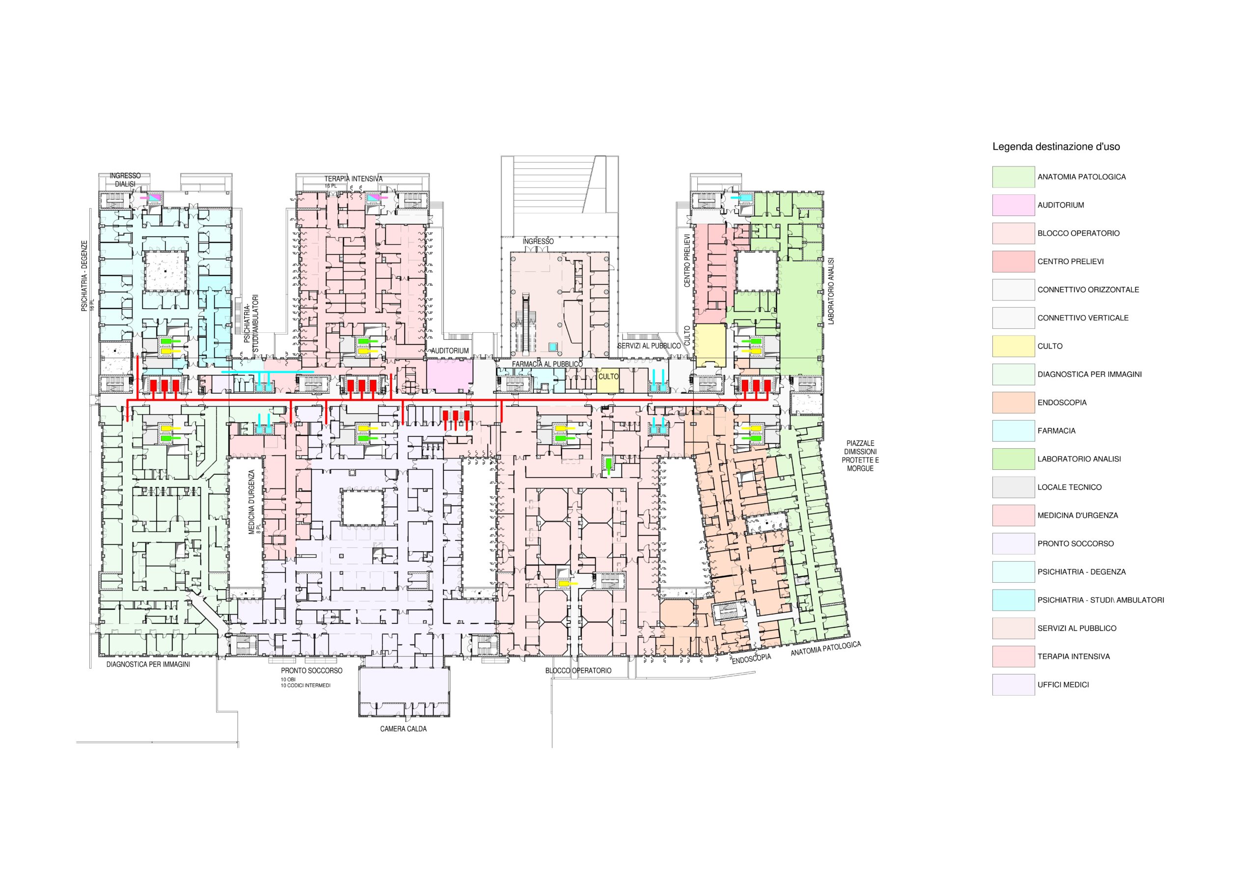 Il dimensionamento funzionale prevede un totale di 390 posti letto, incluse le degenze per isolamento infettivologico. Le aree cliniche sono strutturate per intensità di cura: