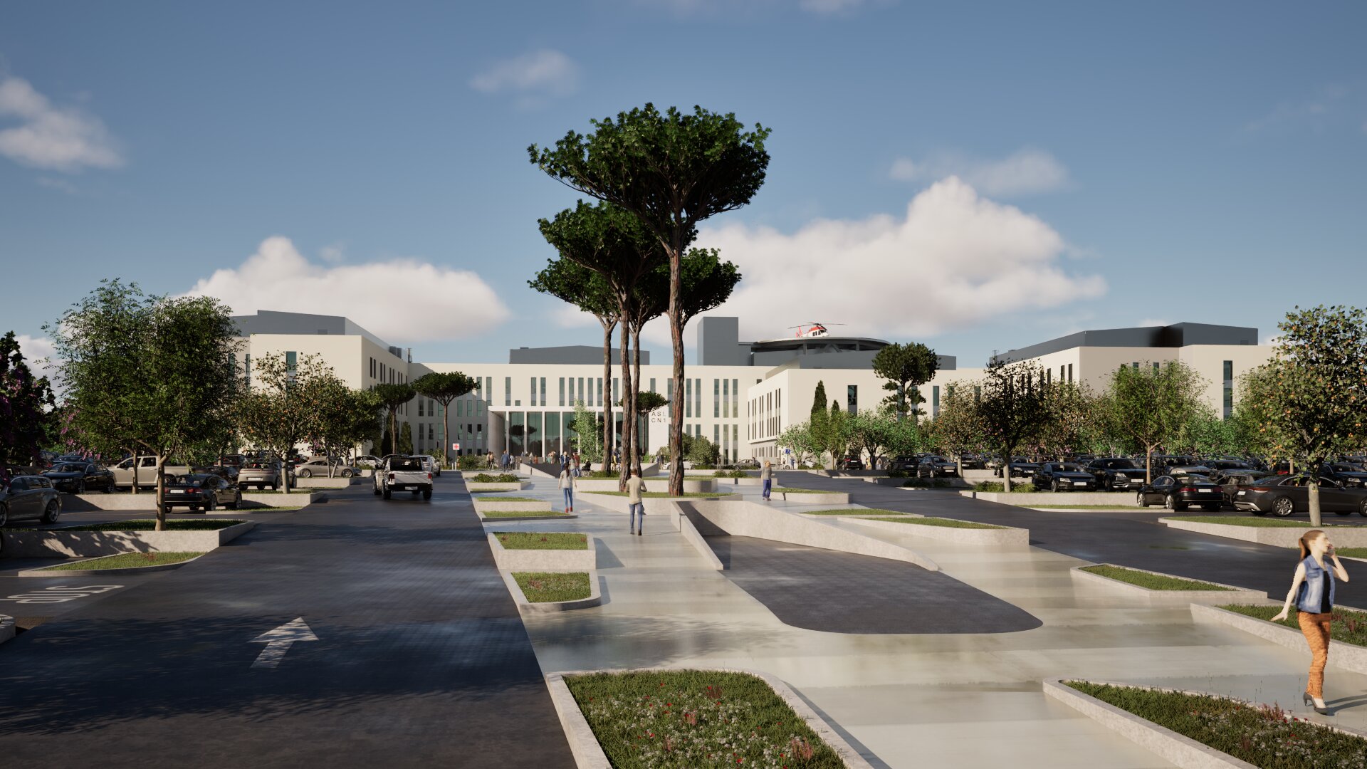 Il progetto è firmato da un Raggruppamento Temporaneo di Progettisti (RTP) guidato da Studio Altieri S.p.A. e composto da Deerns Italia, ICONIA Ingegneria Civile, Planéta Stúdió, TRT Trasporti e Territorio e Monica Botta. Questo team multidisciplinare ha lavorato per integrare le complesse esigenze cliniche con un’architettura che cura, rispondendo ai Criteri Ambientali Minimi (CAM) e garantendo alte prestazioni energetiche.L'approccio al progetto inizia ben prima dell'ingresso in reparto. La complessità dell'intervento ha richiesto un masterplan unitario dove il disegno del paesaggio assume un ruolo strutturante, trasformando l'area in un grande parco pubblico attrezzato. L'insediamento mitiga il suo impatto attraverso un sistema continuo di dune verdi anti rumore e bacini di laminazione, che dialogano con i percorsi ciclo-pedonali e le aree di sosta. Il sistema dei parcheggi, che prevede 875 posti auto (espandibili a 1.150) è integrato nel verde per ridurne l'impatto visivo. Avvicinandosi al cuore del complesso, il sistema ospedaliero si rivela come un’architettura aperta e riconoscibile. L'edificio dell'accoglienza è concepito come un landmark urbano: sollevato su un podio rispetto alla piazza pubblica, accoglie i visitatori attraverso una scalinata monumentale che conduce a un colonnato e, infine, alla grande facciata vetrata a doppia altezza. Per garantire la massima accessibilità senza sacrificare la coerenza formale, una rampa è stata integrata nel disegno del podio. Alcune funzioni ad alta frequenza, come il centro prelievi e i poliambulatori, sono accessibili direttamente dalla piazza, vitalizzando lo spazio pubblico.