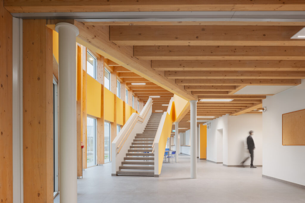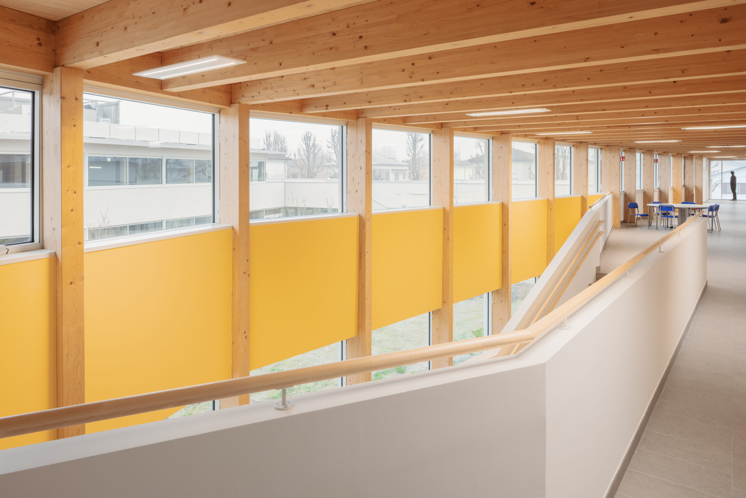 L’intero progetto è stato pensato per superare il modello tradizionale di scuola, privilegiando ambienti aperti, dinamici e adattabili alle diverse modalità di apprendimento. Gli spazi sono realizzati all’insegna dell’innovazione e della didattica. Le aule, ampliabili grazie a pareti mobili, dialogano con zone di relazione sempre fruibili mentre una grande corte-giardino interna, garantisce luce naturale, benessere e continuità tra attività didattiche e vita all’aria aperta.