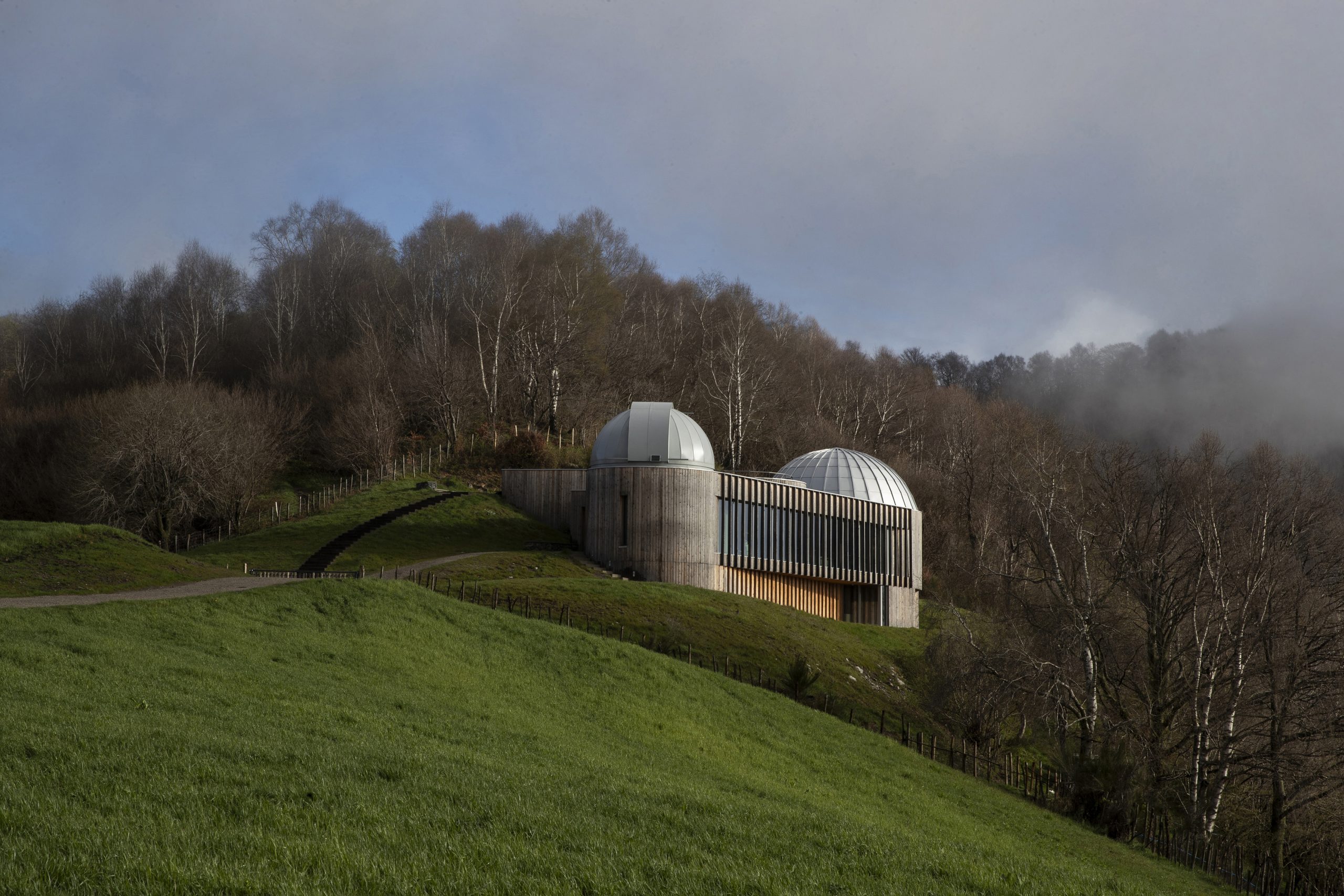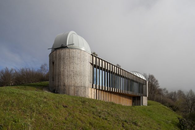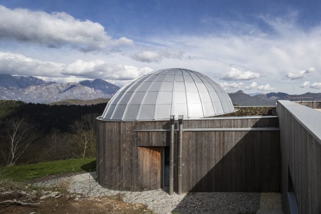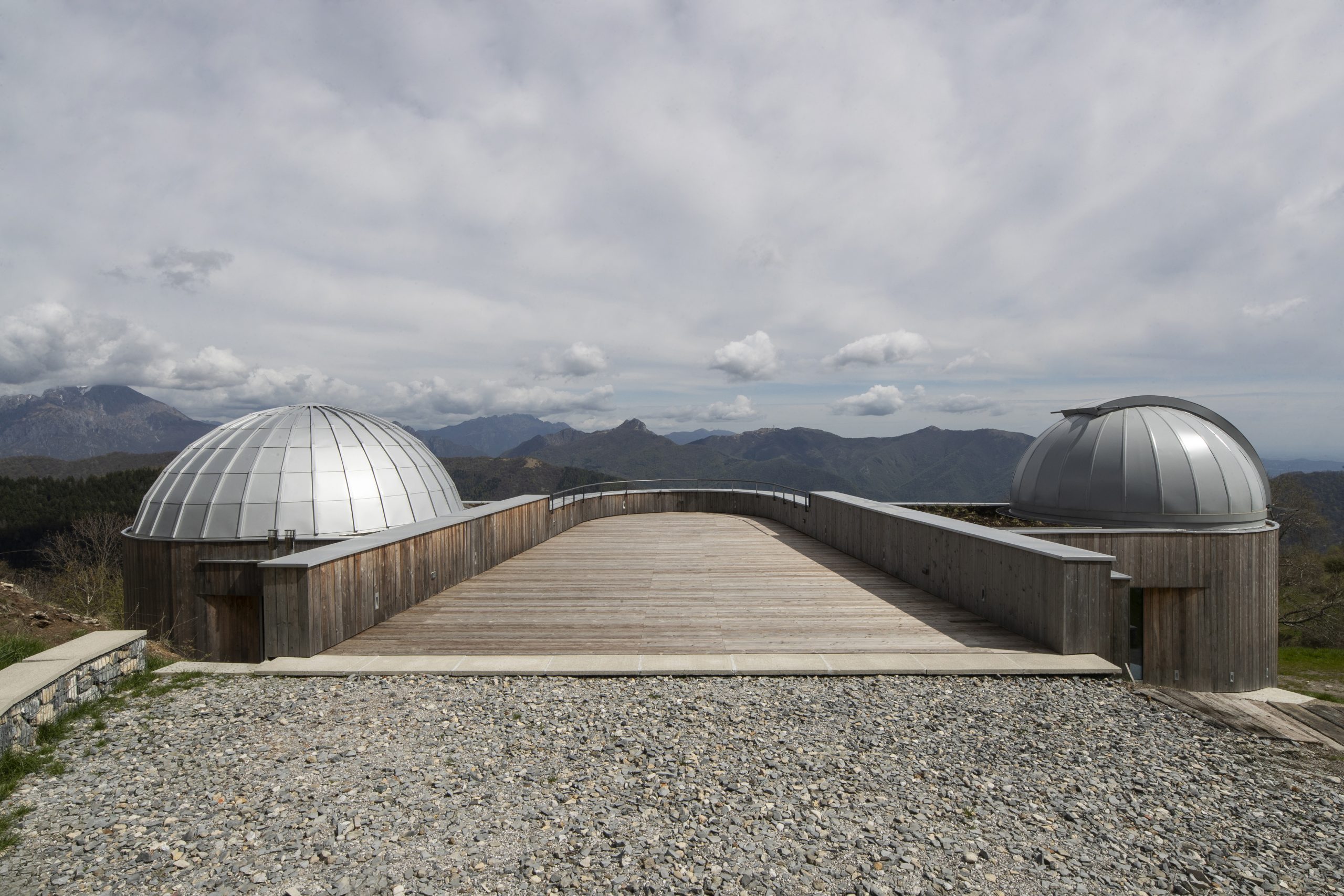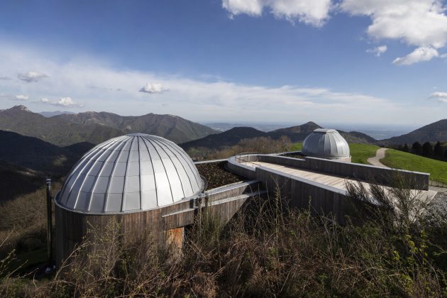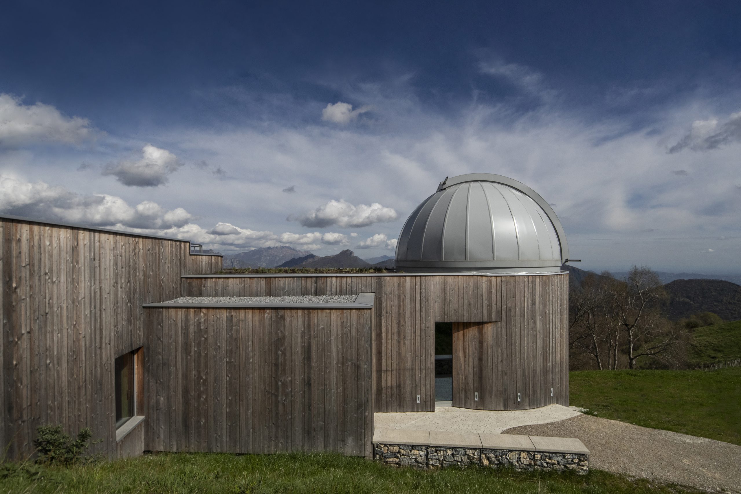 Tra le due cupole, sopra la copertura a verde, si sviluppa un belvedere che consente osservazioni notturne riparate dalle luci provenienti dalle aree sottostanti. L’intero progetto ricerca continuità con il contesto attraverso materiali e cromie: il volume emergente è costruito in X-Lam su un basamento in cemento armato gettato con casseri di larice, e rivestito da tavole verticali dello stesso legno, destinate a ingrigire nel tempo avvicinandosi ai toni delle staccionate e del bosco circostante. La stratigrafia dell’involucro, unita ai serramenti con triplo vetro e ai sistemi impiantistici interamente elettrici alimentati da pompa di calore, consente prestazioni energetiche elevate. L’edificio si articola su due livelli: al piano terra l’accoglienza e le sale per le attività pubbliche, al piano seminterrato i locali di servizio, una biblioteca e gli spazi per il personale. La terrazza panoramica, estesa sul tetto giardino, potrà essere utilizzata anche per eventi all’aperto. La realizzazione è stata resa possibile grazie al progetto transfrontaliero Astronetilo, presentato nel 2018 nell’ambito del programma Interreg Italia–Svizzera e successivamente finanziato grazie alla disponibilità di risorse residue. Dopo l’approvazione del progetto esecutivo nel 2020 e l’affidamento dei lavori nello stesso anno, il cantiere ha risentito delle difficoltà legate alla pandemia e dell’aumento dei costi edilizi dovuto al superbonus 110%, con un conseguente prolungamento dei tempi fino al 2024. La nuova struttura fungerà da polo didattico-scientifico per il territorio, capace di accogliere un numero crescente di visitatori, mentre il vecchio osservatorio verrà riconvertito a osservatorio solare. L’apertura straordinaria del cantiere durante le giornate FAI di primavera ha mostrato l’interesse del pubblico verso un intervento che mira a coniugare ricerca scientifica, tutela del paesaggio e un approccio costruttivo attento alla relazione con il luogo.