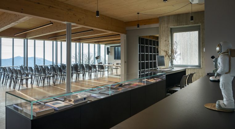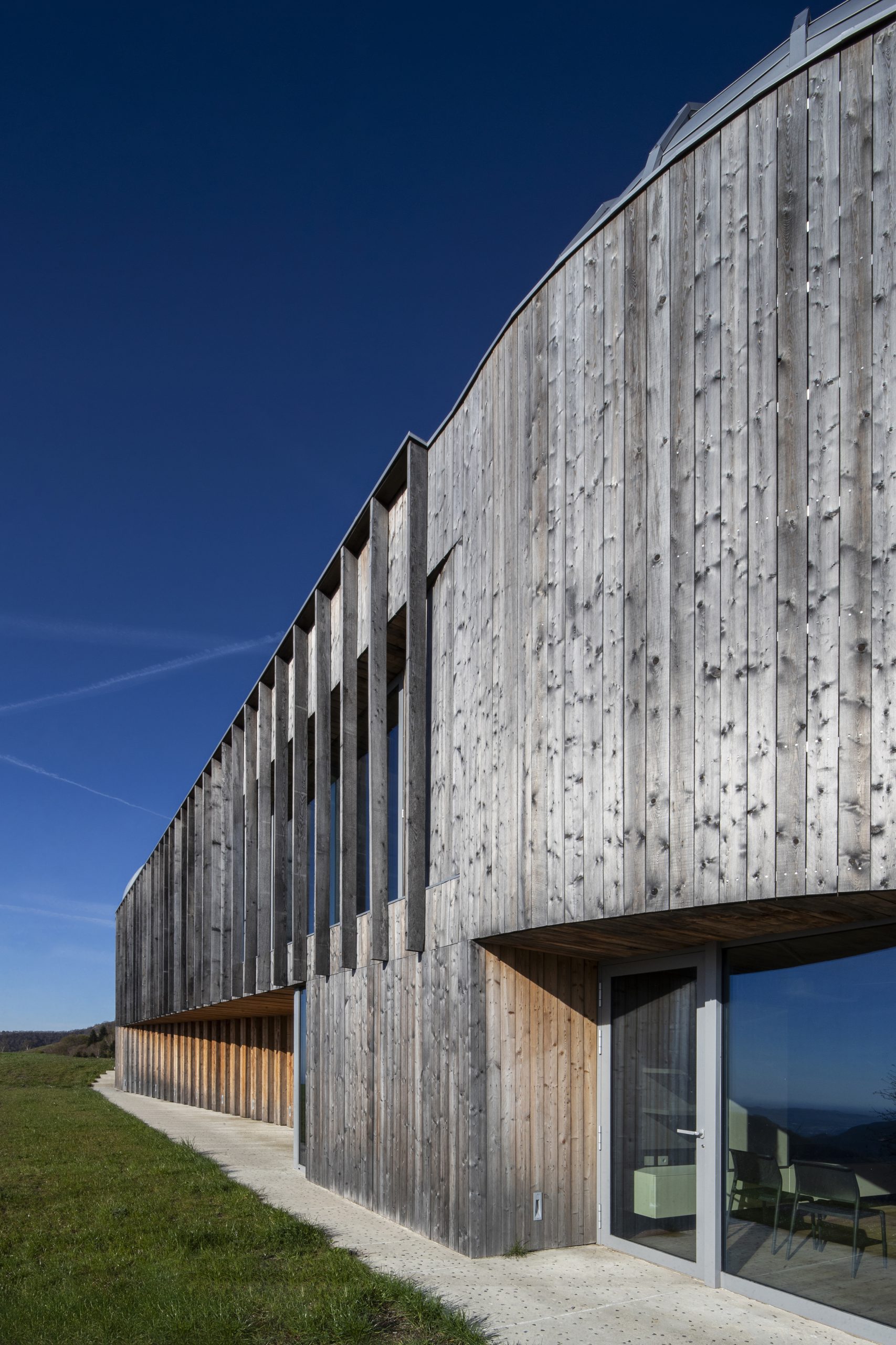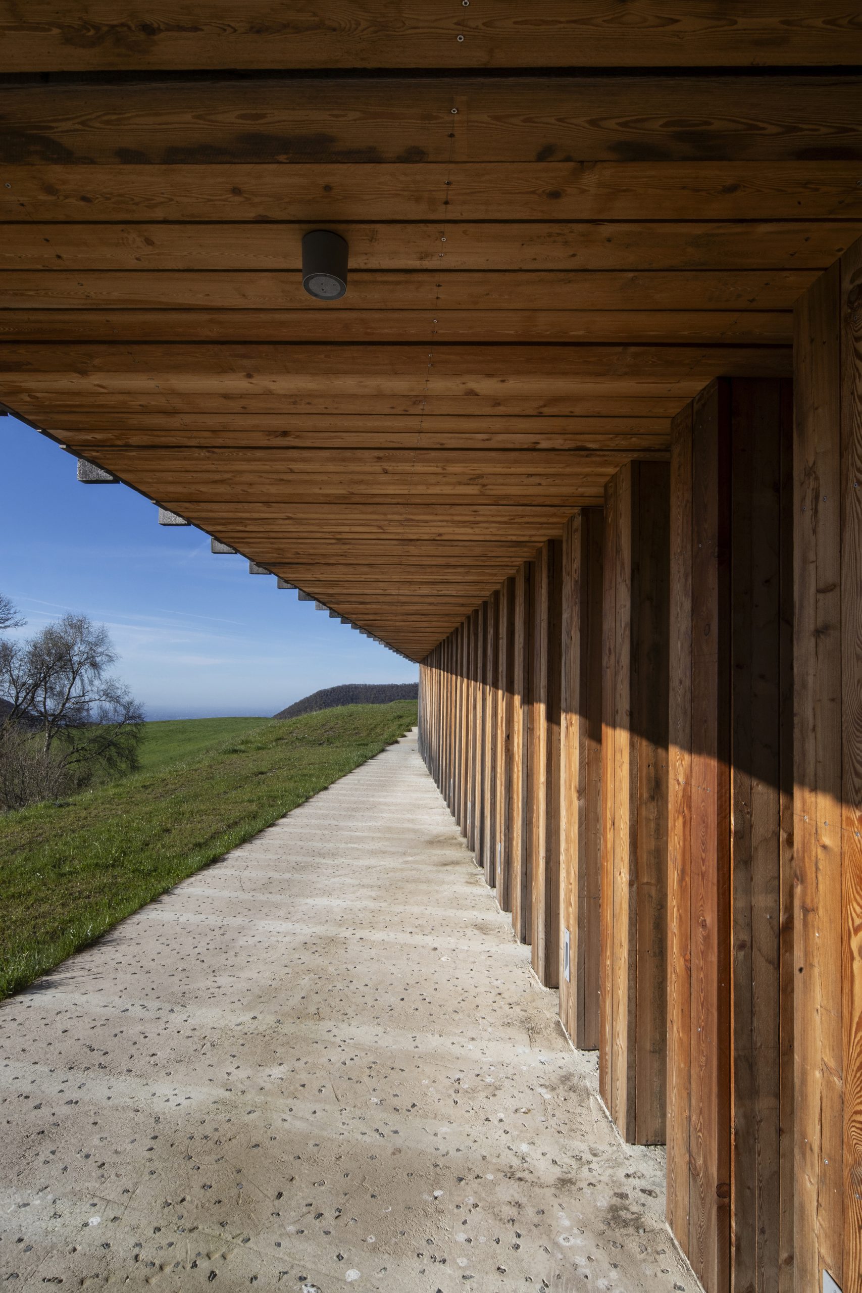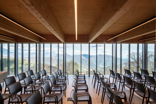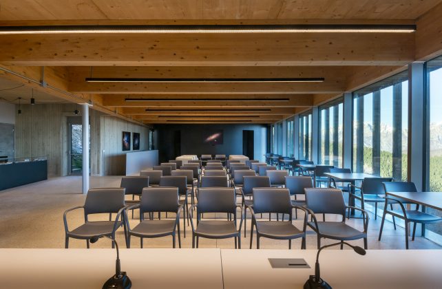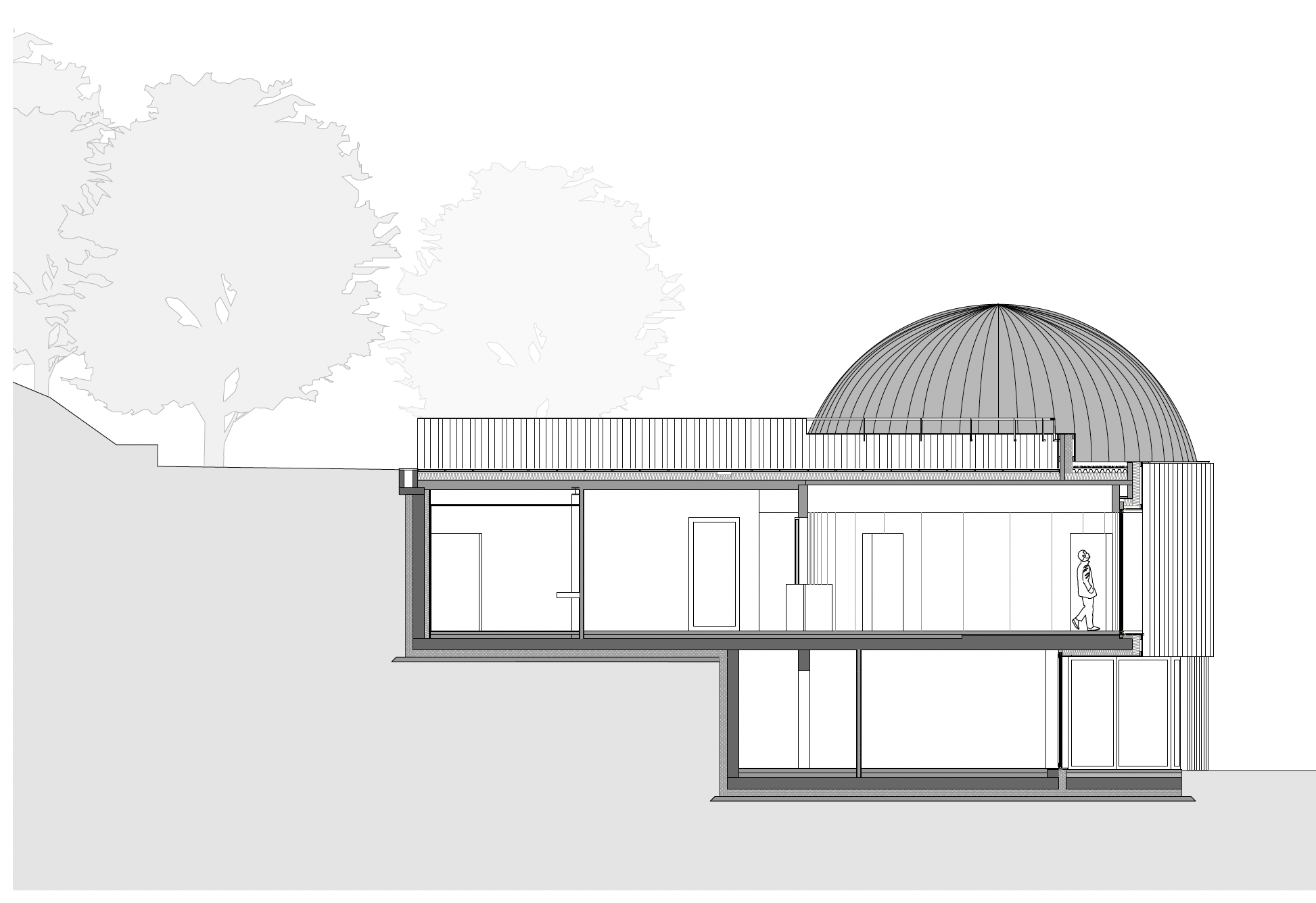 Tra le due cupole, sopra la copertura a verde, si sviluppa un belvedere che consente osservazioni notturne riparate dalle luci provenienti dalle aree sottostanti. L’intero progetto ricerca continuità con il contesto attraverso materiali e cromie: il volume emergente è costruito in X-Lam su un basamento in cemento armato gettato con casseri di larice, e rivestito da tavole verticali dello stesso legno, destinate a ingrigire nel tempo avvicinandosi ai toni delle staccionate e del bosco circostante. La stratigrafia dell’involucro, unita ai serramenti con triplo vetro e ai sistemi impiantistici interamente elettrici alimentati da pompa di calore, consente prestazioni energetiche elevate. L’edificio si articola su due livelli: al piano terra l’accoglienza e le sale per le attività pubbliche, al piano seminterrato i locali di servizio, una biblioteca e gli spazi per il personale. La terrazza panoramica, estesa sul tetto giardino, potrà essere utilizzata anche per eventi all’aperto. La realizzazione è stata resa possibile grazie al progetto transfrontaliero Astronetilo, presentato nel 2018 nell’ambito del programma Interreg Italia–Svizzera e successivamente finanziato grazie alla disponibilità di risorse residue. Dopo l’approvazione del progetto esecutivo nel 2020 e l’affidamento dei lavori nello stesso anno, il cantiere ha risentito delle difficoltà legate alla pandemia e dell’aumento dei costi edilizi dovuto al superbonus 110%, con un conseguente prolungamento dei tempi fino al 2024. La nuova struttura fungerà da polo didattico-scientifico per il territorio, capace di accogliere un numero crescente di visitatori, mentre il vecchio osservatorio verrà riconvertito a osservatorio solare. L’apertura straordinaria del cantiere durante le giornate FAI di primavera ha mostrato l’interesse del pubblico verso un intervento che mira a coniugare ricerca scientifica, tutela del paesaggio e un approccio costruttivo attento alla relazione con il luogo.