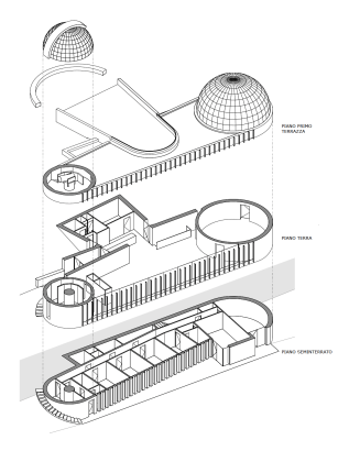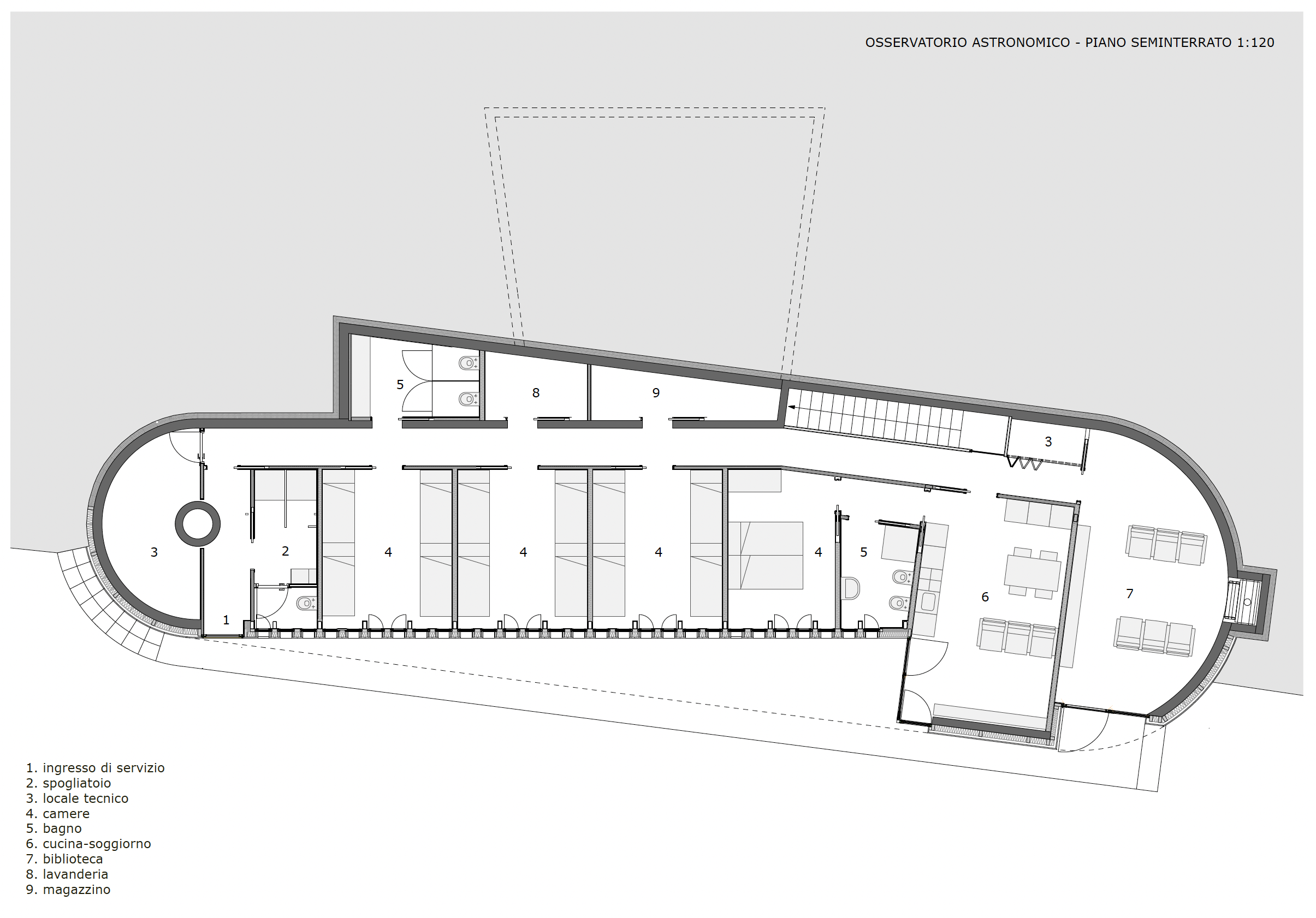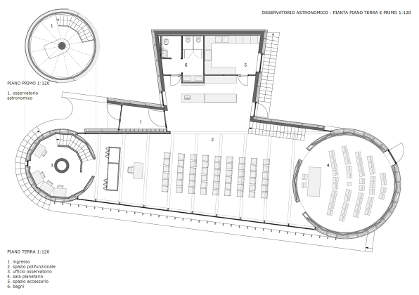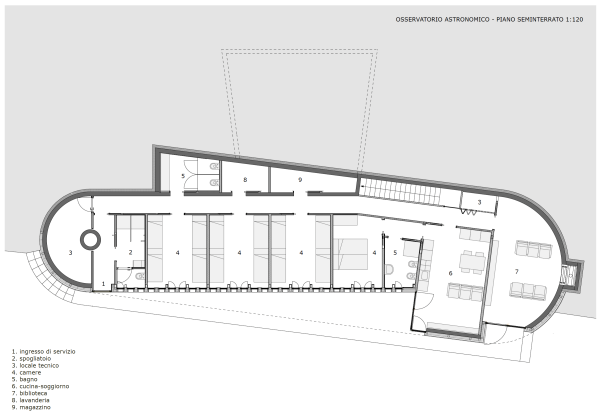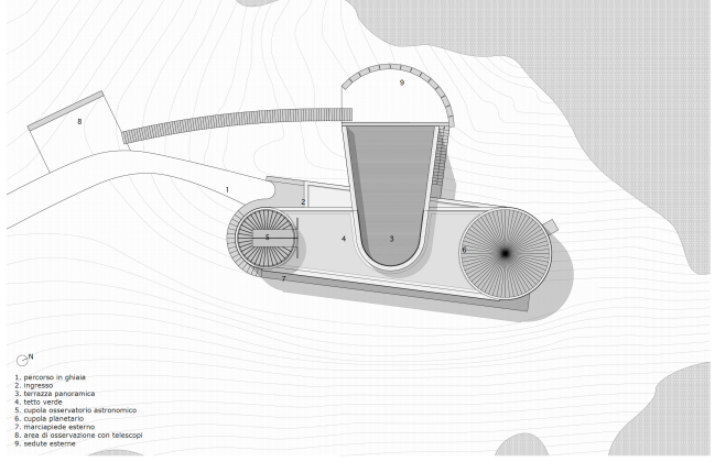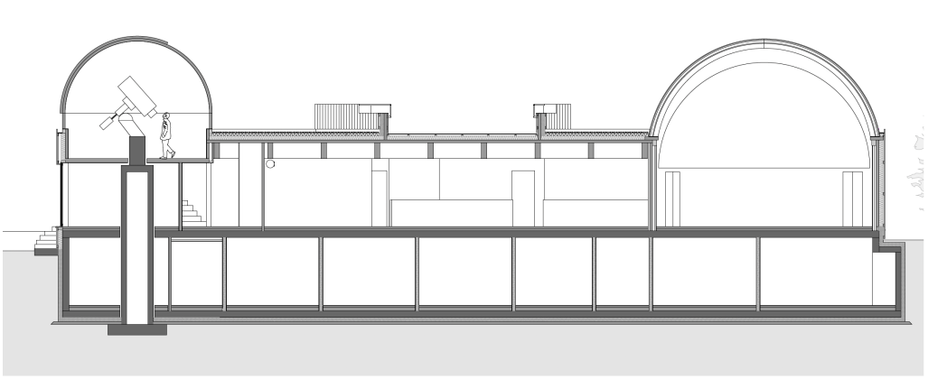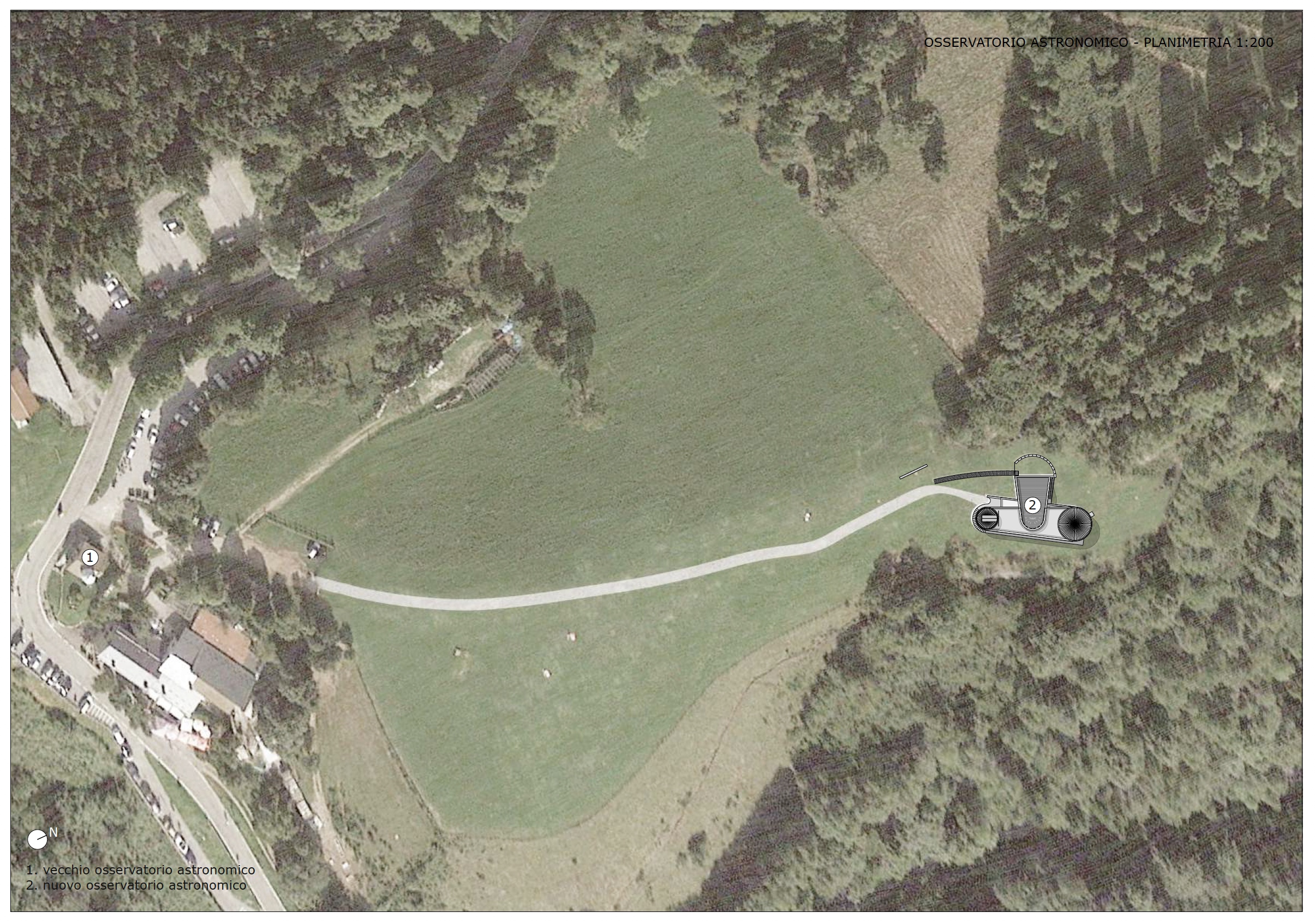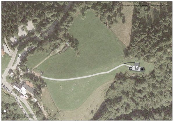 L’impostazione planimetrica impostata dall'architetto Marco Castelletti nasce dall’orografia, dalla presenza del bosco e dall’esposizione rispetto alla volta celeste: l’edificio si dispone parallelamente alle curve di livello, mantenendo entrambi i piani affacciati a valle e risultando parzialmente interrato così da ridurre l’impatto paesaggistico e integrarsi nel pendio. L’asse principale sud-nord ordina le due funzioni principali, osservatorio e planetario, identificabili dalle rispettive cupole poste alle estremità. La cupola dell’osservatorio, più esposta e avanzata, è orientata per garantire una visione ottimale dell’arco sud-orientale del cielo; quella del planetario, più ampia, si colloca invece in posizione arretrata, meno visibile dai percorsi di salita. Questa scelta insediativa riduce la percezione dell’intervento da parte di chi risale dalla Colma e tutela le aree prative più frequentate dai visitatori estivi, concentrando il nuovo volume sul versante orientale, in una relazione diretta con il paesaggio montano.